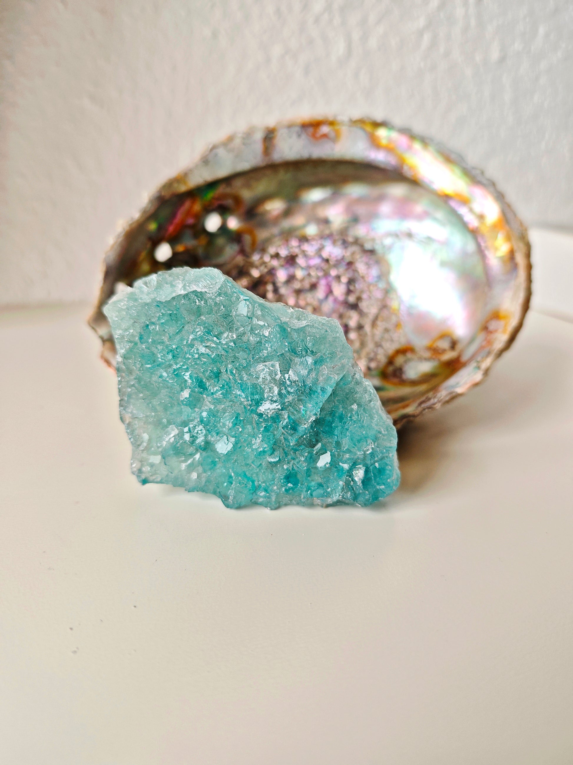 Dieser außergewöhnliche Fluorit aus dem Dongpo Ore Field besticht durch seine intensiven türkis- bis meeresblauen Farbtöne, die je nach Lichteinfall variieren. Teilweise ist er von feinem Calcit begleitet, der einen spannenden Kontrast zur klaren, frischen Farbgebung bildet.