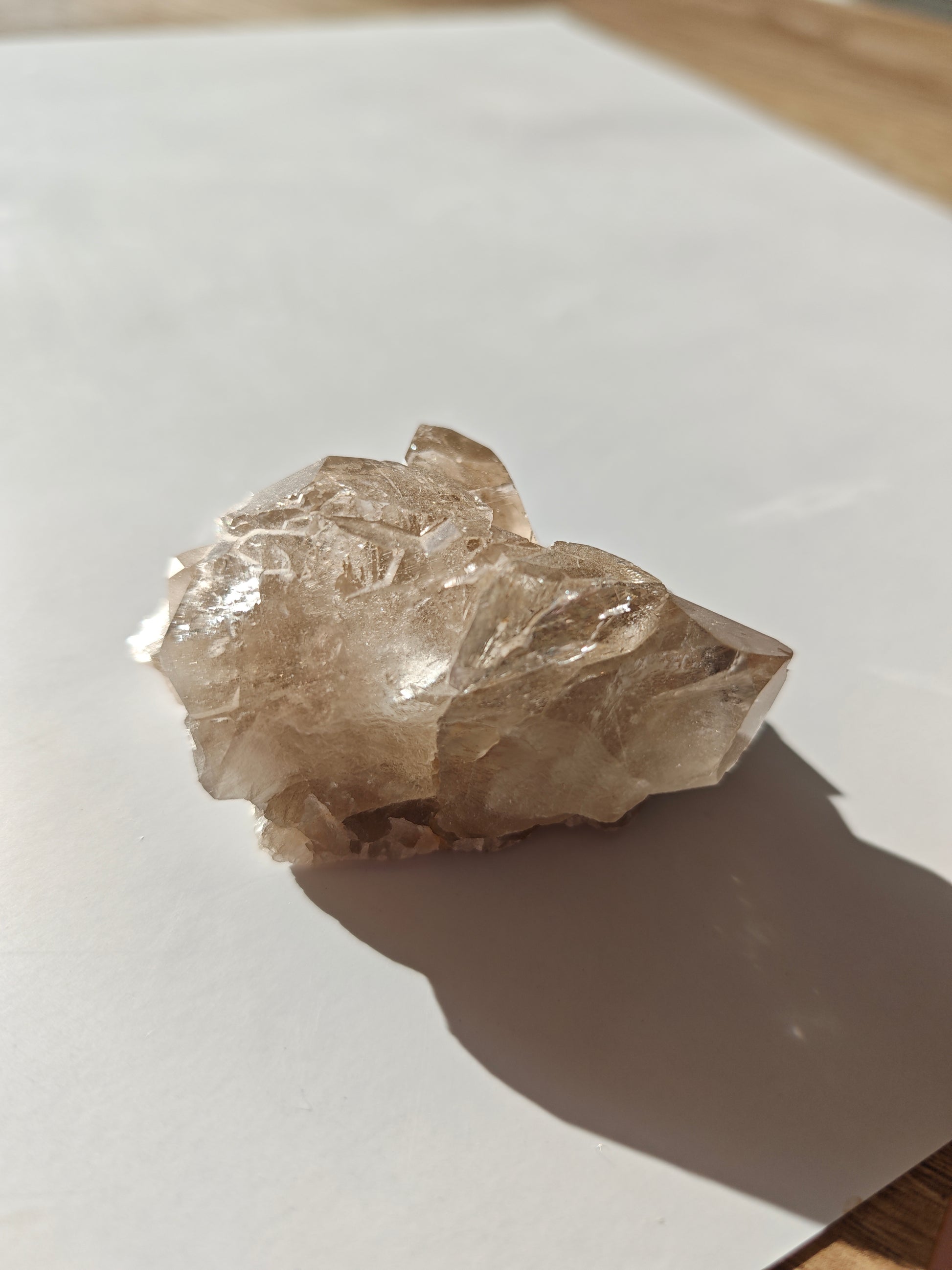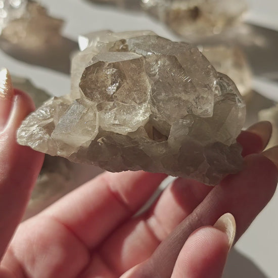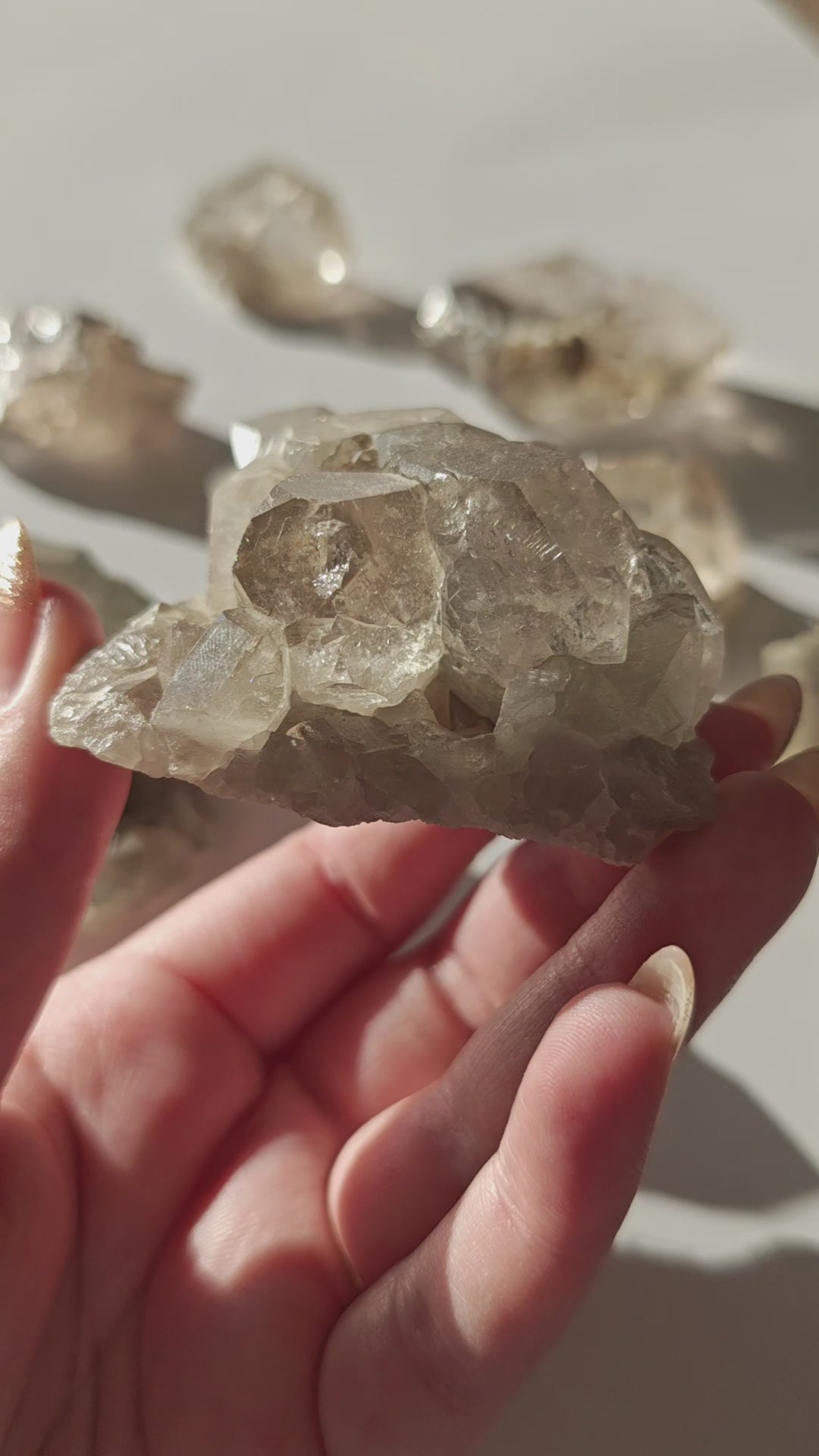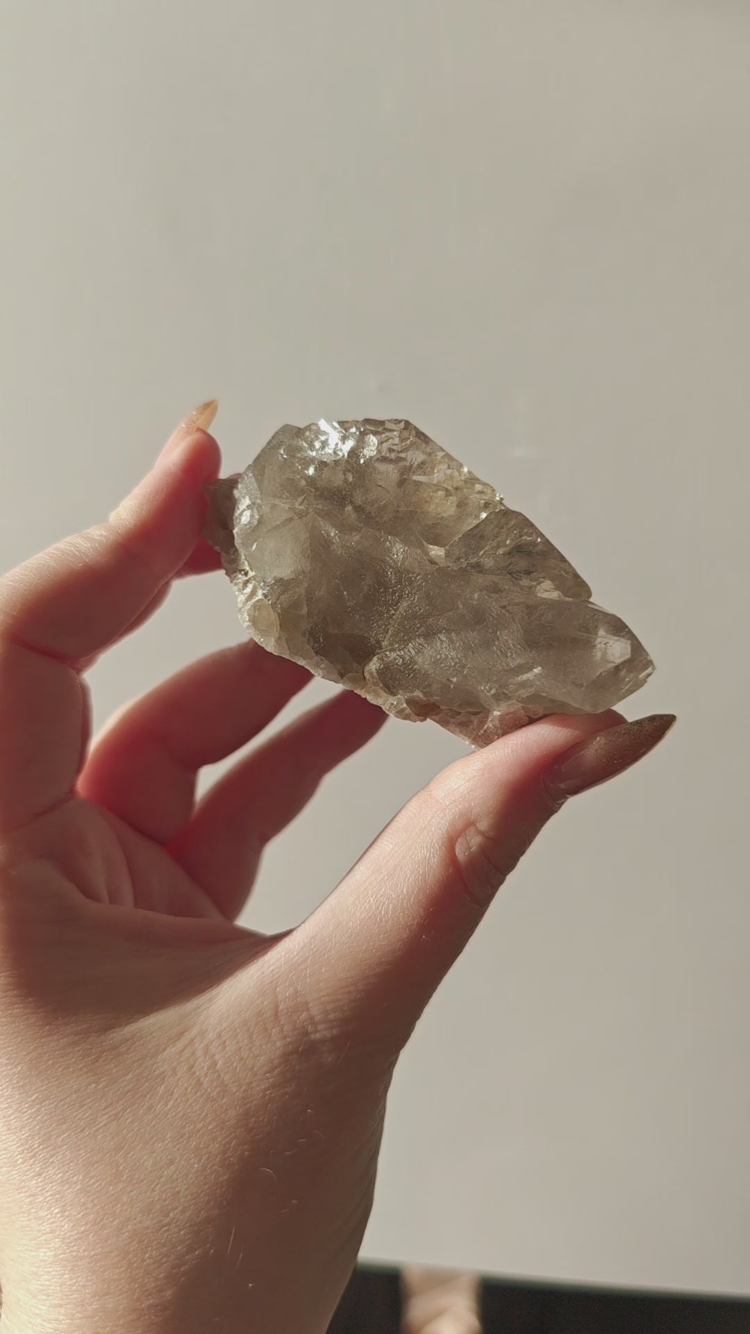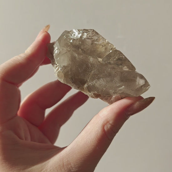 Rauchquarzfärbung: Die rauchige, teils bernsteinfarbene Tönung entsteht durch natürliche Strahlung im Gestein und verleiht jedem Stück eine warme, erdige Eleganz.
