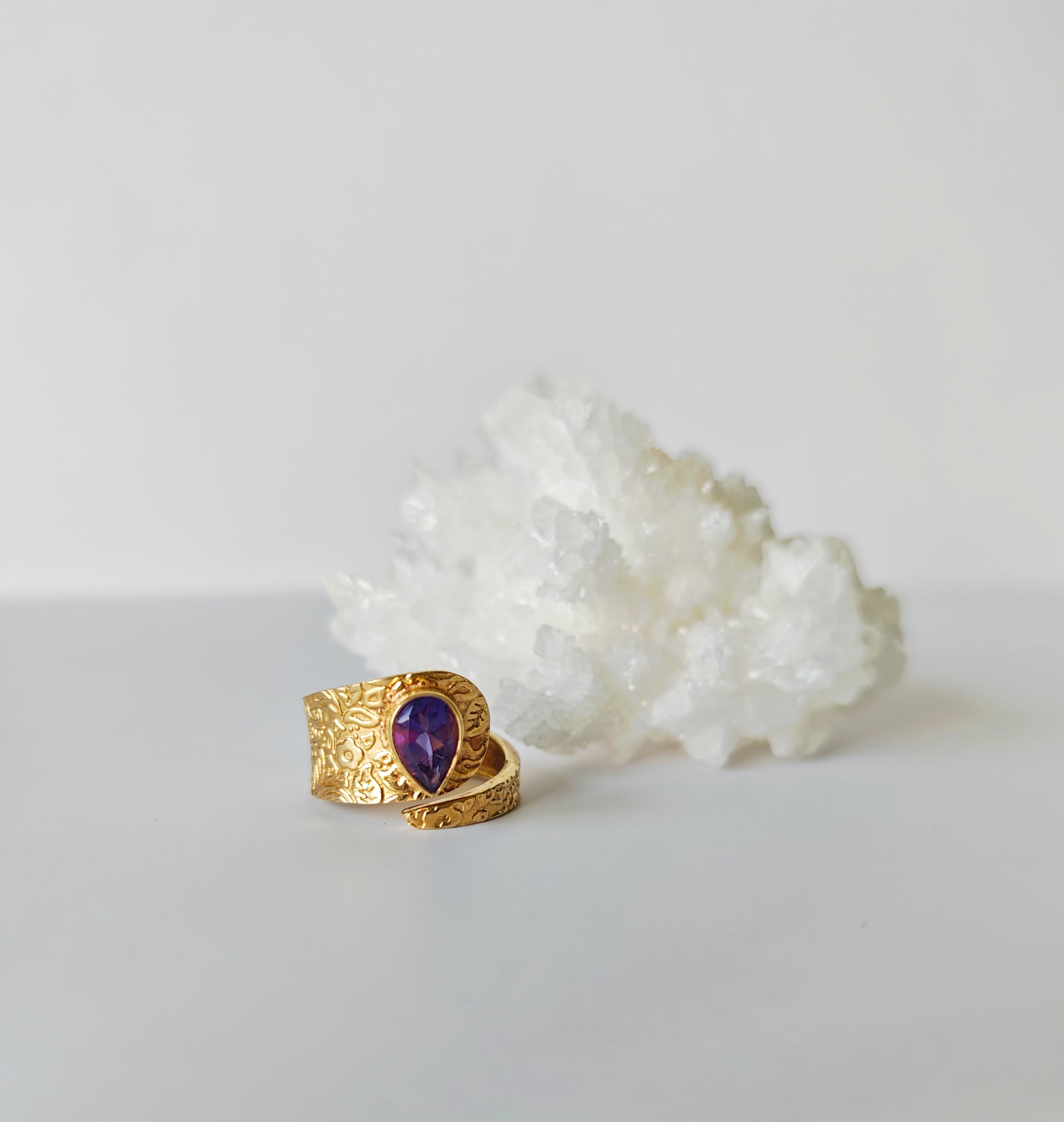 Ein einzigartiges Schmuckstück für alle, die das Besondere lieben: Dieser Ring besteht aus hochwertigem 925 Sterling Silber, das mit einer edlen Goldschicht veredelt wurde. Der Ring ist kunstvoll mit floralen Ornamenten verziert und umschließt einen tropfenförmigen, facettierten Amethyst.