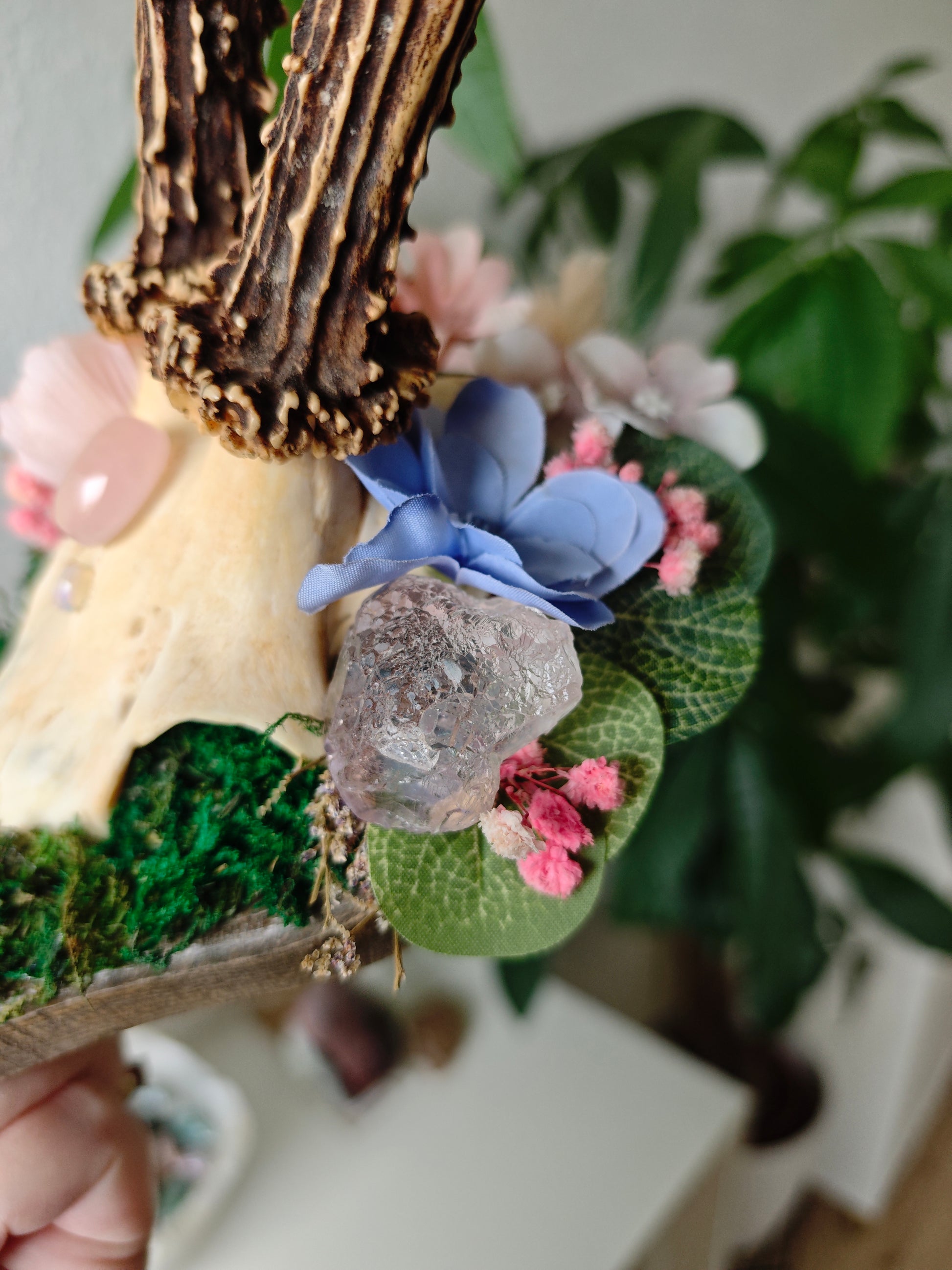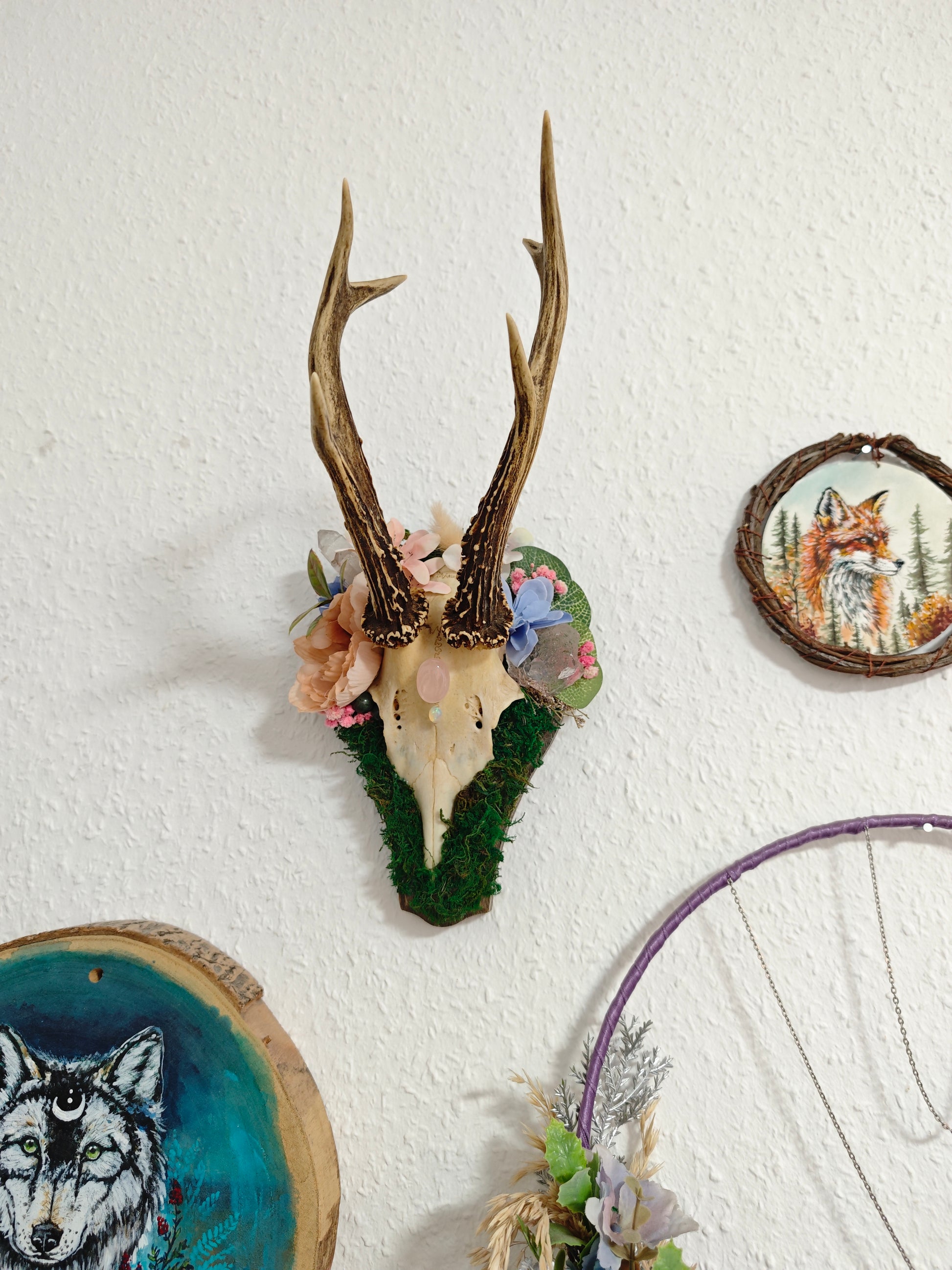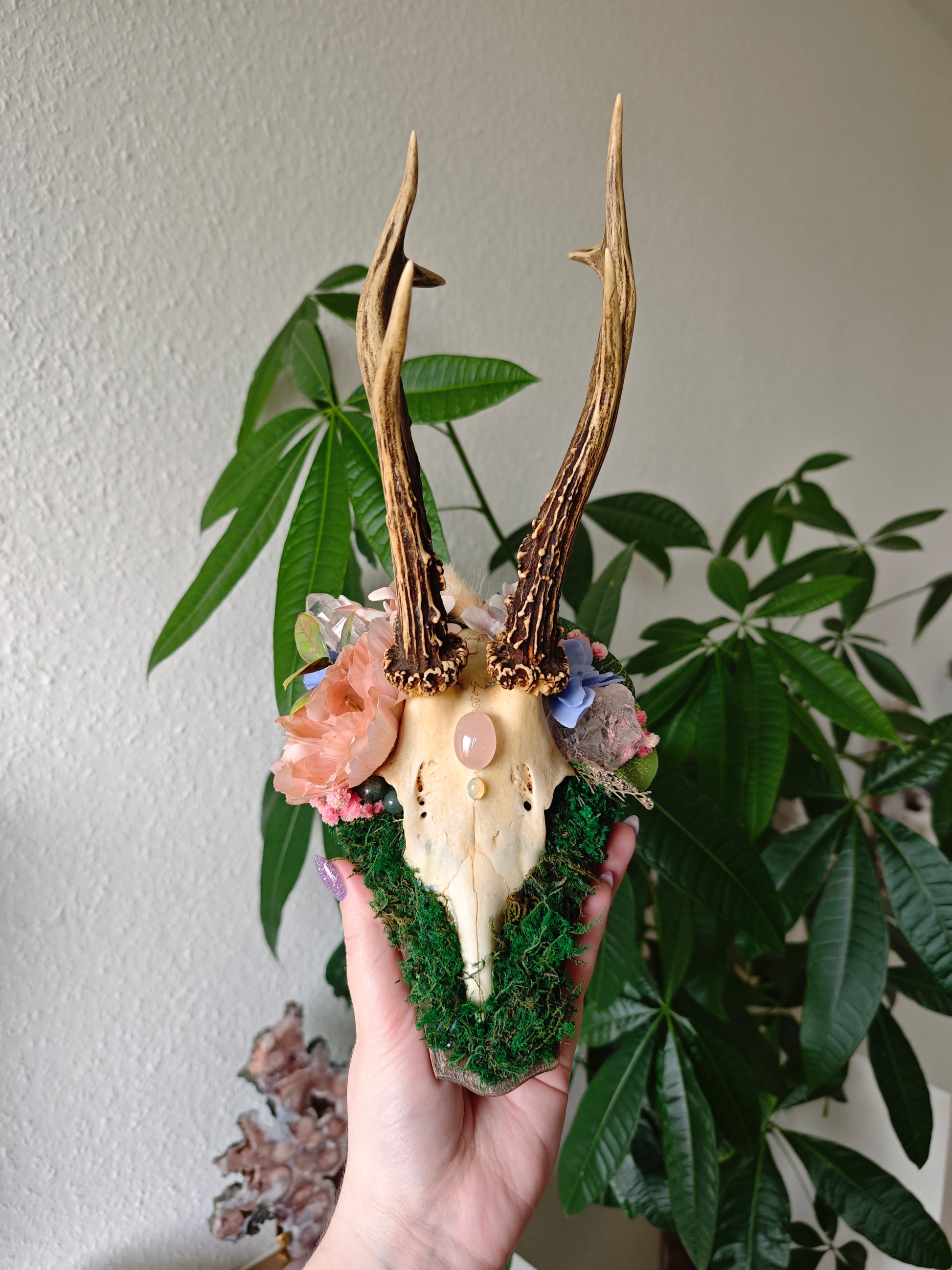 Aphyra ist ein Seelenrelikt, geboren aus der stillen Verbindung von Wildnis, Liebe und göttlicher Weiblichkeit. Bei der Entstehung dieses verzierten Rehschädels war Aphrodite präsent – nicht als laute Göttin, sondern als leiser Hauch von Schönheit, Anziehung und Herzenergie.