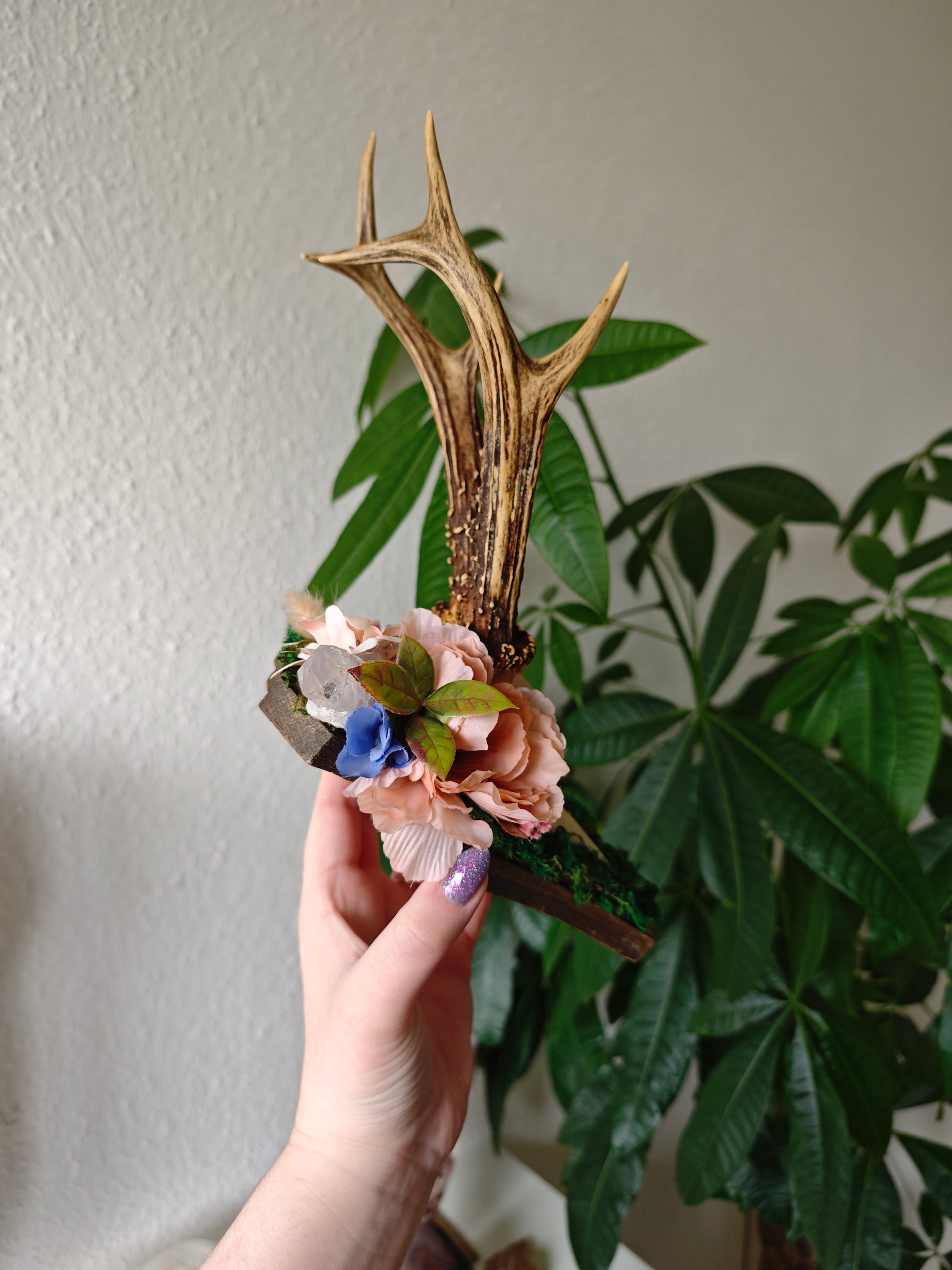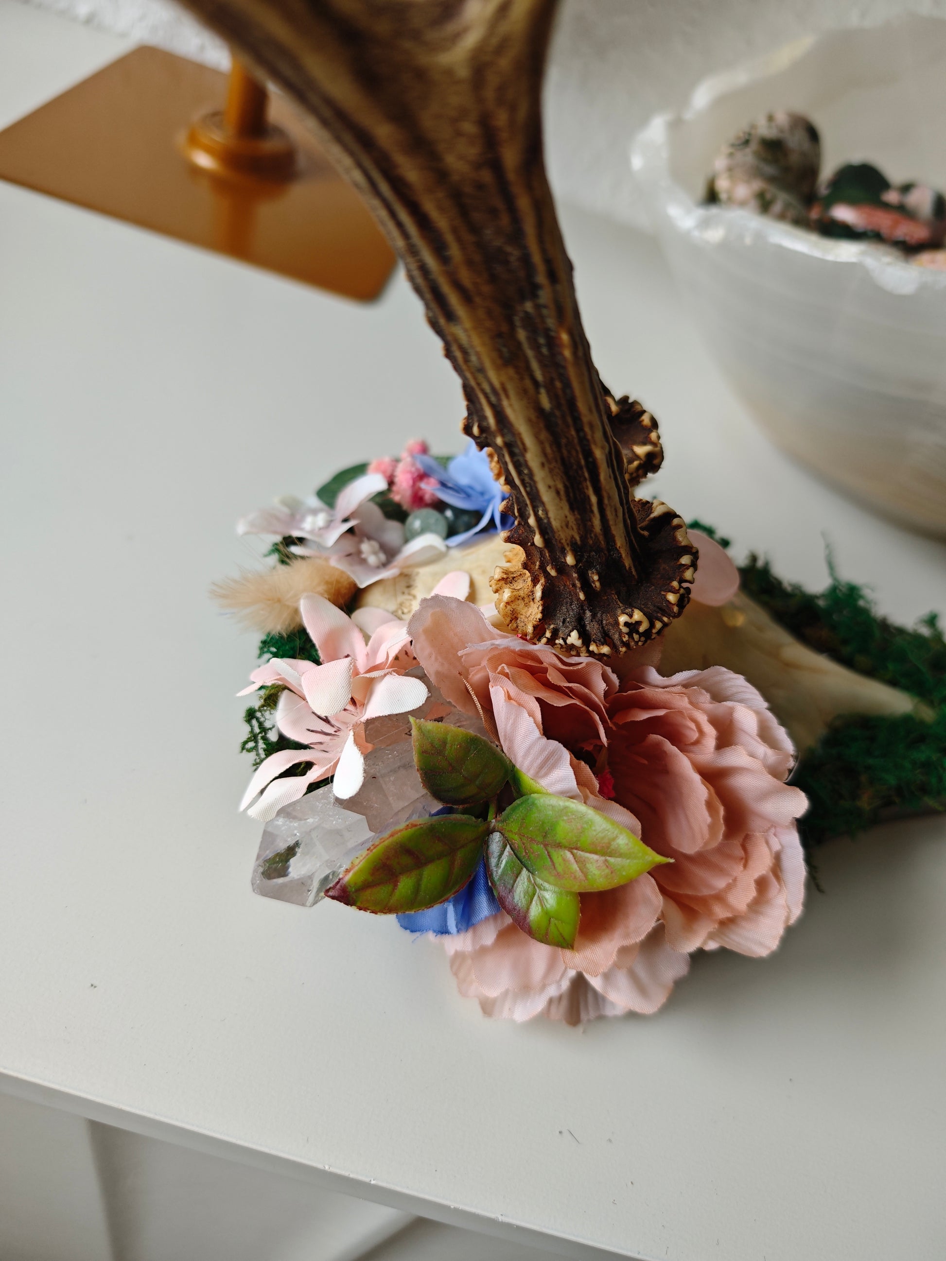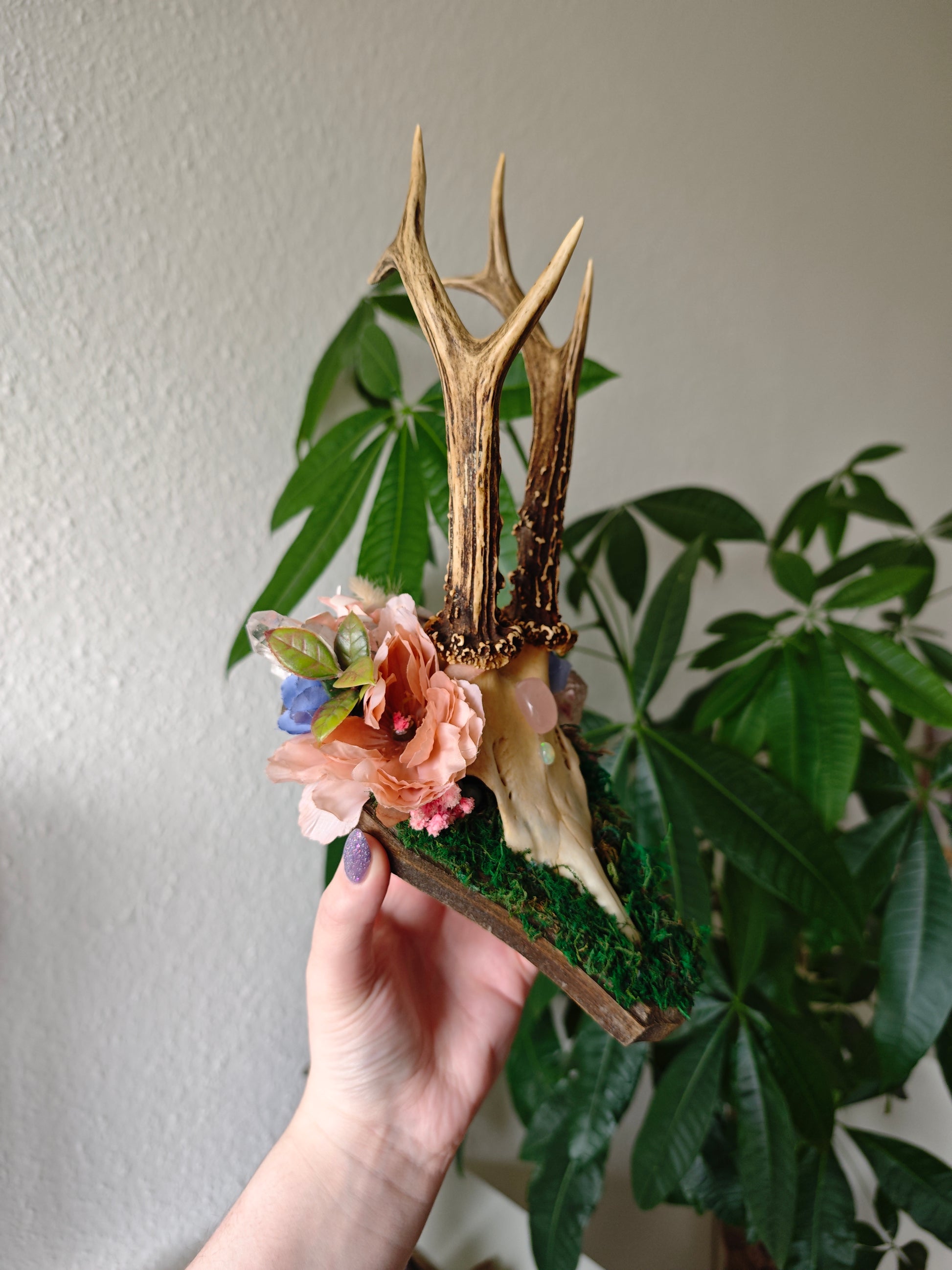 Aphyra ist ein Seelenrelikt, geboren aus der stillen Verbindung von Wildnis, Liebe und göttlicher Weiblichkeit. Bei der Entstehung dieses verzierten Rehschädels war Aphrodite präsent – nicht als laute Göttin, sondern als leiser Hauch von Schönheit, Anziehung und Herzenergie.