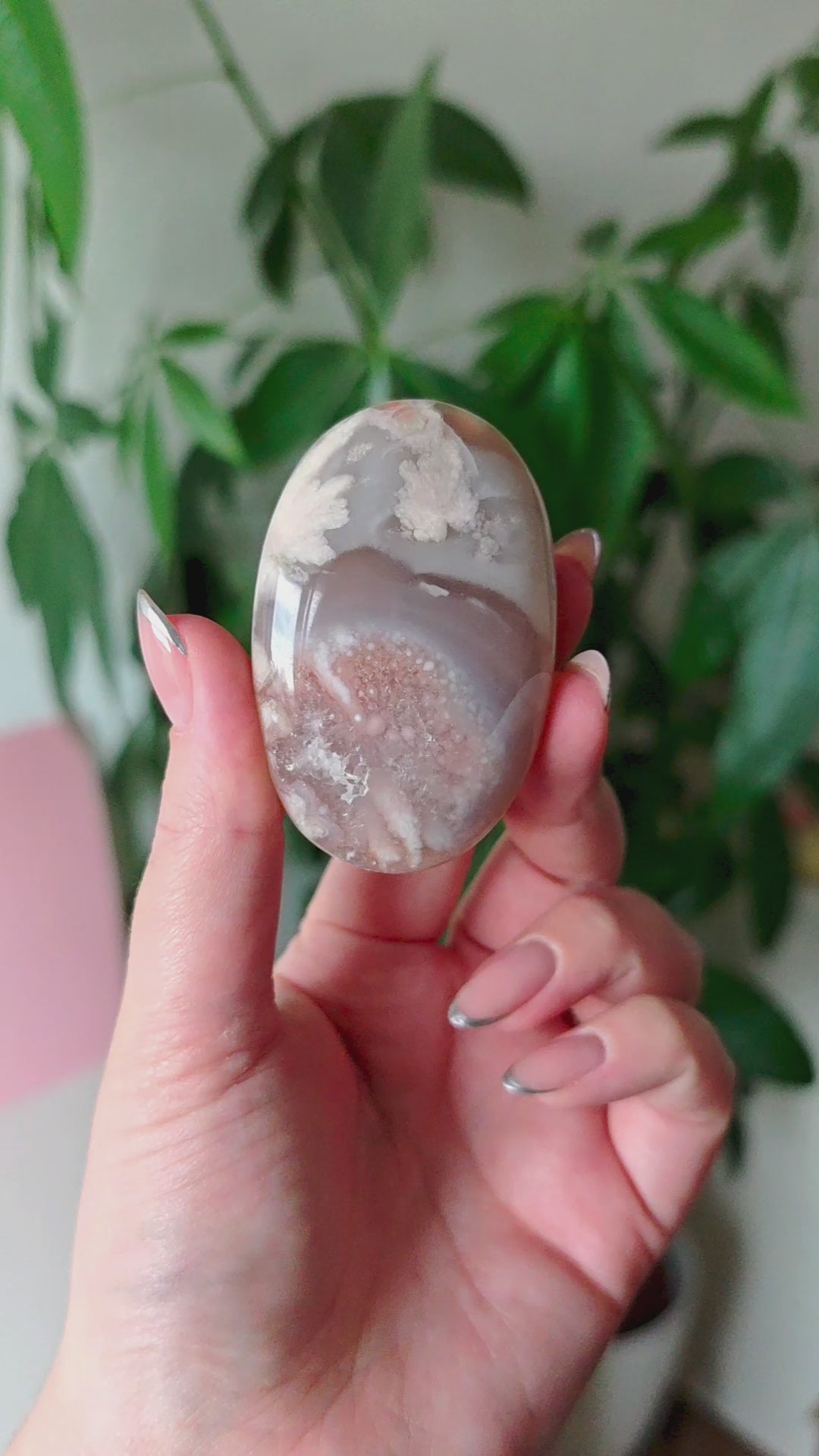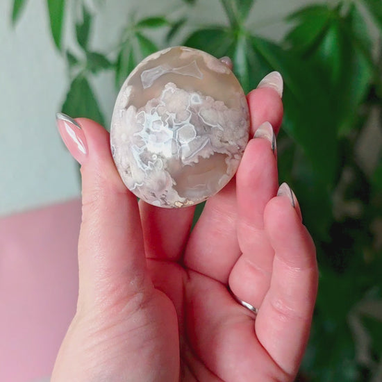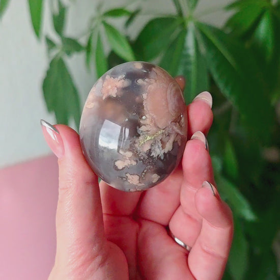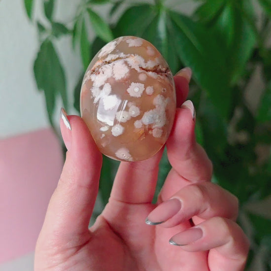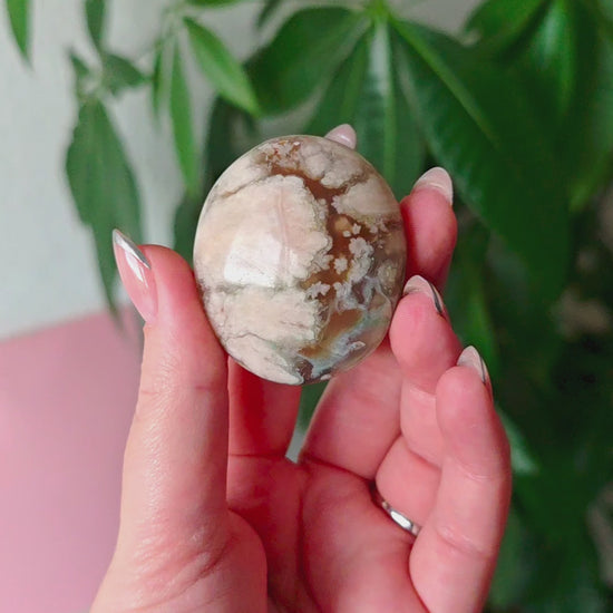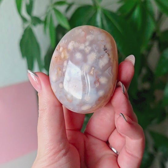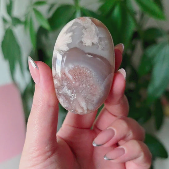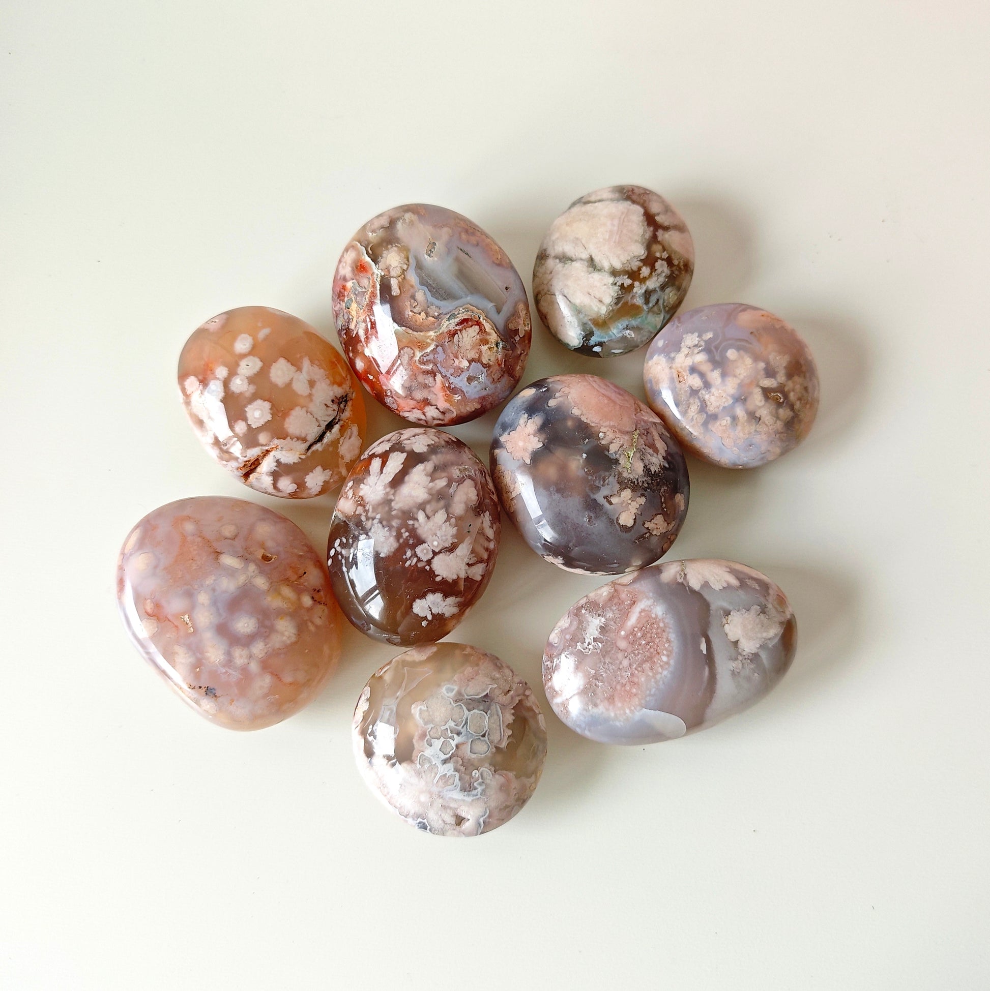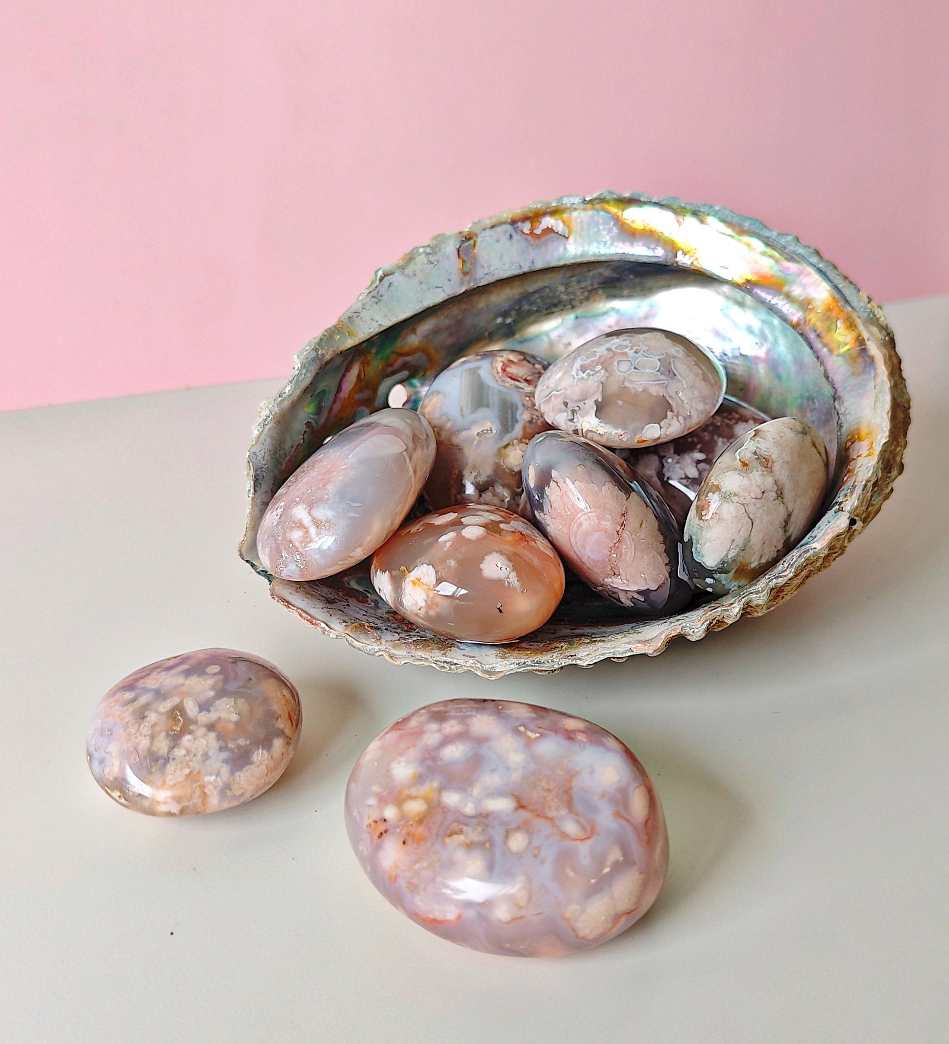 Unsere Blumenachat-Handsteine sind ein wahrer Blickfang: Jeder Stein besticht durch seine zarten rosa Farbtöne, die von einem dezenten Beige-Braun bis hin zu einem intensiven Rosa-Lila reichen. So entsteht ein harmonisches Farbspiel, das jeden Stein einzigartig macht.