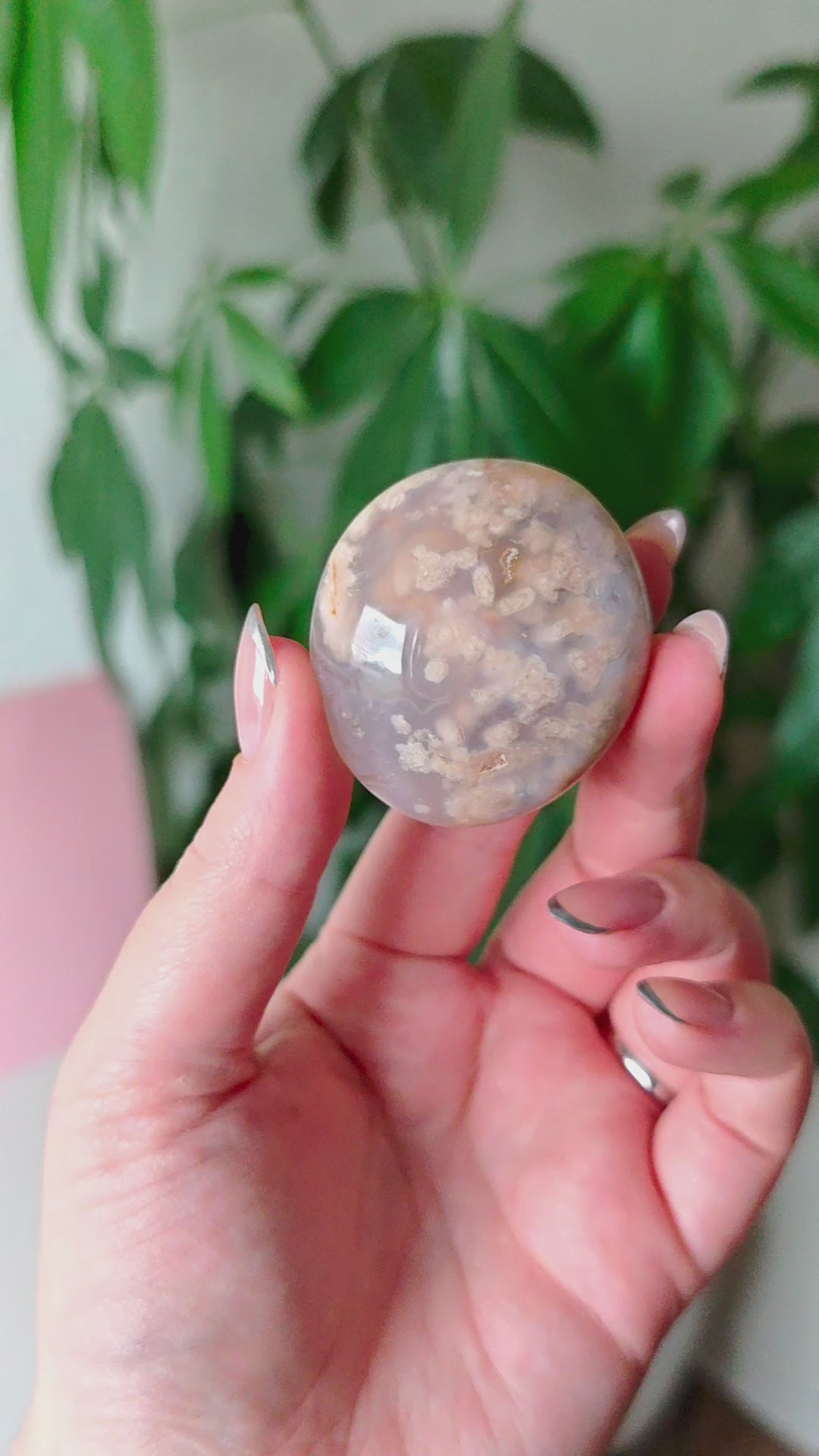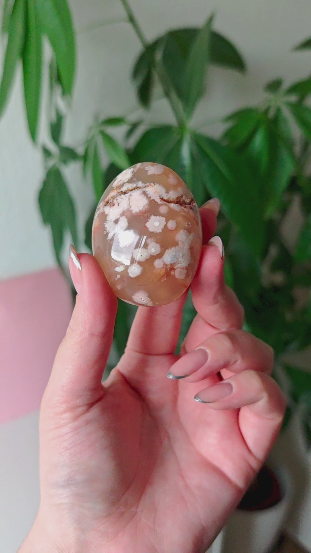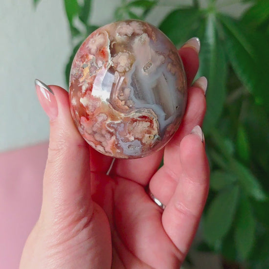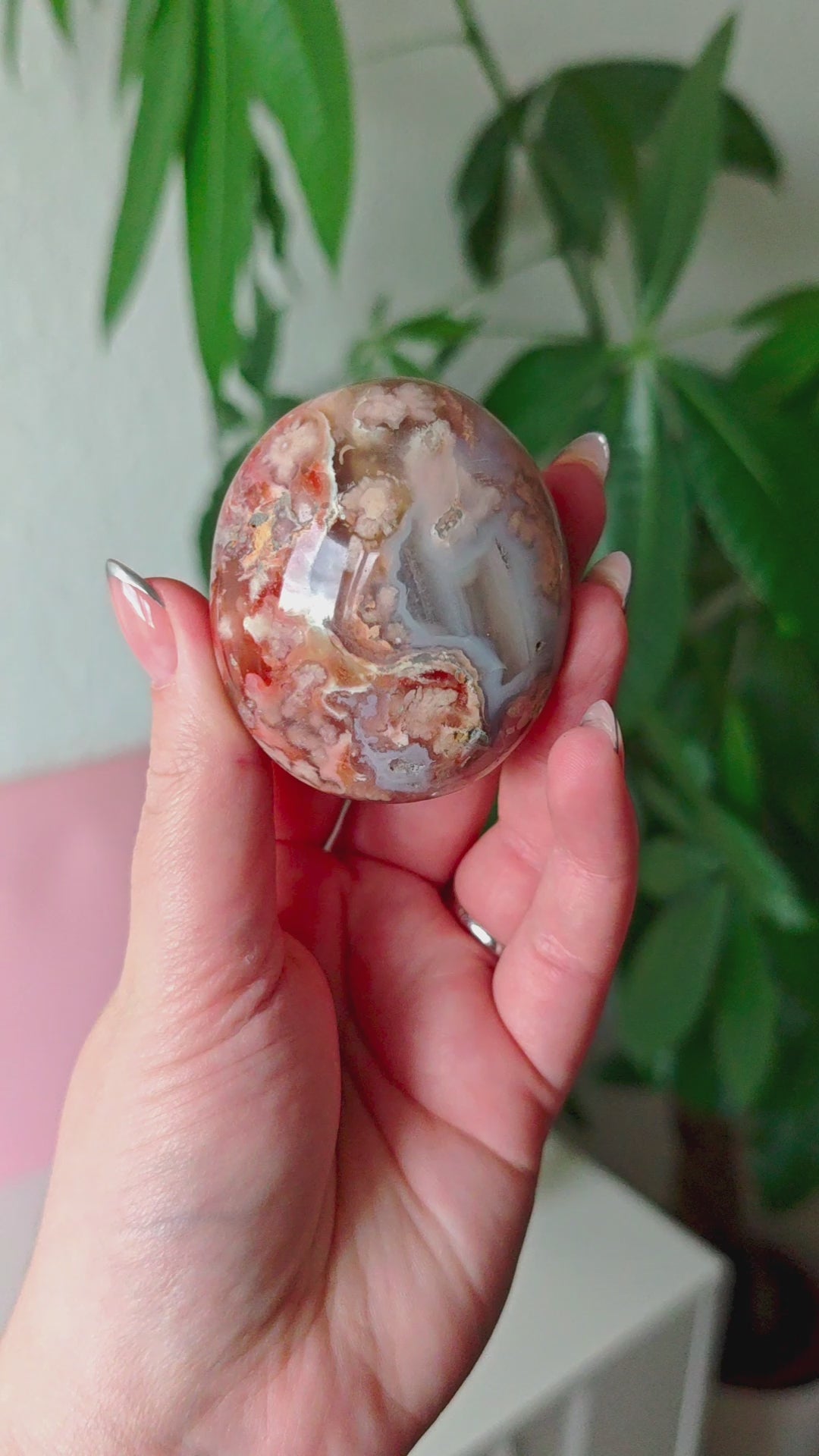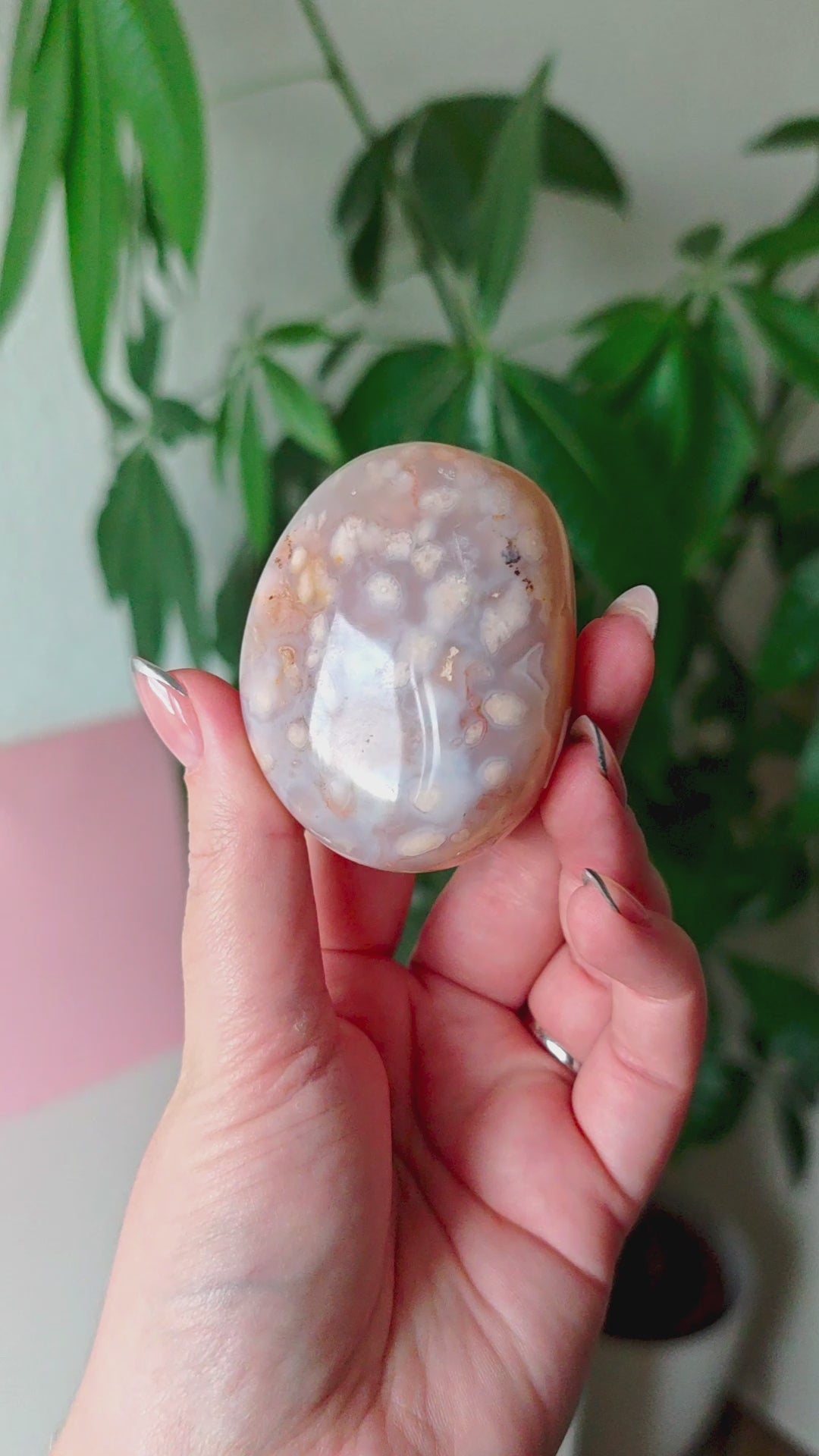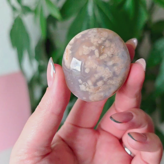 Unsere Blumenachat-Handsteine sind ein wahrer Blickfang: Jeder Stein besticht durch seine zarten rosa Farbtöne, die von einem dezenten Beige-Braun bis hin zu einem intensiven Rosa-Lila reichen. So entsteht ein harmonisches Farbspiel, das jeden Stein einzigartig macht.