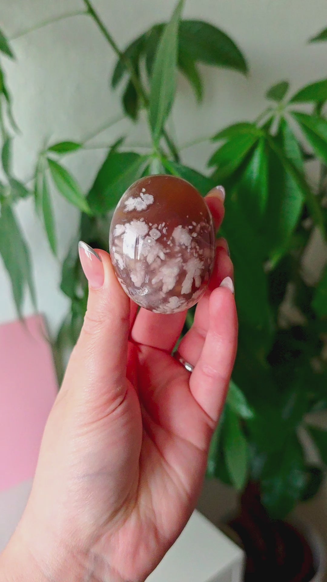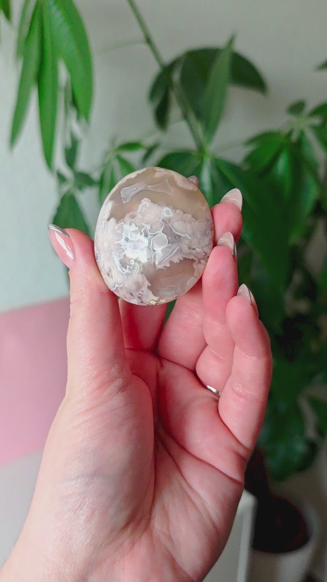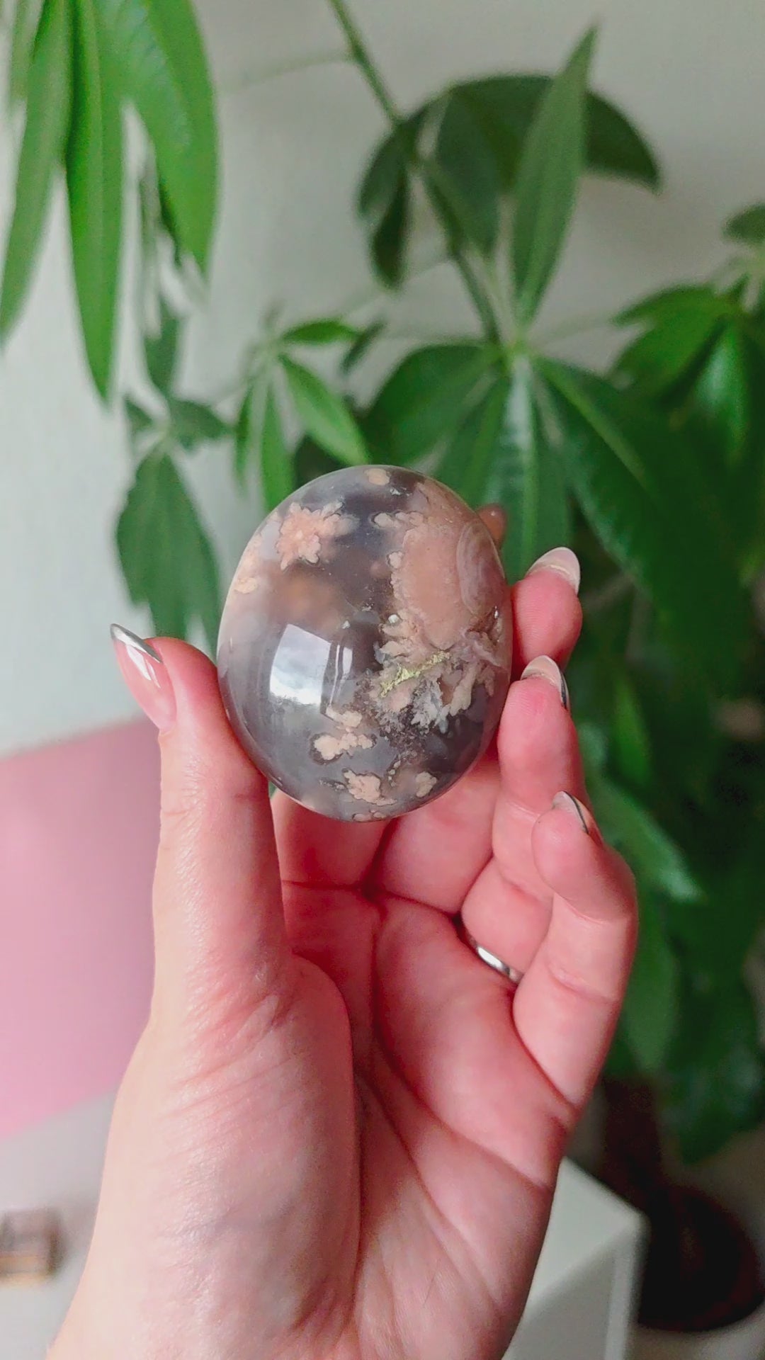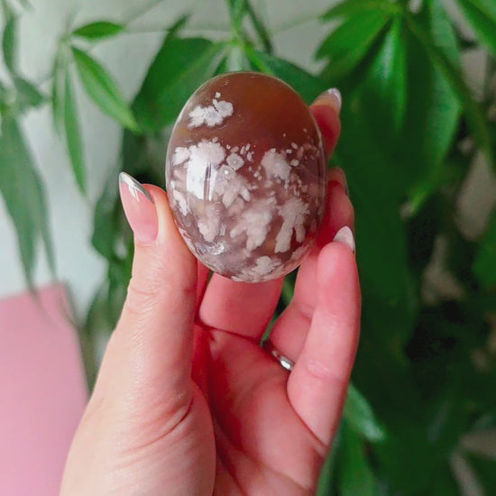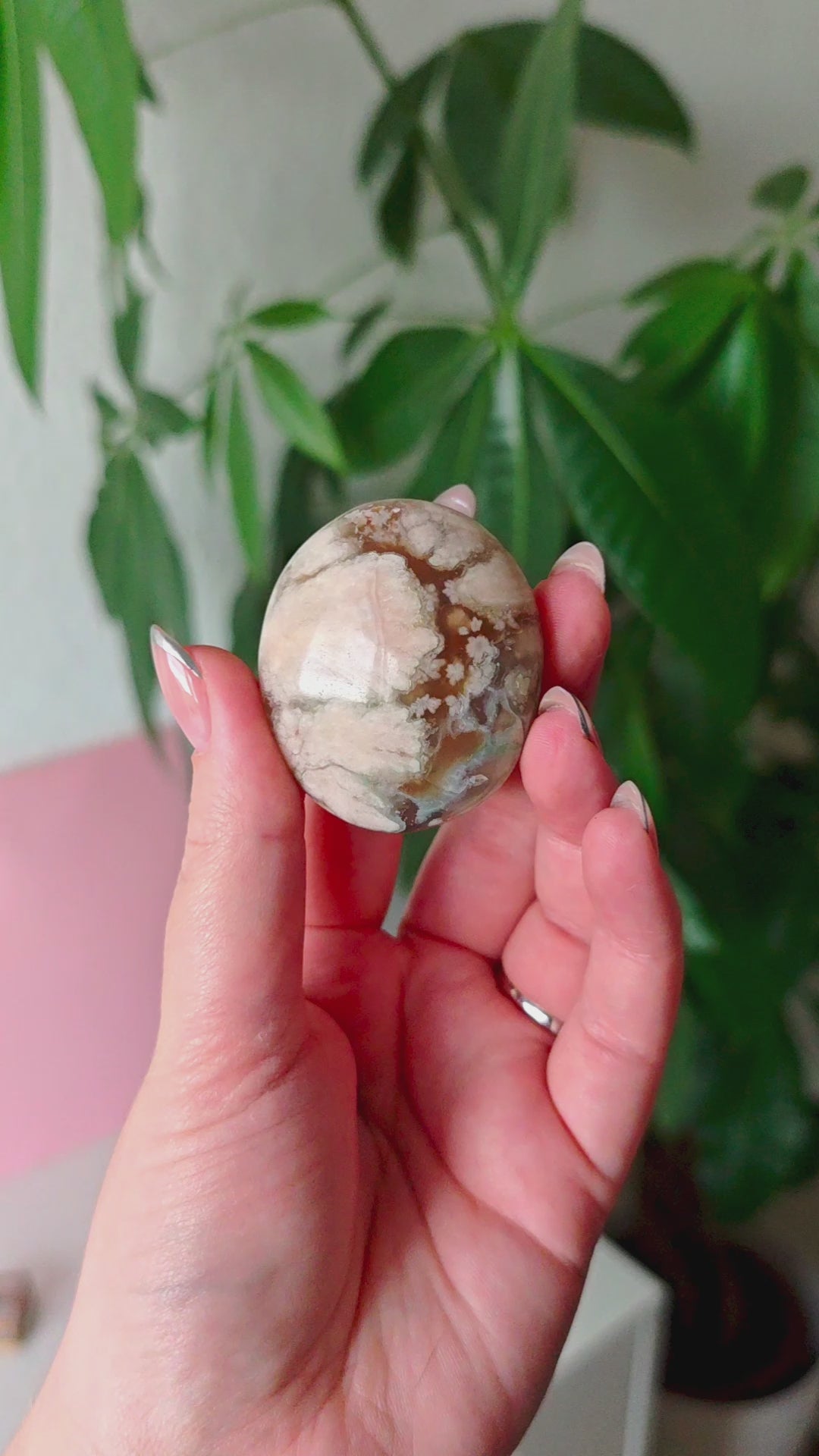 Unsere Blumenachat-Handsteine sind ein wahrer Blickfang: Jeder Stein besticht durch seine zarten rosa Farbtöne, die von einem dezenten Beige-Braun bis hin zu einem intensiven Rosa-Lila reichen. So entsteht ein harmonisches Farbspiel, das jeden Stein einzigartig macht.