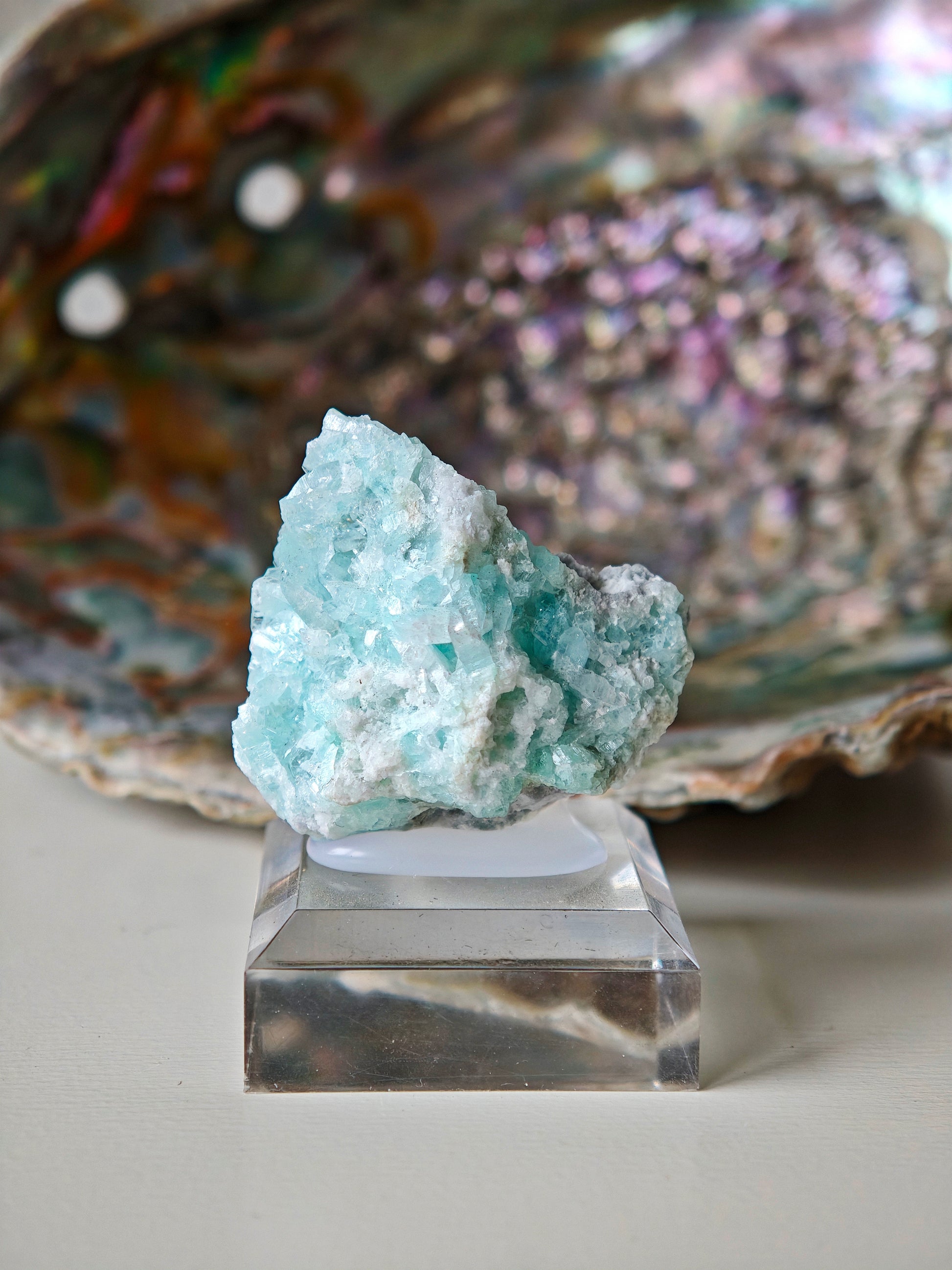 Die hier angebotenen Exemplare stammen aus der San Bartolo Mine in Charcas, San Luis Potosí, einer Region, die für ihre mineralogische Vielfalt und hervorragenden Kristallformen bekannt ist. Borcorit bildet sich, wenn borreiche hydrothermale Lösungen mit calcium- und magnesiumhaltigen Karbonatgesteinen reagieren – ein Prozess, der nur unter sehr spezifischen geochemischen Bedingungen stattfindet. Genau diese besonderen Umstände sorgen auch für die typisch blass blaugrüne Farbe, die durch minimale Beimengungen von Kupfer oder anderen Spurenelementen entsteht.