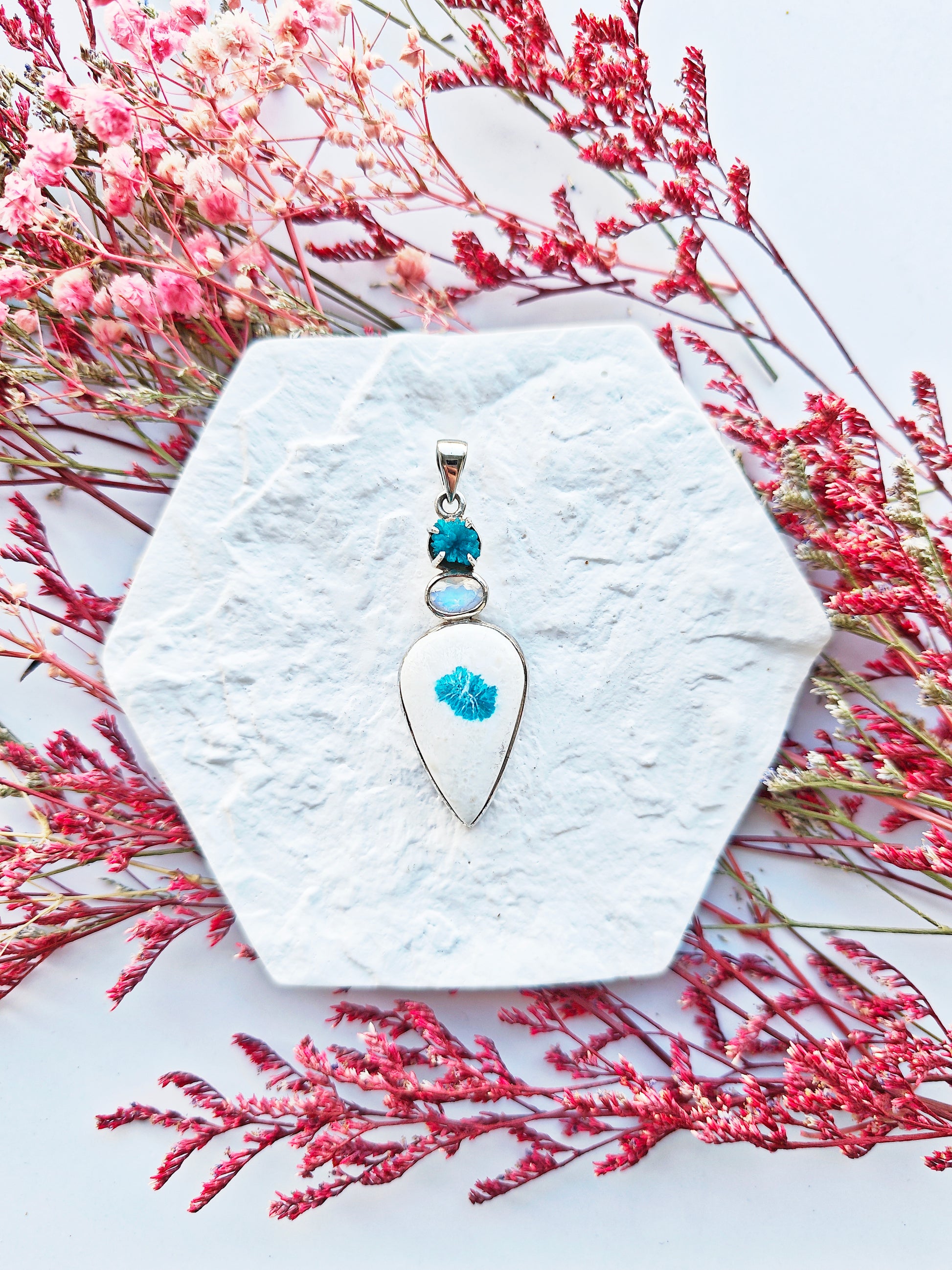 Dieses Unikat wurde mit viel Sorgfalt und Liebe ausgesucht und verweilt wartend auf seinen neuen Besitzer. Dieser Anhänger ist aus einem Cavasinit und Mondstein gefertigt.  Die Fassung ist aus 925 Silber.