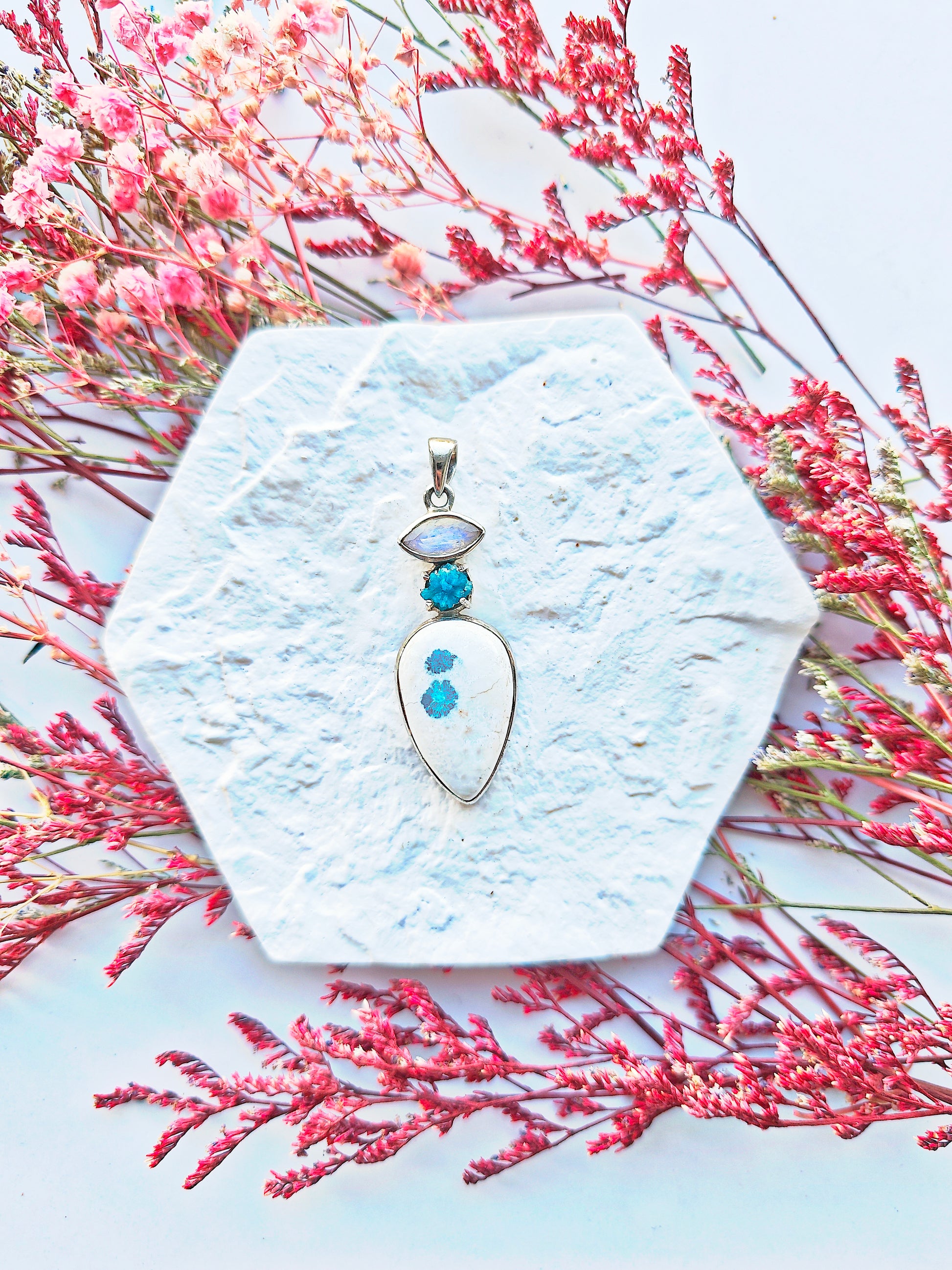 Dieses Unikat wurde mit viel Sorgfalt und Liebe ausgesucht und verweilt wartend auf seinen neuen Besitzer. Dieser Anhänger ist aus einem Cavasinit und Mondstein gefertigt. Die Fassung ist aus 925 Silber.