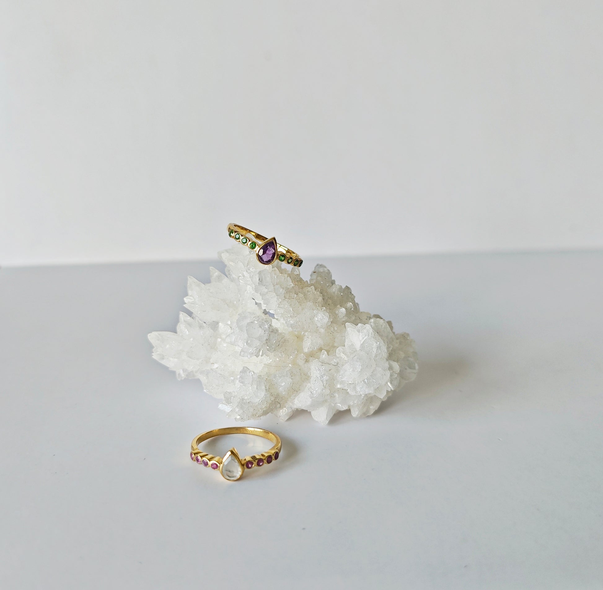 Der obere Ring kombiniert einen violetten Amethyst-Tropfen mit einer Reihe von zarten Peridot, die ihm eine geheimnisvolle, elfenhafte Ausstrahlung verleihen. Der untere Ring trägt einen klaren Mondstein-Tropfen, begleitet von leuchtenden Rubinen, die Wärme und Leidenschaft in das Design bringen.