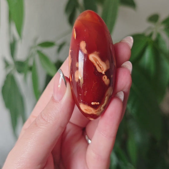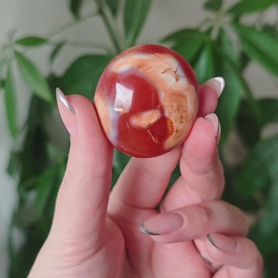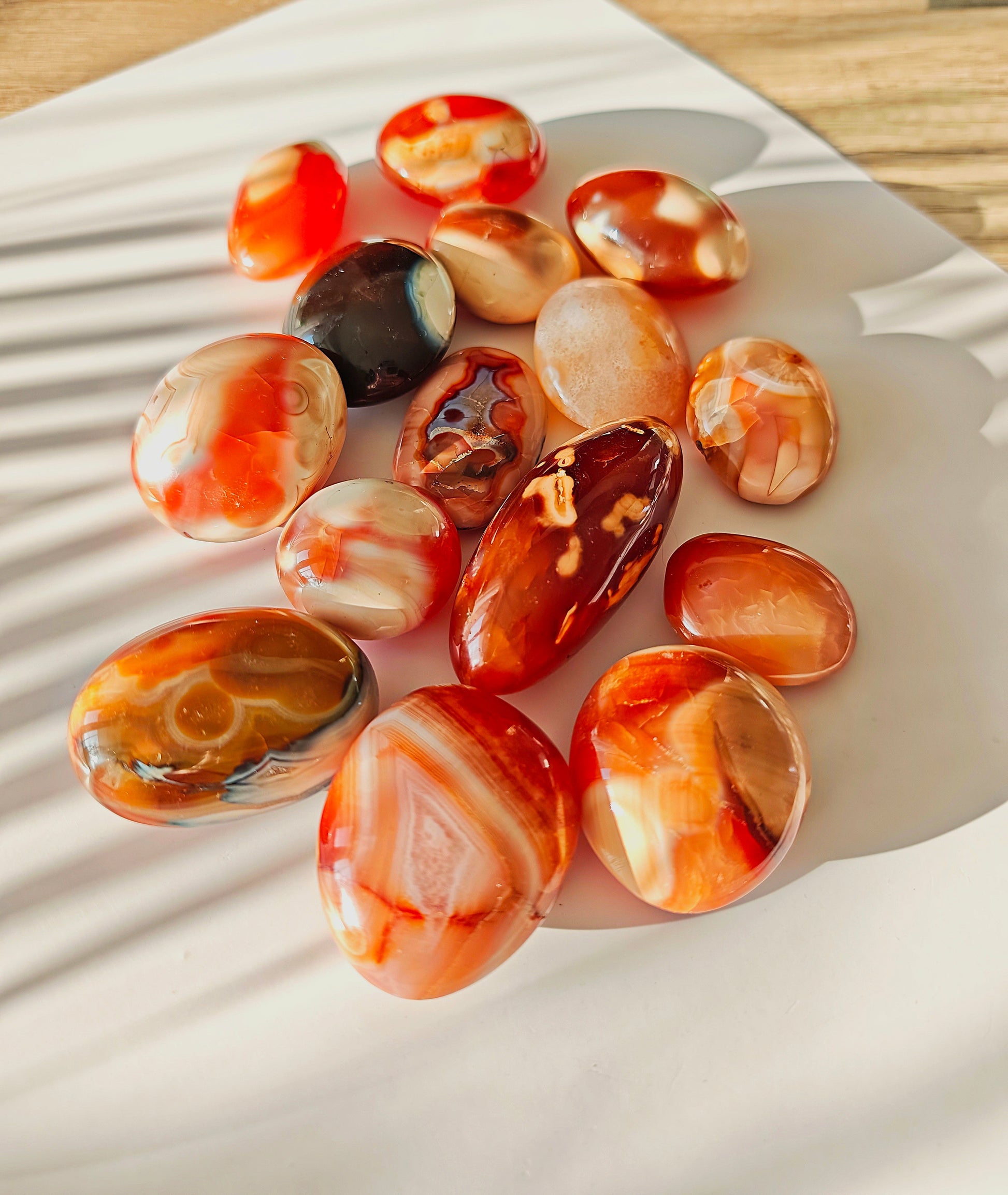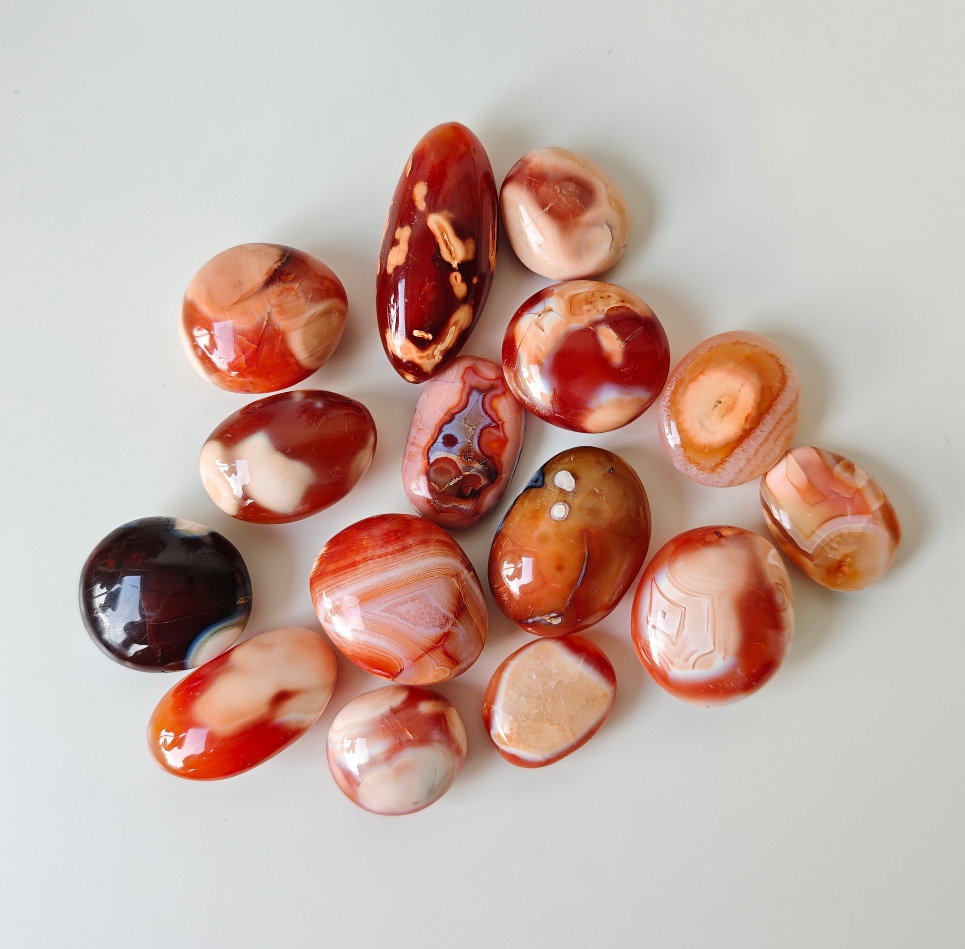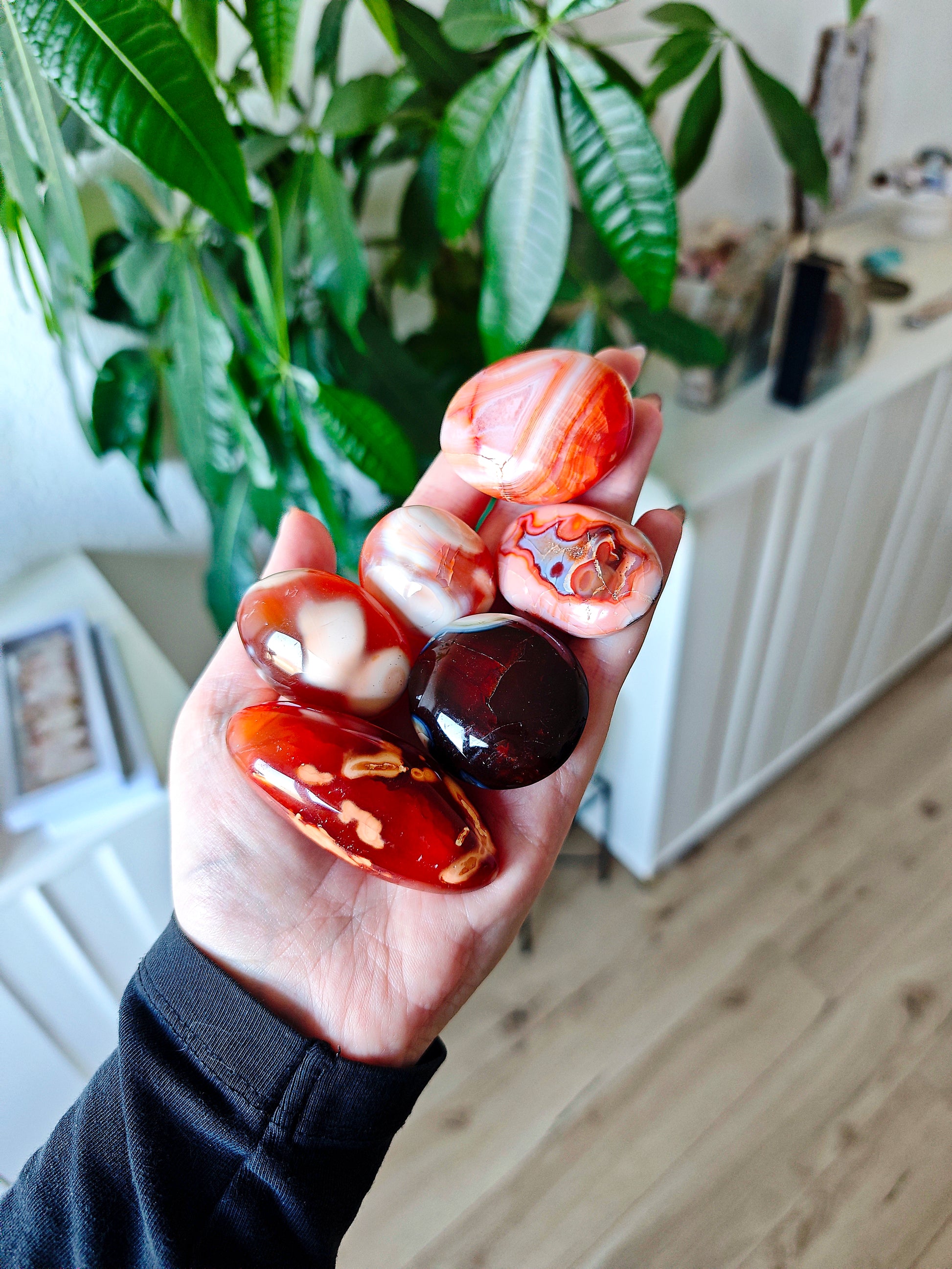 Karneol hingegen ist lebendig wie eine Flamme. Warmes Rot, honigfarbene Schichten, eine Energie, die an Sonnenaufgänge erinnert. Er symbolisiert Kreativität, Leidenschaft, den Mut, sich zu zeigen und Dinge in Bewegung zu bringen. Ein Stein voller Wärme und ursprünglicher Lebensfreude.