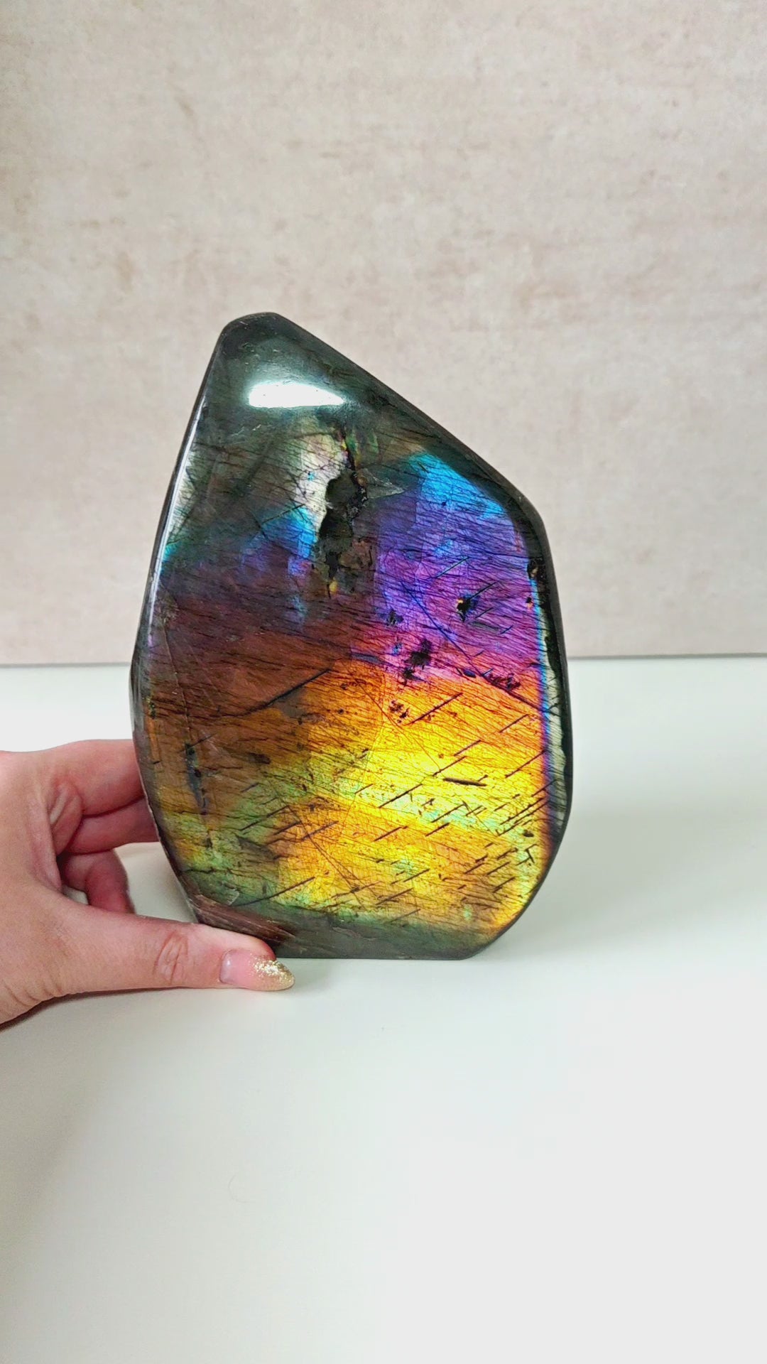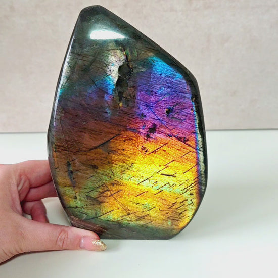 Dieser außergewöhnliche Regenbogen-Labradorit gehören zu den seltensten und farbintensivsten Qualitäten, die derzeit am Markt zu finden sind. Jedes Stück zeigt ein intensives Farbspiel aus Gold, Violett, Blau, Rosa, Silber und Orange.