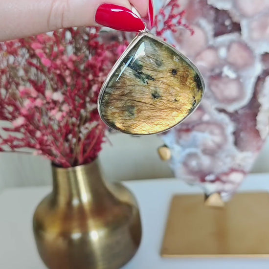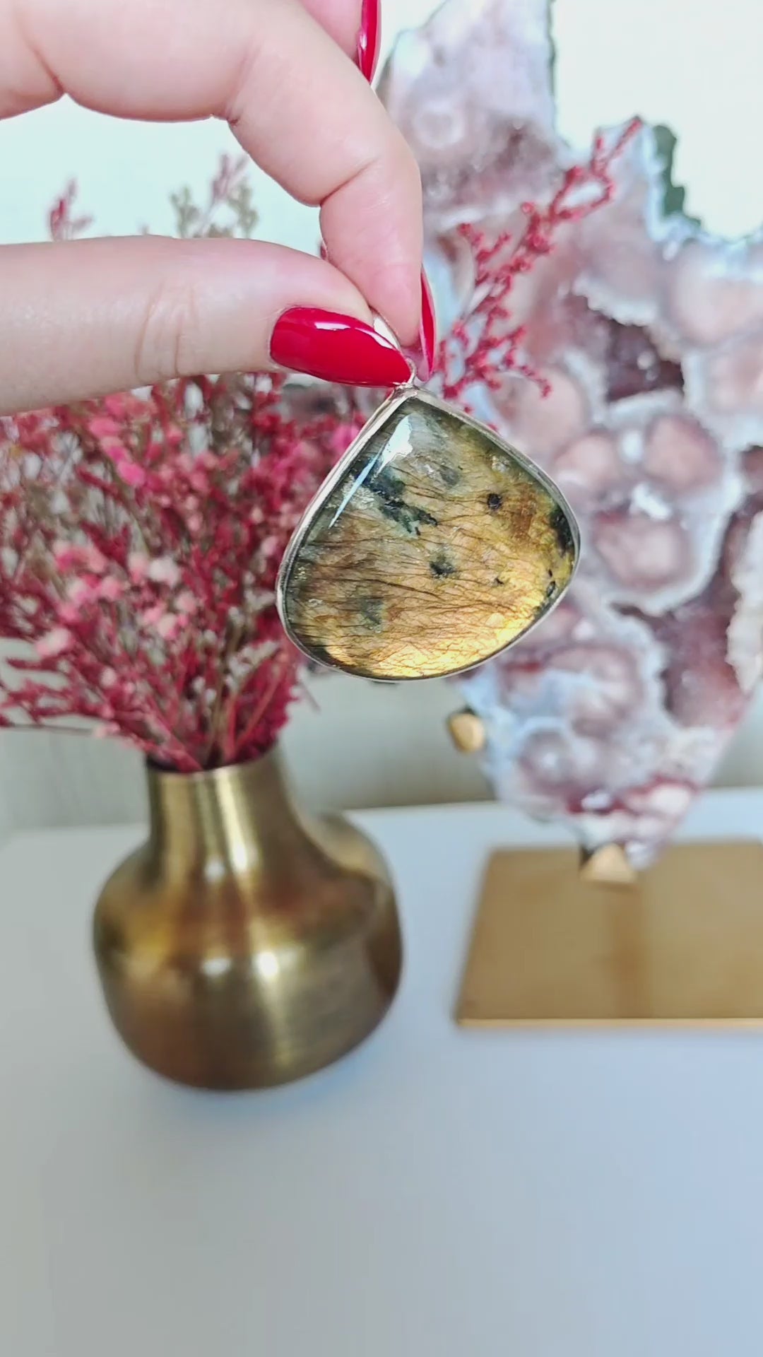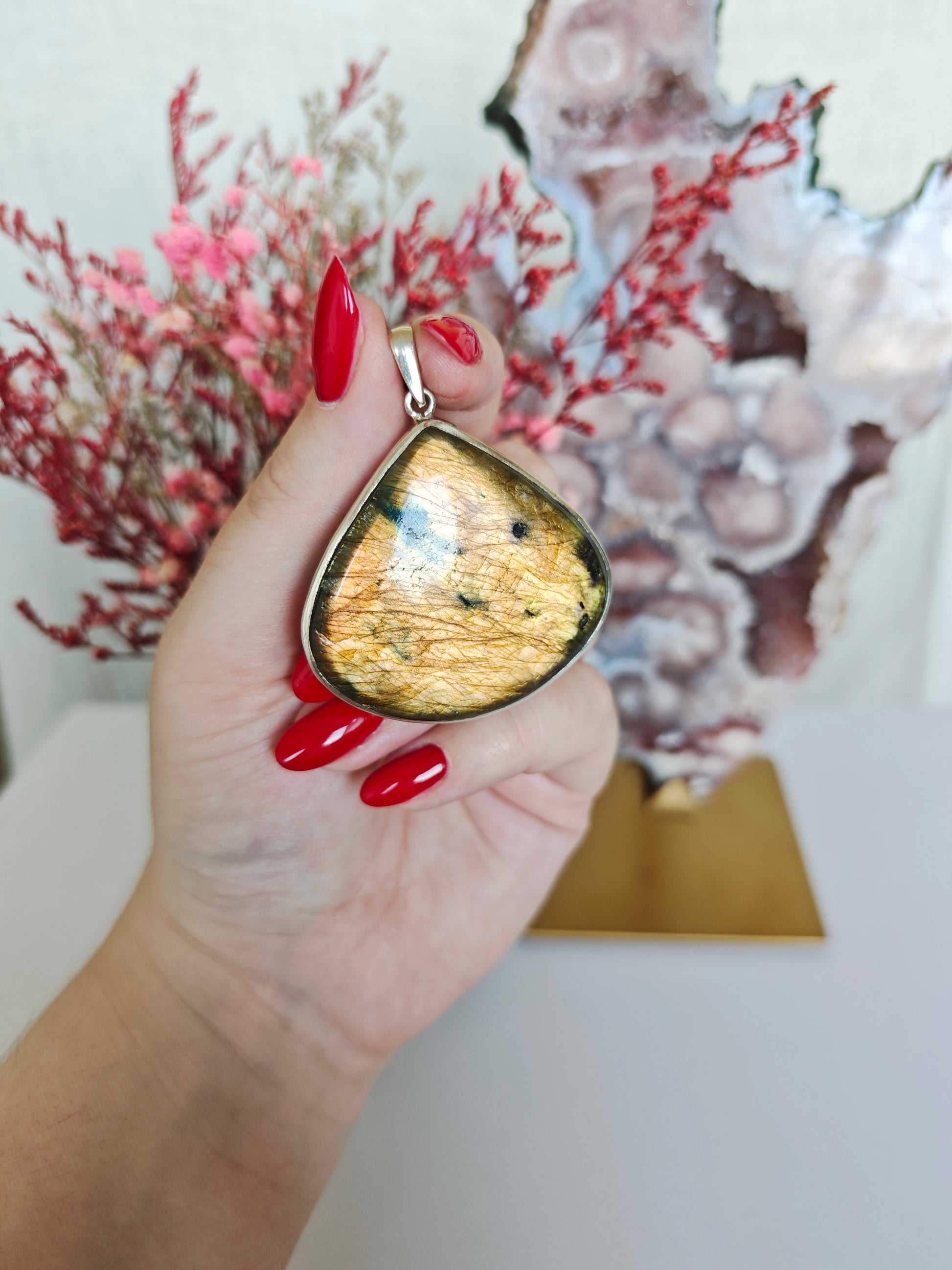 Dieses Unikat wurde mit viel Sorgfalt und Liebe ausgesucht und verweilt wartend auf seinen neuen Besitzer. Dieser Anhänger ist aus einem Labradorit gefertigt.  Die Öse ist aus 925 Silber.