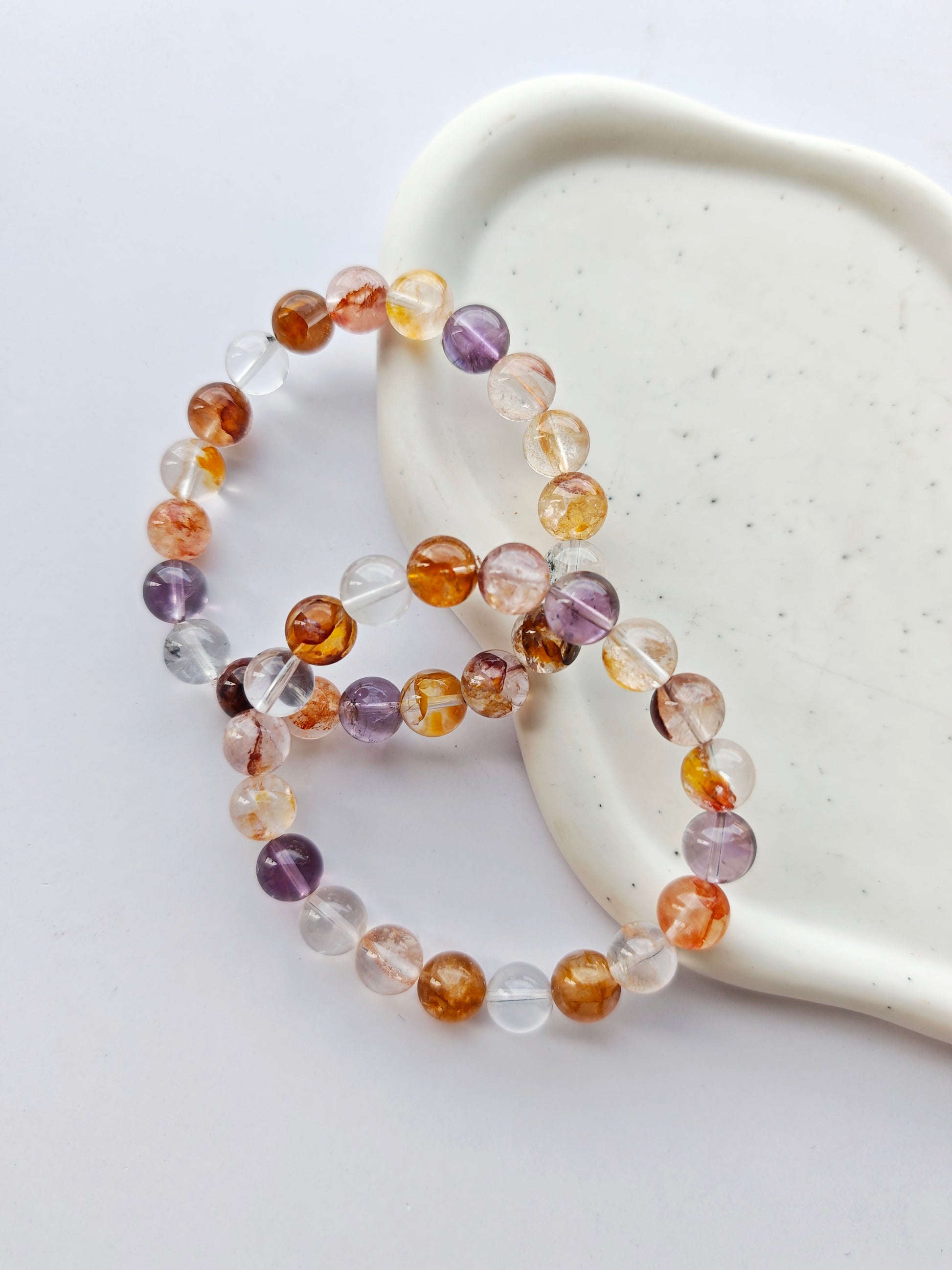 Bergkristall x Golden Healer, Feuerquarz x Amethyst Armbänder