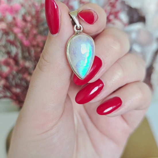 Dieses Unikat wurde mit viel Sorgfalt und Liebe ausgesucht und verweilt wartend auf seinen neuen Besitzer. Dieser Anhänger ist aus einem Mondstein gefertigt. Die Öse ist aus 925 Silber.