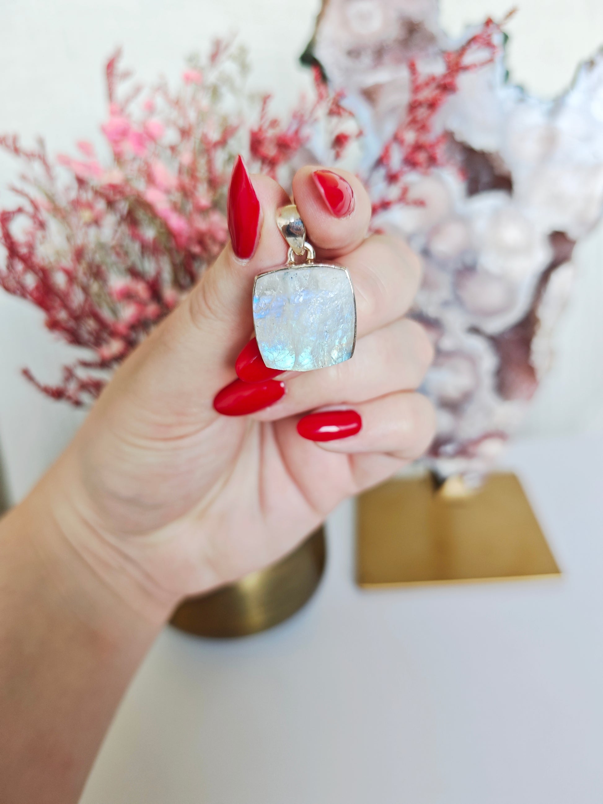 Dieses Unikat wurde mit viel Sorgfalt und Liebe ausgesucht und verweilt wartend auf seinen neuen Besitzer. Dieser Anhänger ist aus einem Mondstein gefertigt. Die Öse ist aus 925 Silber.