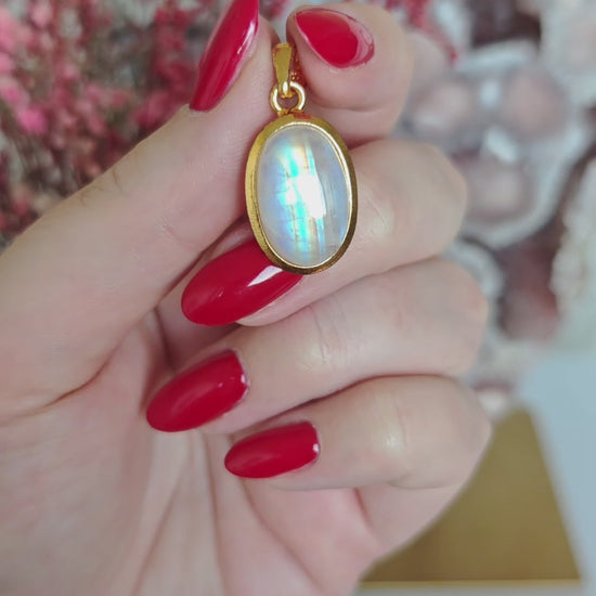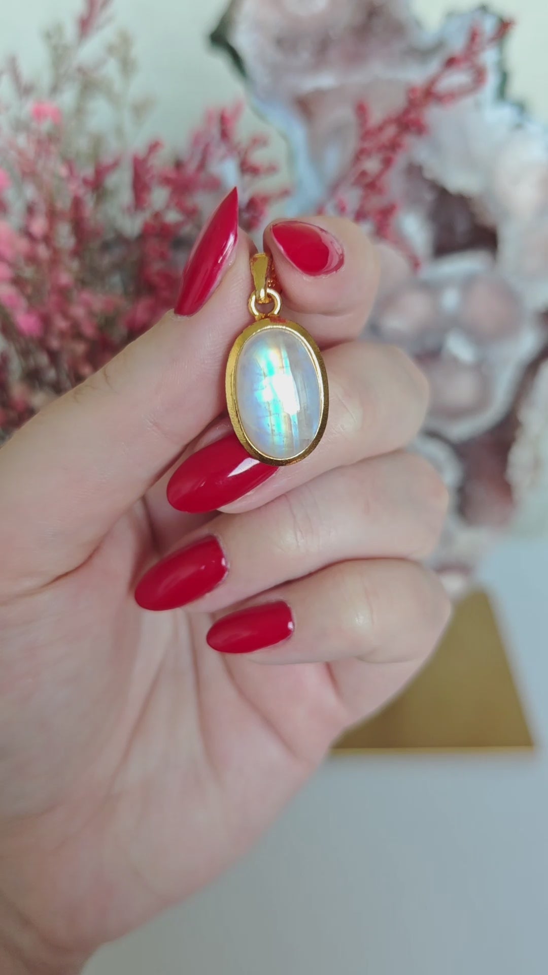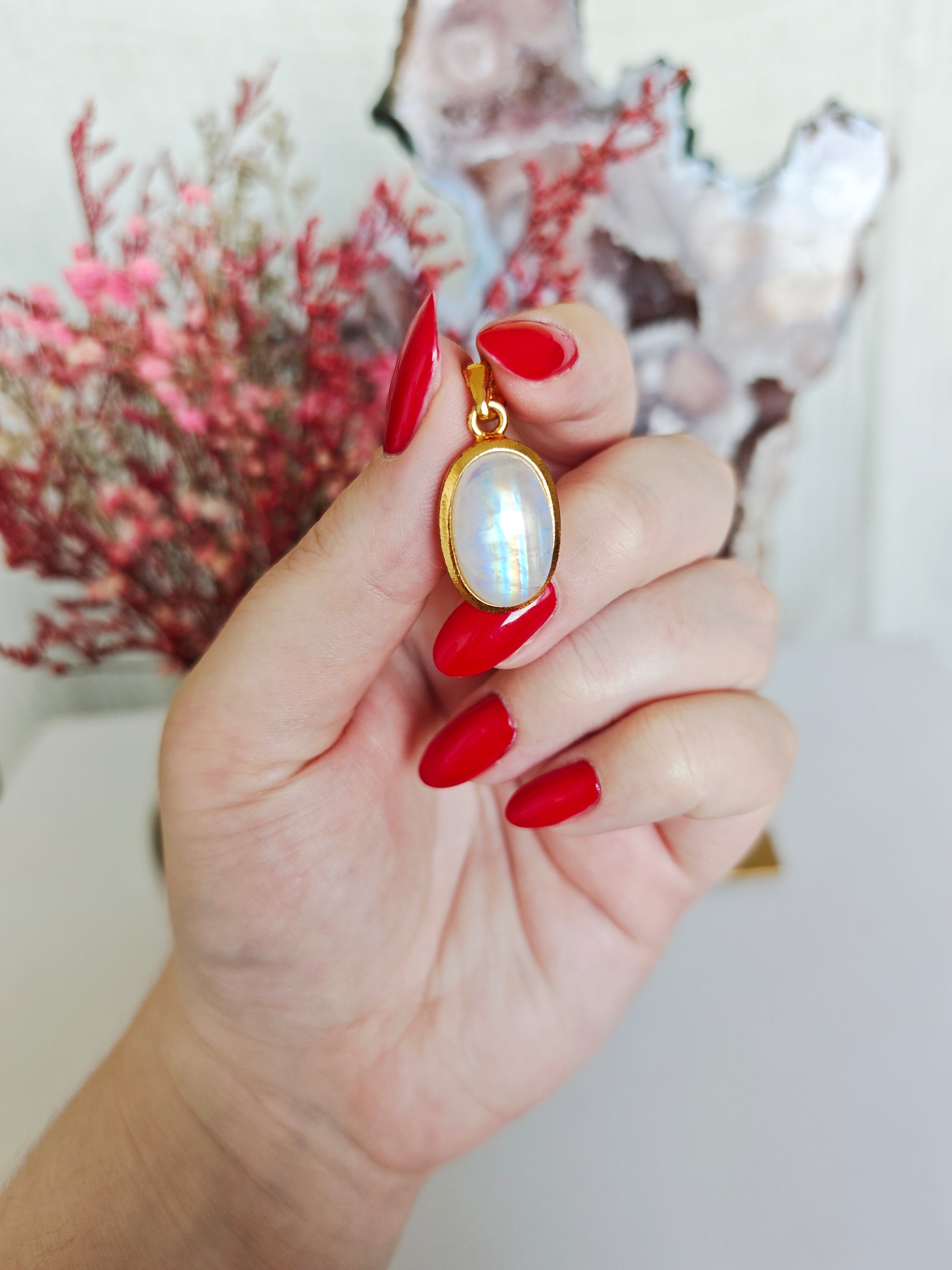 Dieses Unikat wurde mit viel Sorgfalt und Liebe ausgesucht und verweilt wartend auf seinen neuen Besitzer. Dieser Anhänger ist aus einem Mondstein gefertigt. Die Öse ist aus 925 Silber.