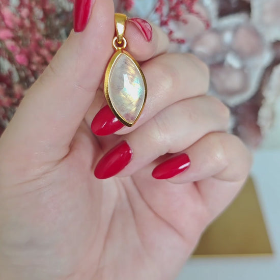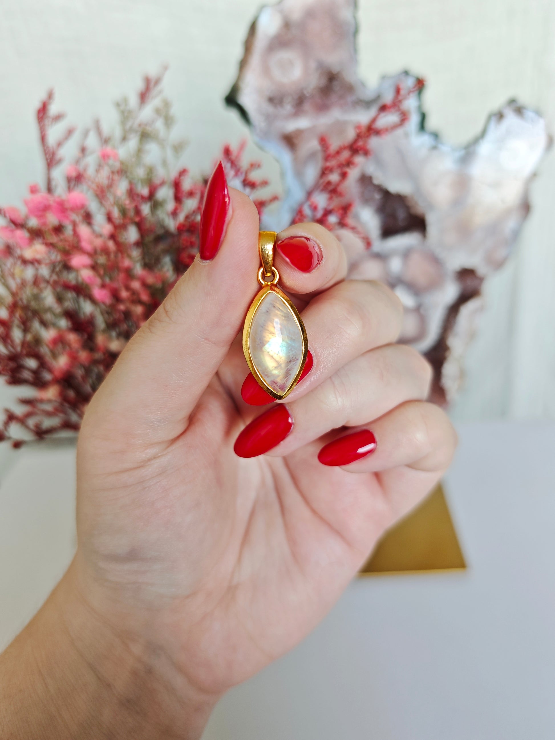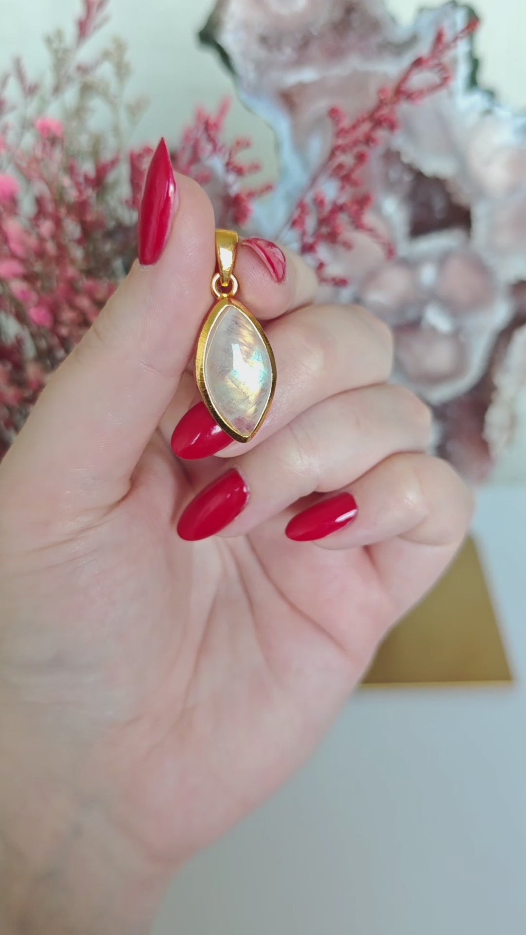 Dieses Unikat wurde mit viel Sorgfalt und Liebe ausgesucht und verweilt wartend auf seinen neuen Besitzer. Dieser Anhänger ist aus einem Mondstein gefertigt.  Die Öse ist aus 925 Silber.