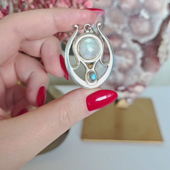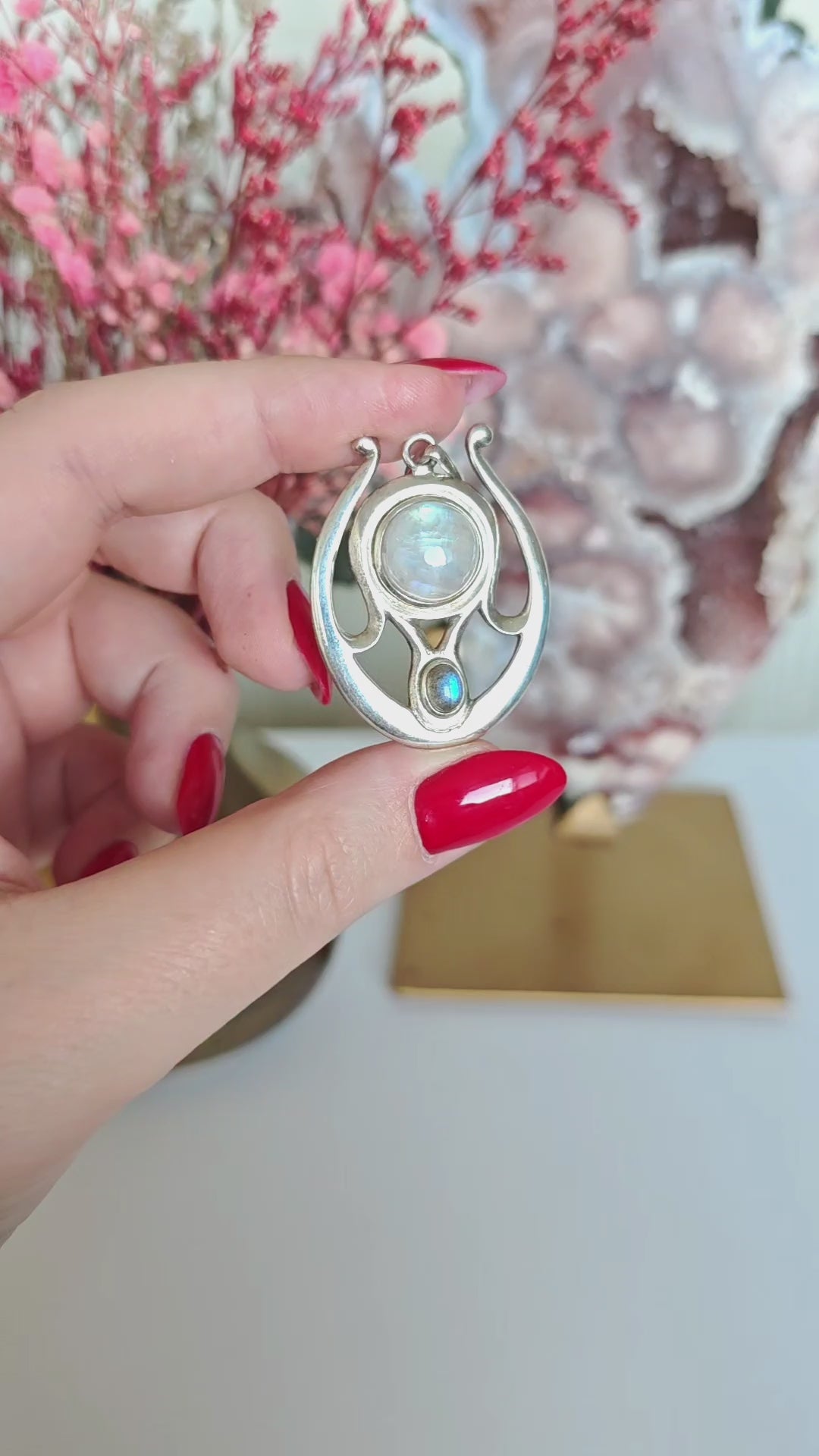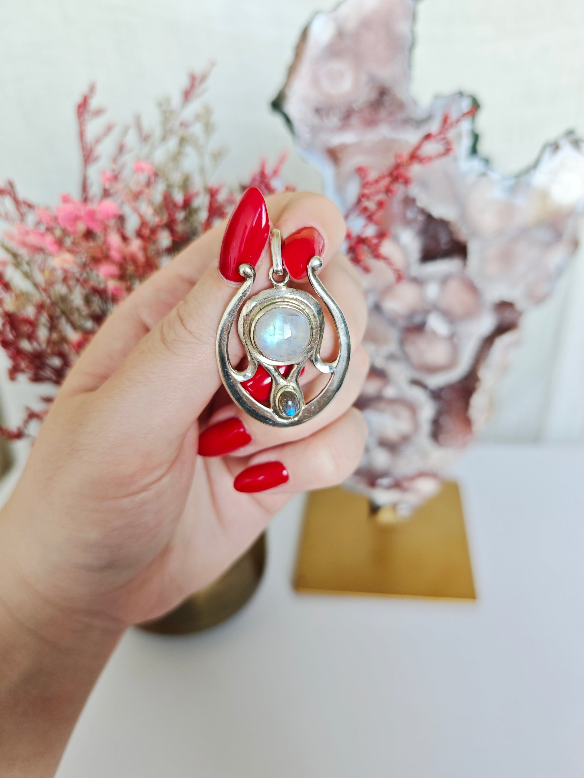 Dieses Unikat wurde mit viel Sorgfalt und Liebe ausgesucht und verweilt wartend auf seinen neuen Besitzer. Dieser Anhänger ist aus einem Mondstein und Labradorit gefertigt.  Die Öse ist aus 925 Silber.