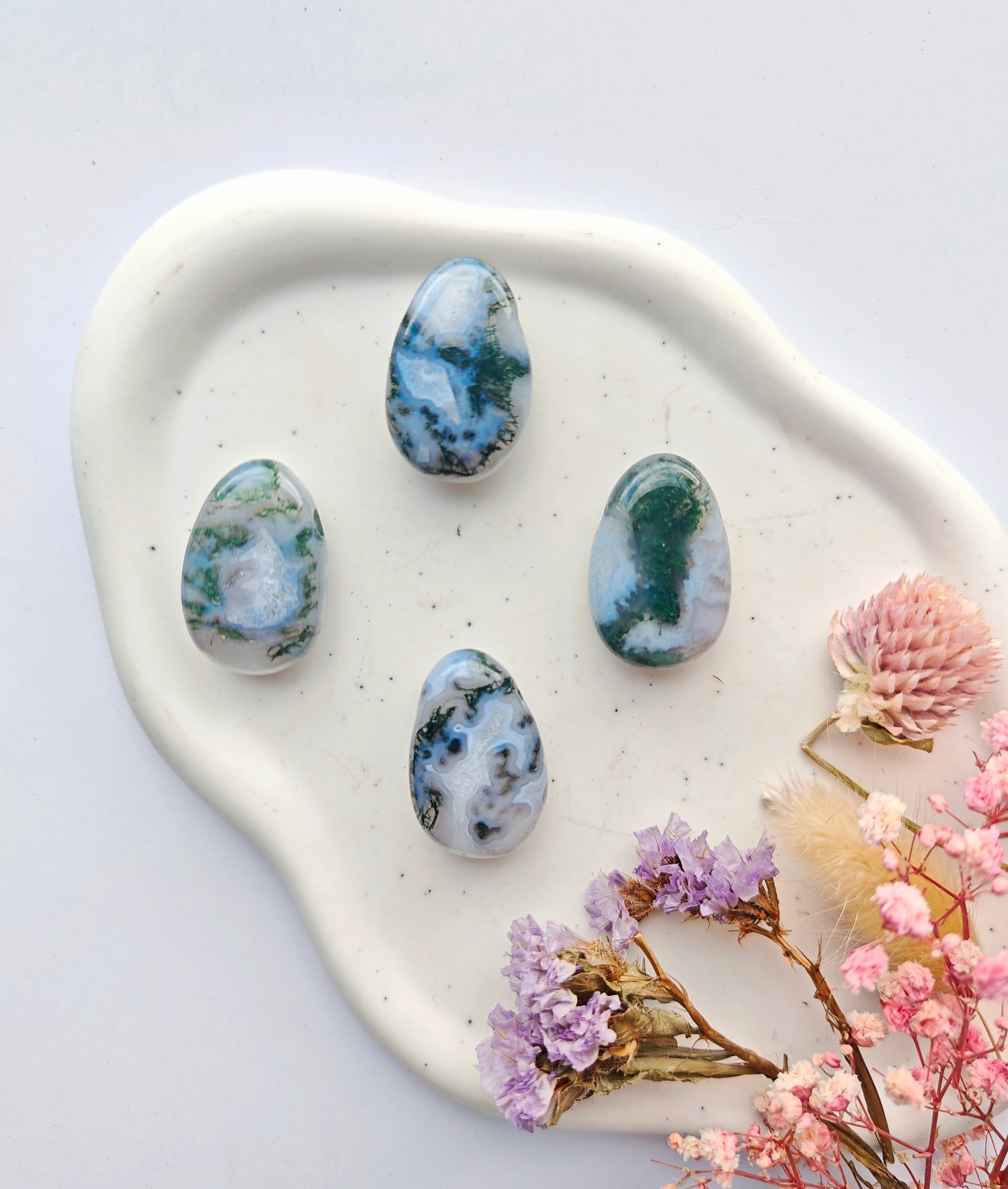 Jedes Unikat wurde mit viel Sorgfalt und Liebe ausgesucht und verweilt wartend auf seinen neuen Besitzer. Die Anhänger sind aus Moosachat gefertigt, welcher durch seine natürliche Struktur, Farbgebung und Energie einzigartig ist.