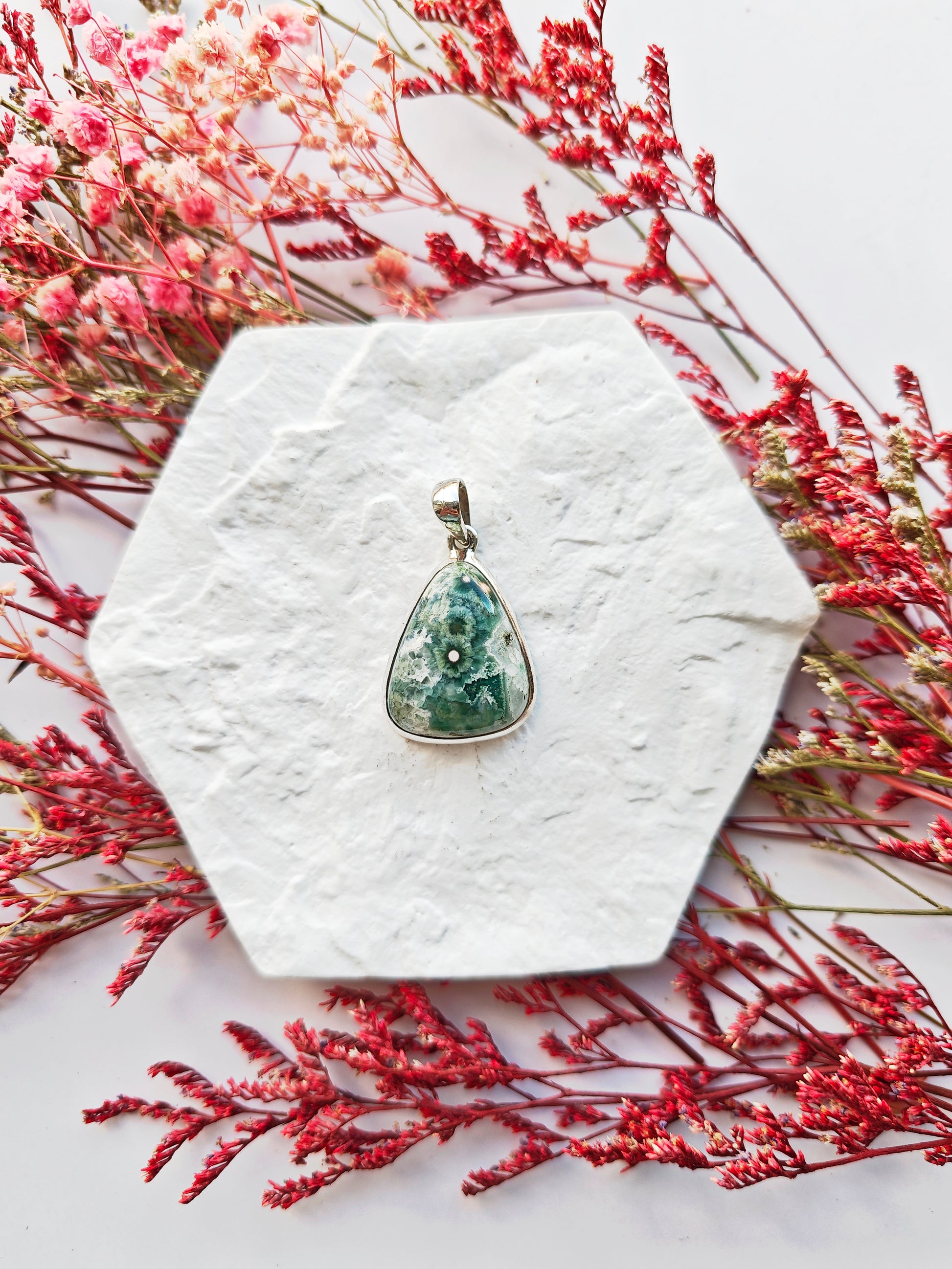 Dieses Unikat wurde mit viel Sorgfalt und Liebe ausgesucht und verweilt wartend auf seinen neuen Besitzer. Dieser Anhänger ist aus einem Old Stock Ozean Jaspis gefertigt.  Die Fassung ist aus 925 Silber.