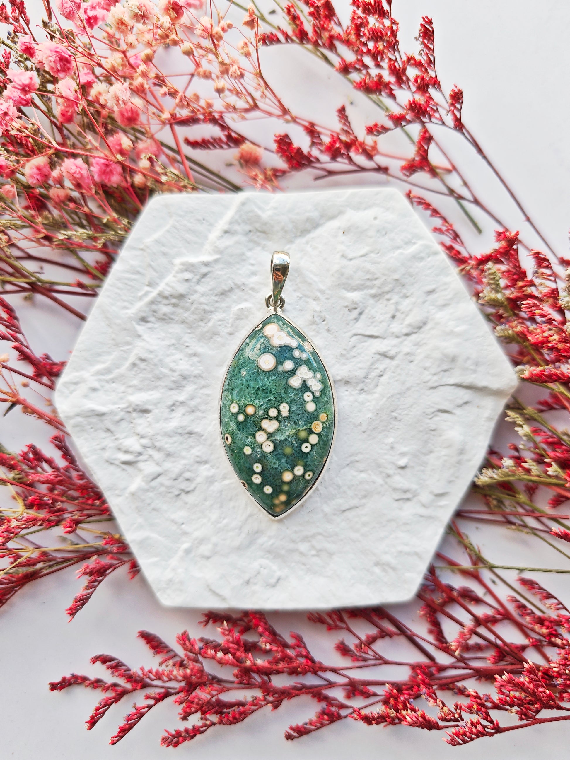 Dieses Unikat wurde mit viel Sorgfalt und Liebe ausgesucht und verweilt wartend auf seinen neuen Besitzer. Dieser Anhänger ist aus einem Old Stock Ozean Jaspis gefertigt. Die Fassung ist aus 925 Silber.