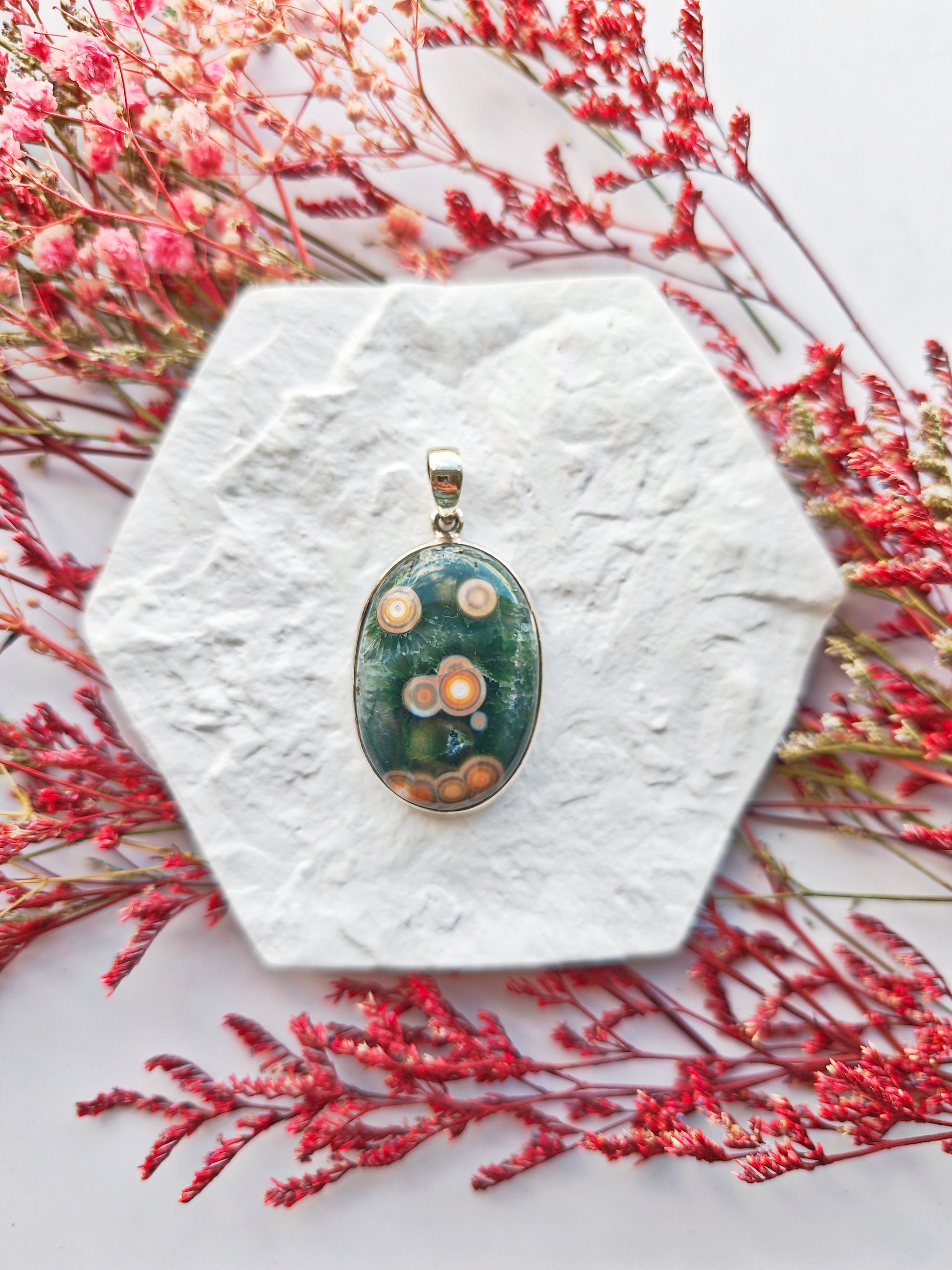 Dieses Unikat wurde mit viel Sorgfalt und Liebe ausgesucht und verweilt wartend auf seinen neuen Besitzer. Dieser Anhänger ist aus einem Old Stock Ozean Jaspis gefertigt.  Die Fassung ist aus 925 Silber.