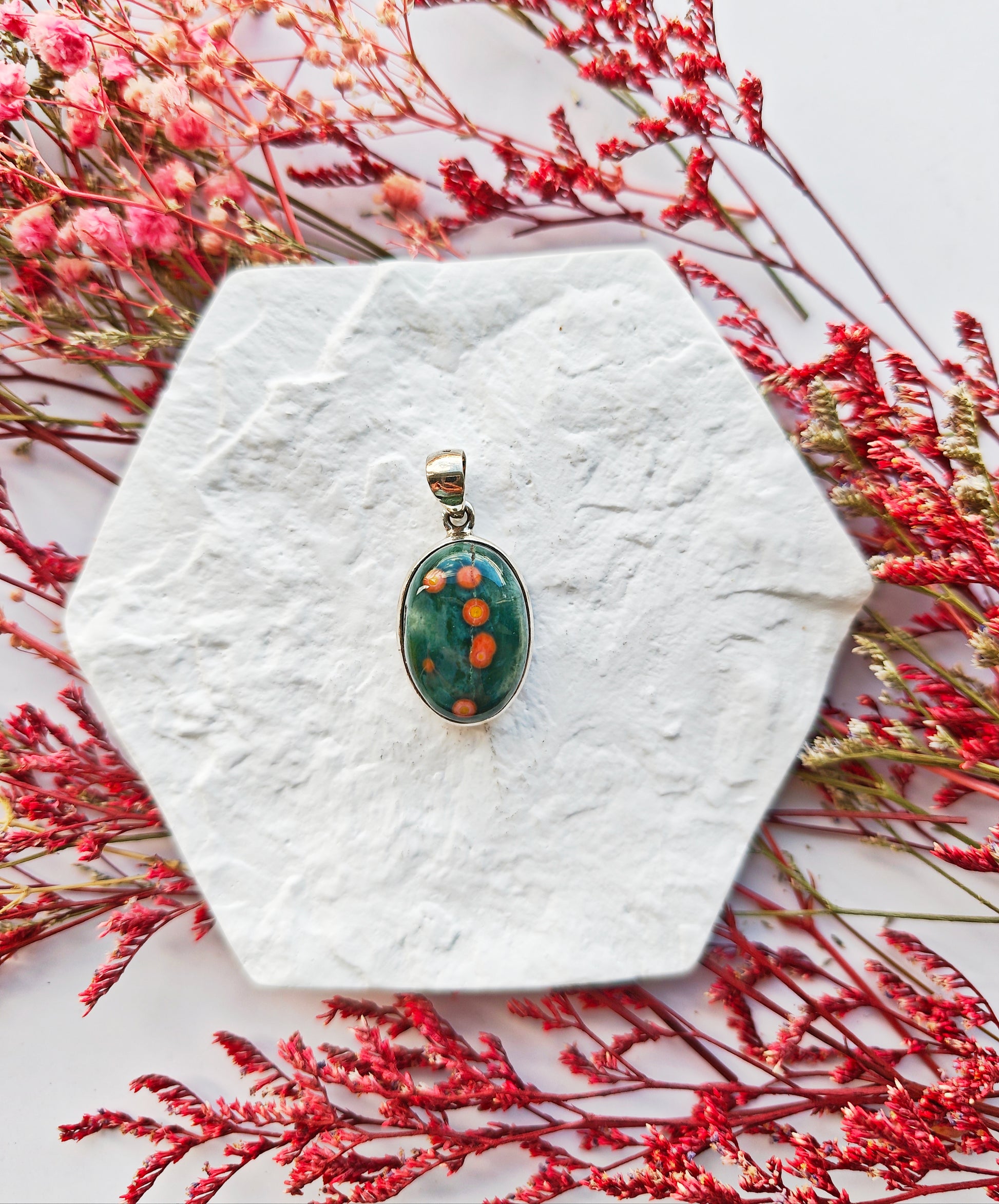 Dieses Unikat wurde mit viel Sorgfalt und Liebe ausgesucht und verweilt wartend auf seinen neuen Besitzer. Dieser Anhänger ist aus einem Old Stock Ozean Jaspis gefertigt.  Die Fassung ist aus 925 Silber.
