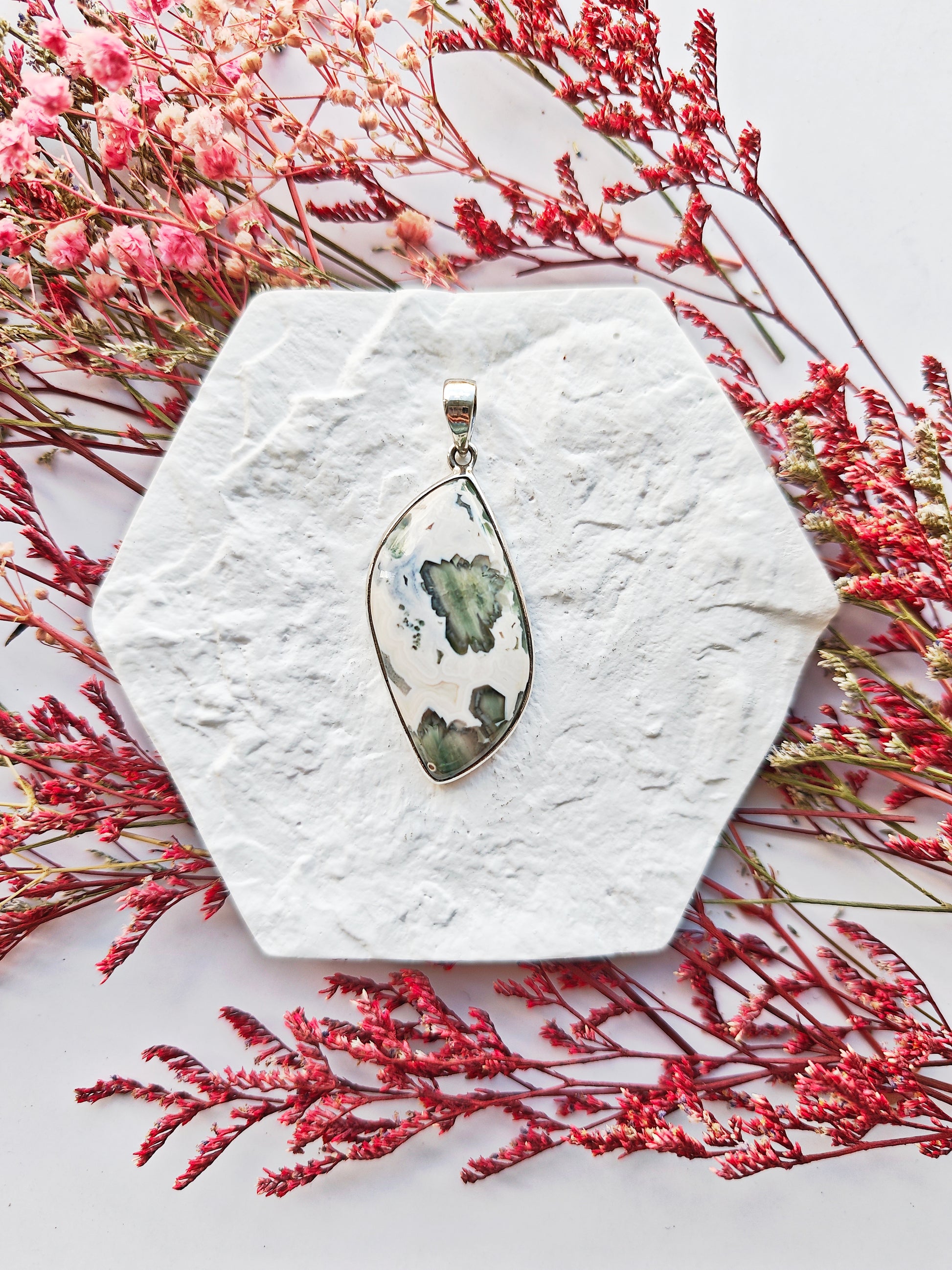 Dieses Unikat wurde mit viel Sorgfalt und Liebe ausgesucht und verweilt wartend auf seinen neuen Besitzer. Dieser Anhänger ist aus einem Old Stock Ozean Jaspis gefertigt.  Die Fassung ist aus 925 Silber.