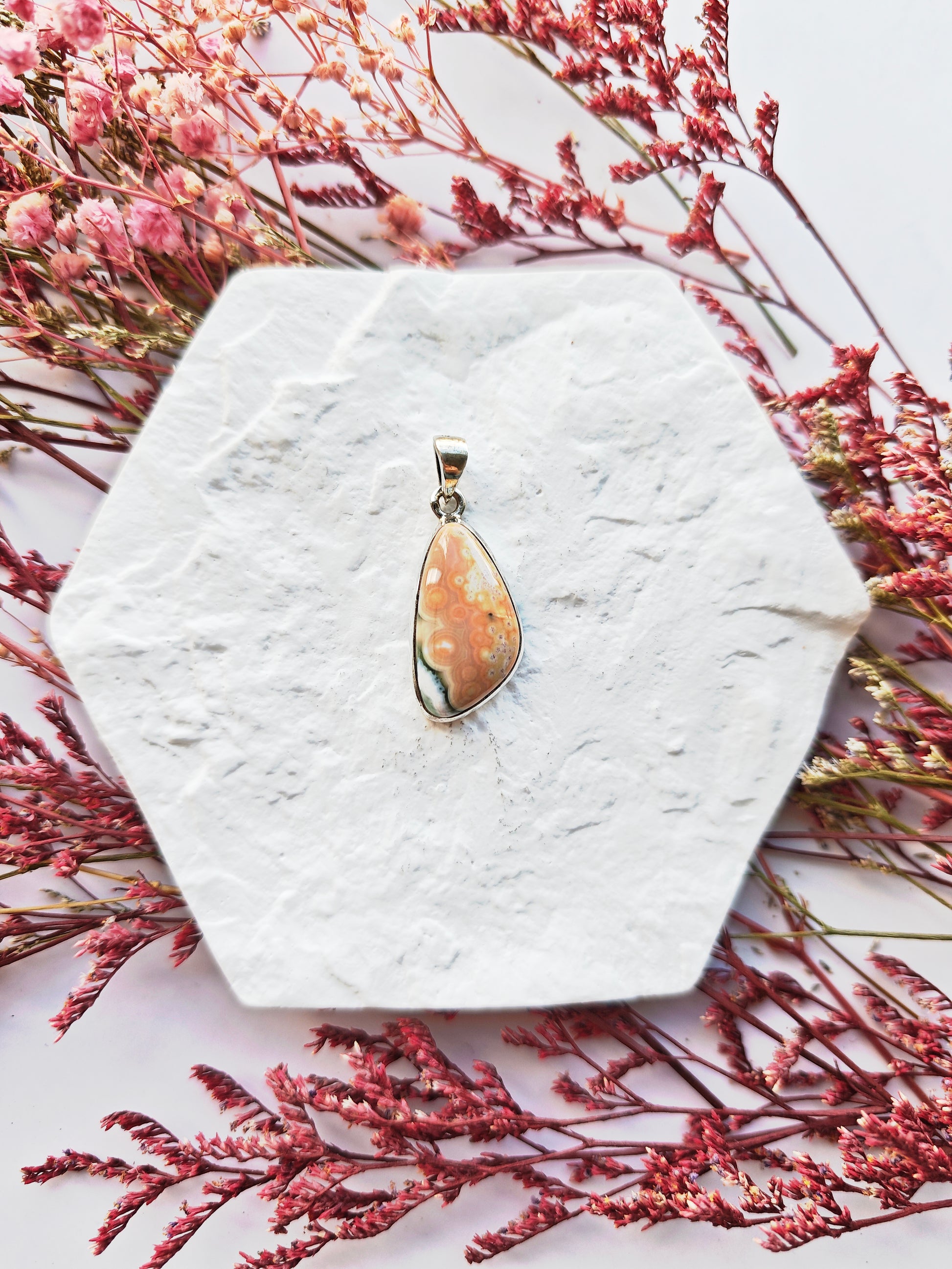 Dieses Unikat wurde mit viel Sorgfalt und Liebe ausgesucht und verweilt wartend auf seinen neuen Besitzer. Dieser Anhänger ist aus einem Old Stock Ozean Jaspis gefertigt. Die Fassung ist aus 925 Silber.