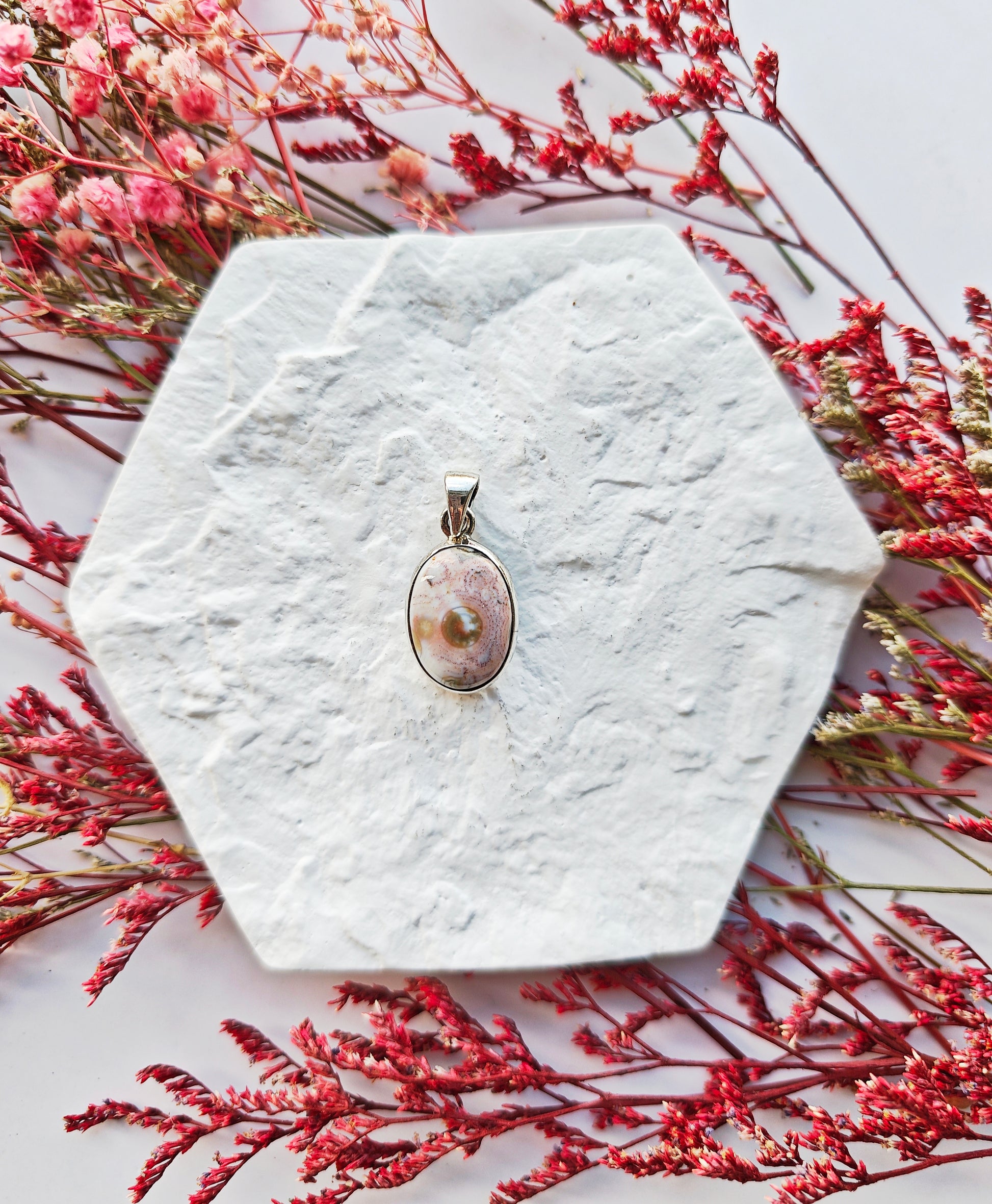 Dieses Unikat wurde mit viel Sorgfalt und Liebe ausgesucht und verweilt wartend auf seinen neuen Besitzer. Dieser Anhänger ist aus einem Old Stock Ozean Jaspis gefertigt.  Die Fassung ist aus 925 Silber.