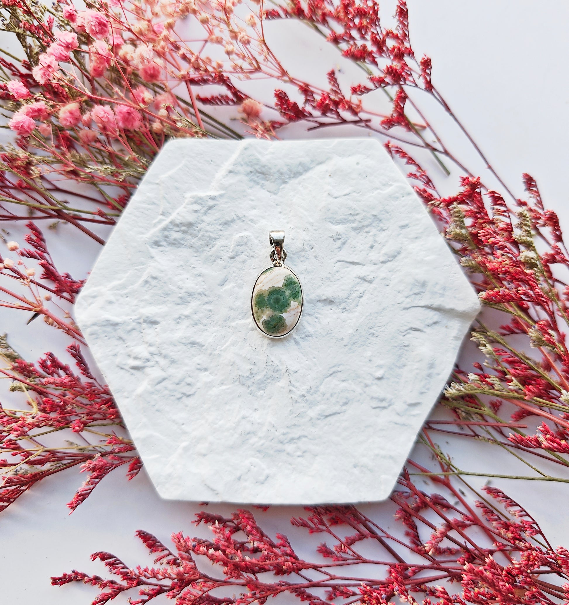 Dieses Unikat wurde mit viel Sorgfalt und Liebe ausgesucht und verweilt wartend auf seinen neuen Besitzer. Dieser Anhänger ist aus einem Old Stock Ozean Jaspis gefertigt.  Die Fassung ist aus 925 Silber.