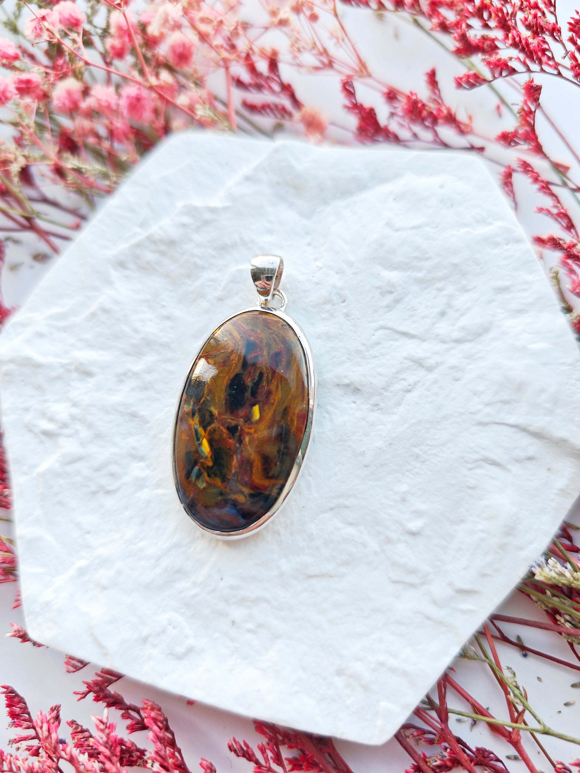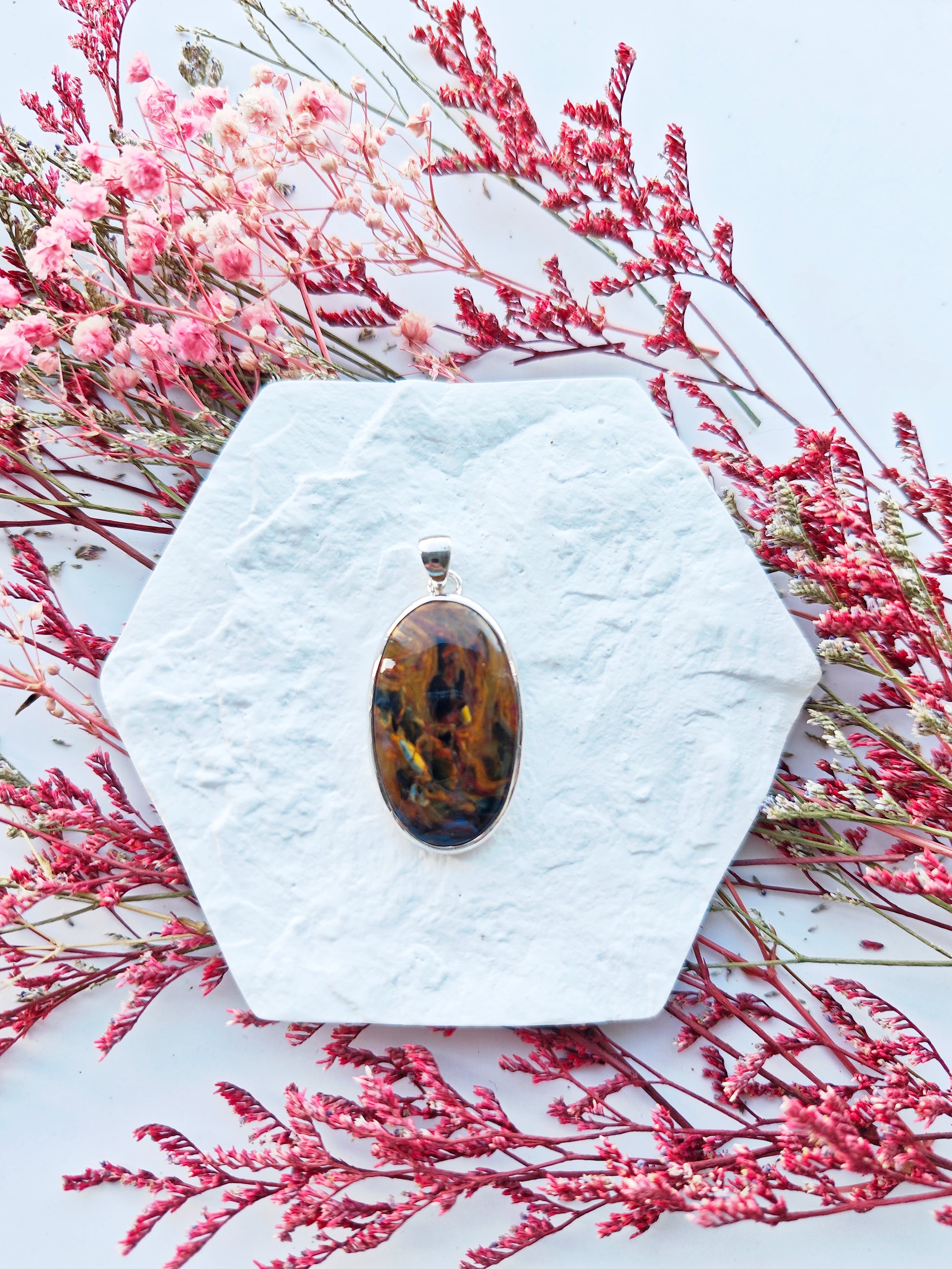 Dieses Unikat wurde mit viel Sorgfalt und Liebe ausgesucht und verweilt wartend auf seinen neuen Besitzer. Dieser Anhänger ist aus einem Pietersit gefertigt.  Die Öse ist aus 925 Silber.