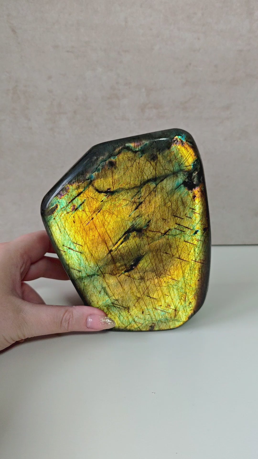 Dieser außergewöhnliche Regenbogen-Labradorit gehören zu den seltensten und farbintensivsten Qualitäten, die derzeit am Markt zu finden sind. Jedes Stück zeigt ein intensives Farbspiel aus Gold, Violett, Blau, Rosa, Silber und Orange.