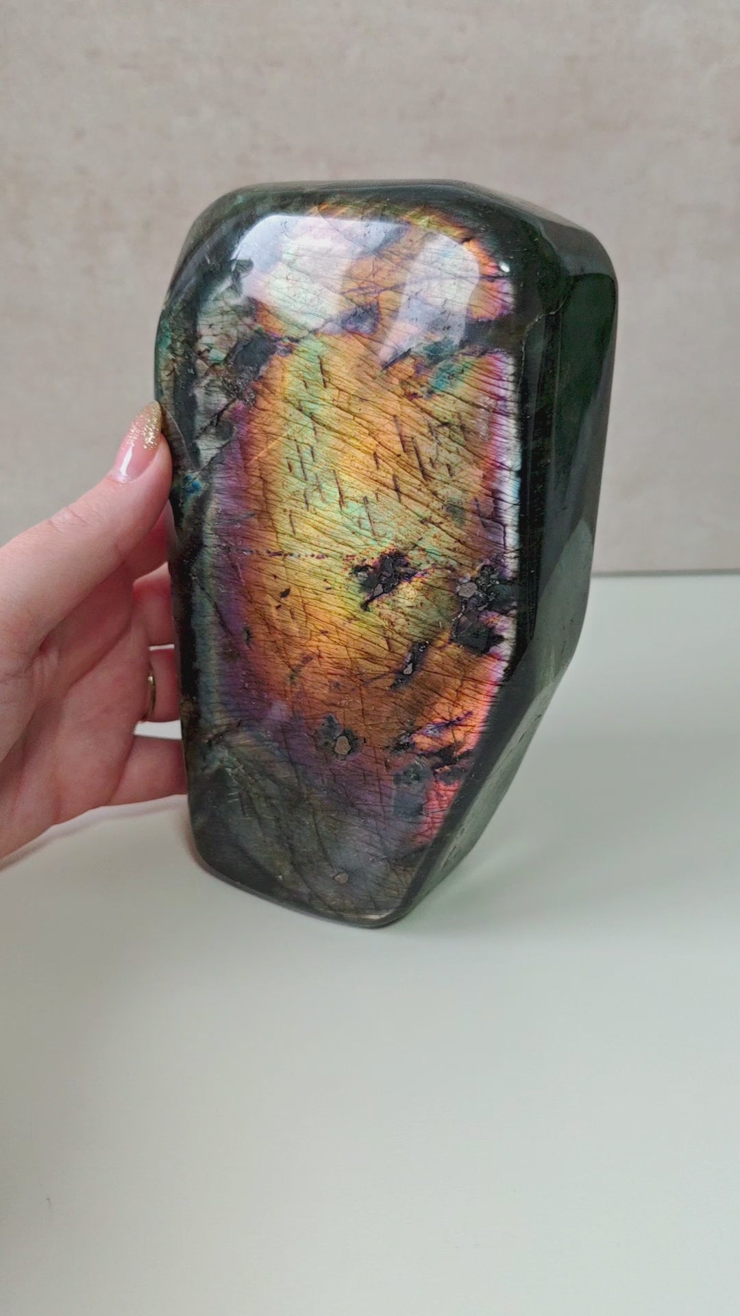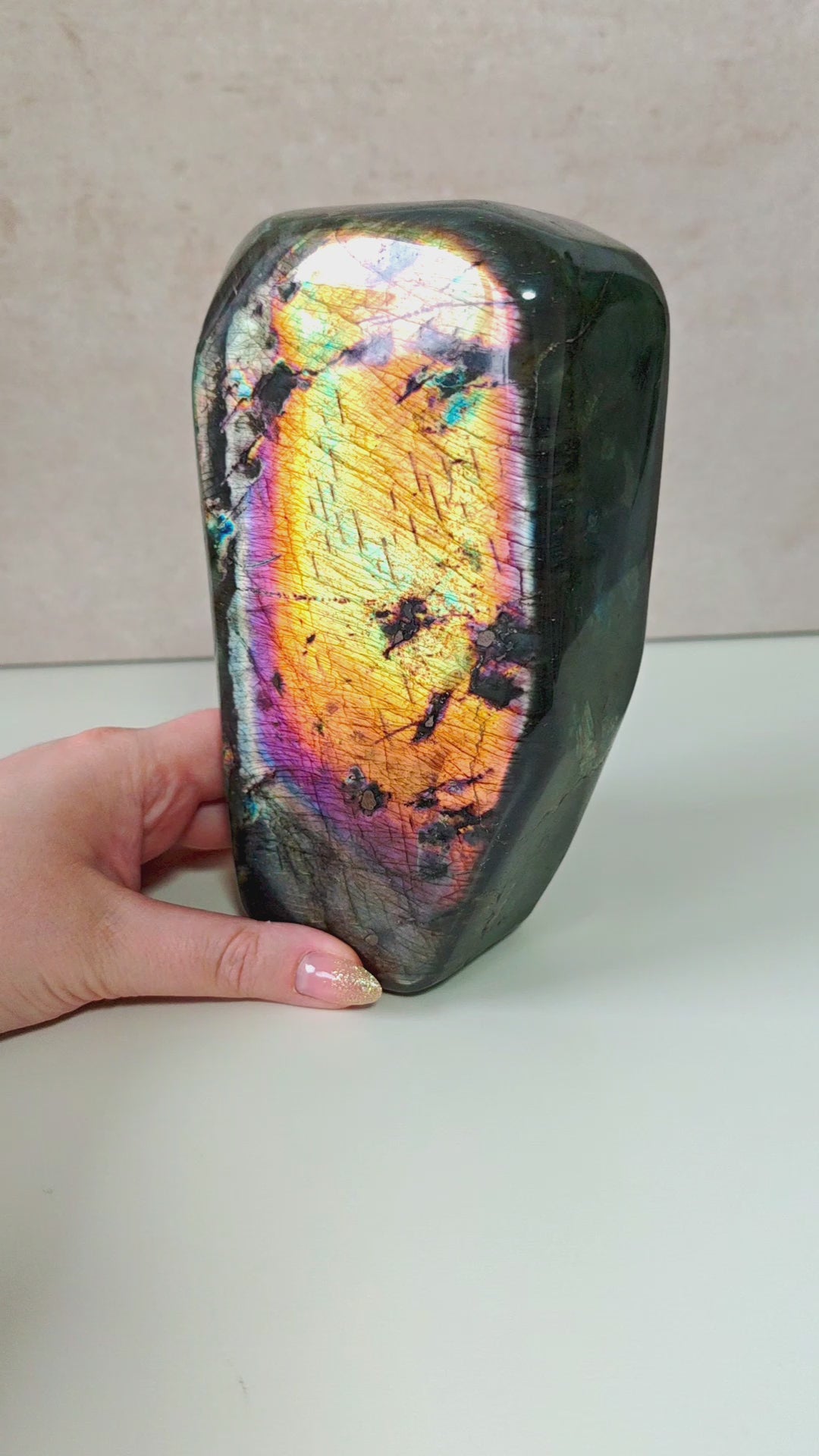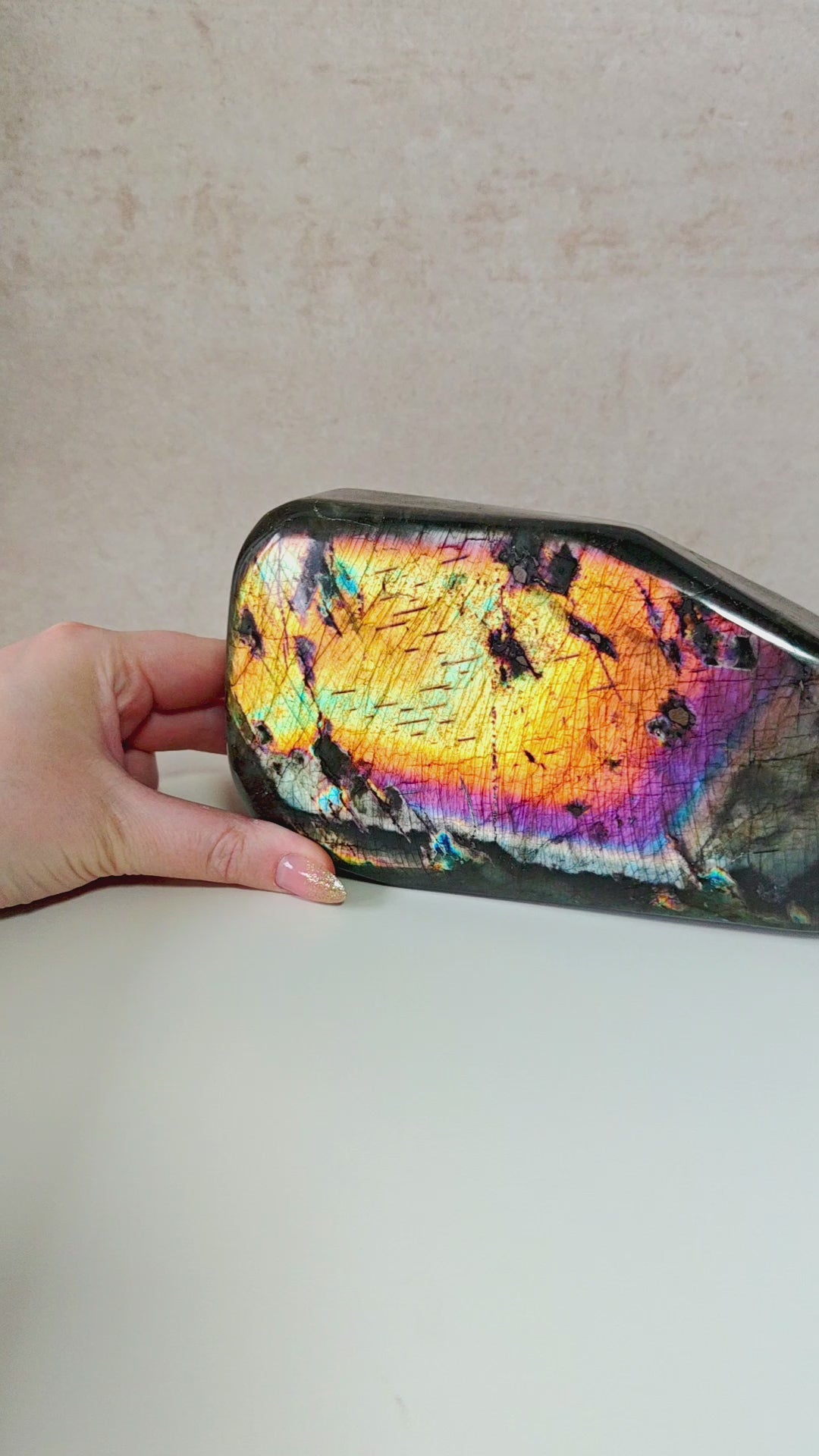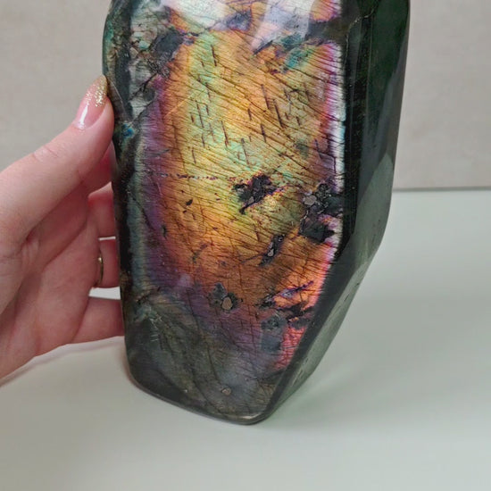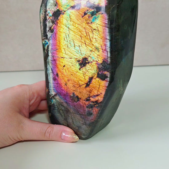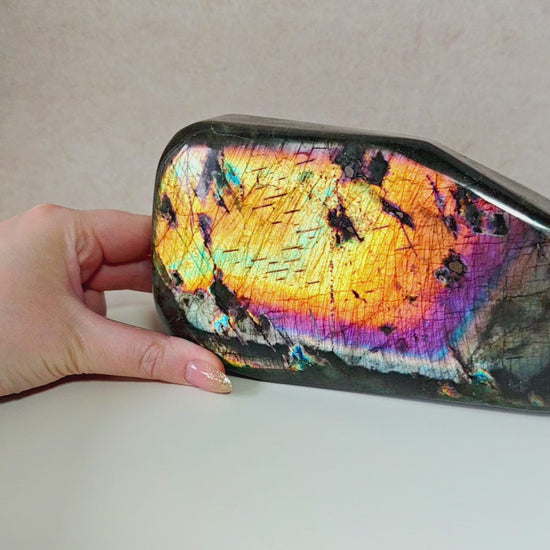 Dieser außergewöhnliche Regenbogen-Labradorit gehören zu den seltensten und farbintensivsten Qualitäten, die derzeit am Markt zu finden sind. Jedes Stück zeigt ein intensives Farbspiel aus Gold, Violett, Blau, Rosa, Silber und Orange.