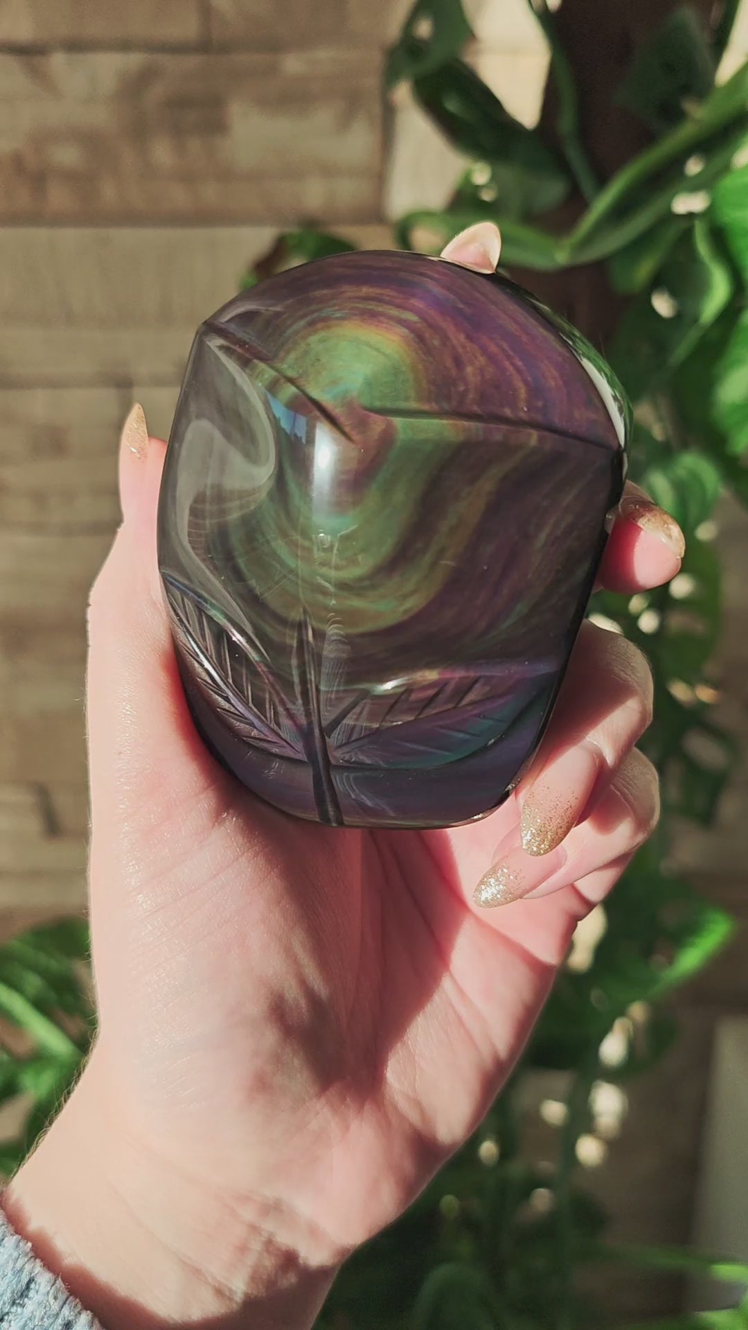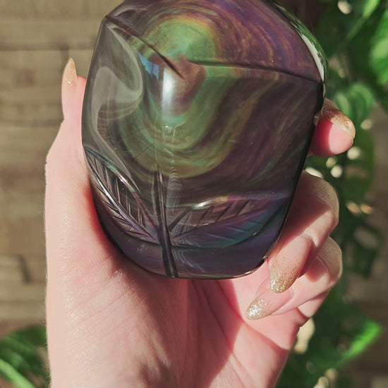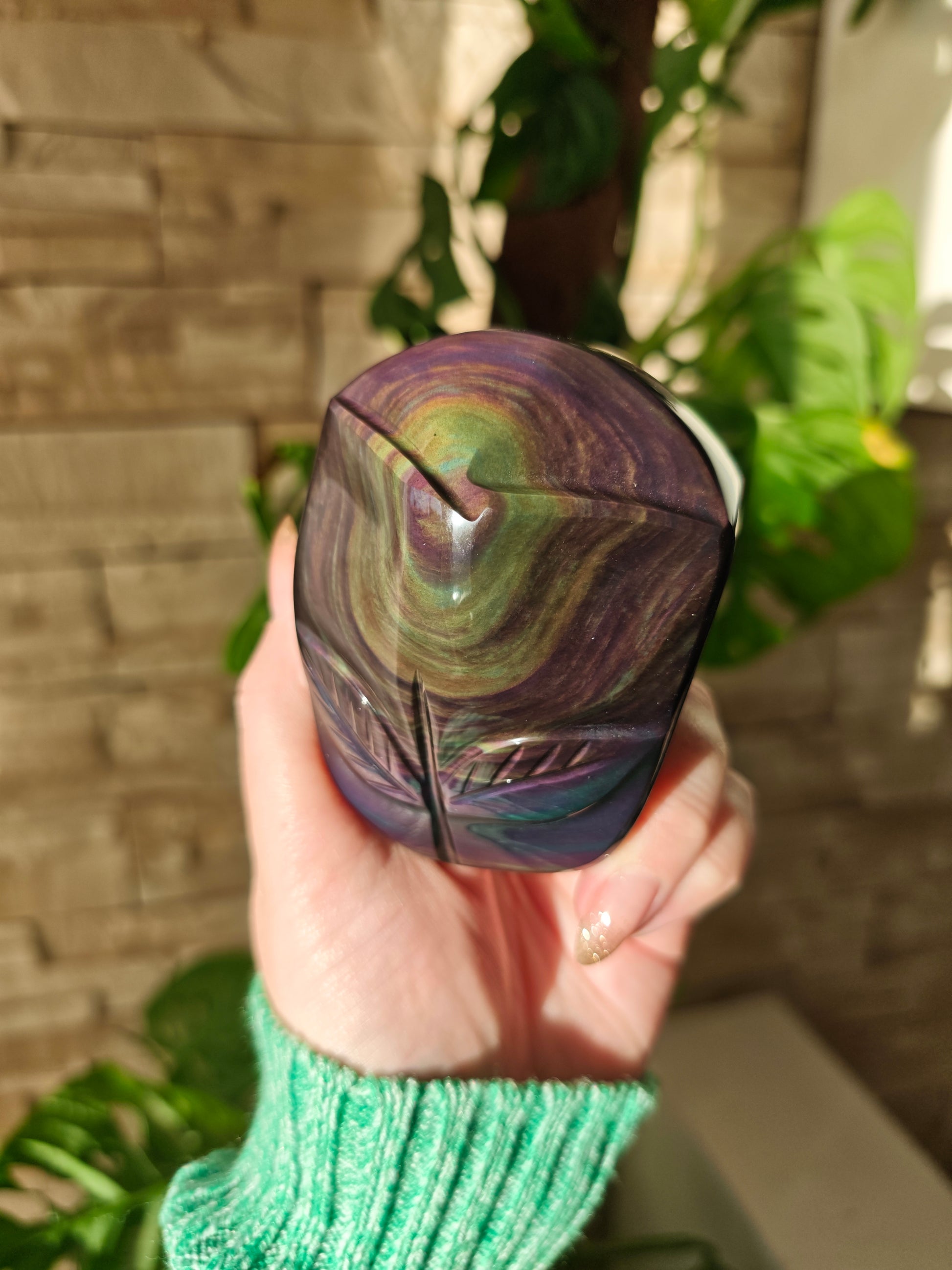 Velvet Regenbogen-Obsidian ist eine seltene und besonders geschätzte Variante des Regenbogen-Obsidians. Sein typisches Merkmal ist ein weiches, samtartiges Farbspiel, das sich nicht in klaren Bändern zeigt, sondern wie ein feiner, schimmernder Schleier über die Oberfläche fließt. Die Farben wirken tiefer, diffuser und harmonischer, als würde ein zarter Lichtfilm über dem Stein liegen. Dieser charakteristische „Velvet“-Effekt entsteht durch extrem feine, hochgleichmäßige Schichtungen im vulkanischen Glas, die das Licht sanfter brechen als bei anderen Obsidiansorten.