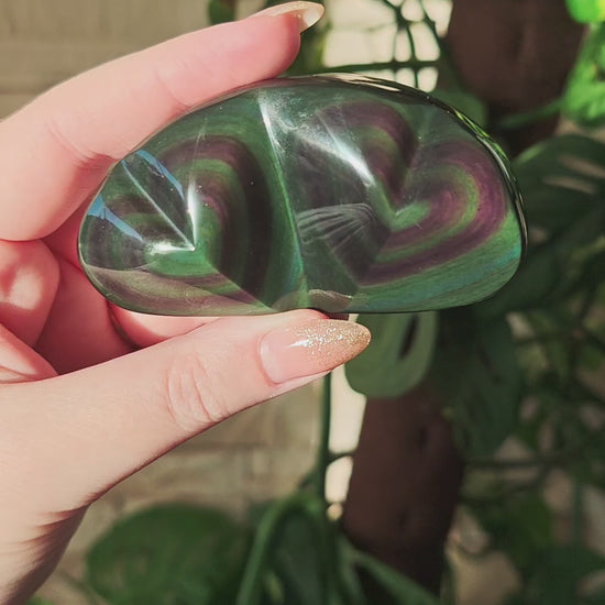 Velvet Regenbogen-Obsidian ist eine seltene und besonders geschätzte Variante des Regenbogen-Obsidians. Sein typisches Merkmal ist ein weiches, samtartiges Farbspiel, das sich nicht in klaren Bändern zeigt, sondern wie ein feiner, schimmernder Schleier über die Oberfläche fließt. Die Farben wirken tiefer, diffuser und harmonischer, als würde ein zarter Lichtfilm über dem Stein liegen. Dieser charakteristische „Velvet“-Effekt entsteht durch extrem feine, hochgleichmäßige Schichtungen im vulkanischen Glas, die das Licht sanfter brechen als bei anderen Obsidiansorten.