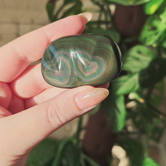 Regenbogen-Obsidian ist eine besondere Varietät des vulkanischen Glases, die ihren Namen den schimmernden Farbspielen verdankt, die bei Lichteinfall sichtbar werden. Der Grundton ist tiefschwarz, doch in polierter Form erscheinen konzentrische Bänder oder weiche Schichten aus Grün, Violett, Blau, Gold oder Rosé. Diese irisierenden Effekte entstehen durch mikroskopisch feine Mineraleinschlüsse und unterschiedliche Abkühlungsphasen im vulkanischen Gestein. Hochwertiger Regenbogen-Obsidian zeigt klare, deutlich abgegrenzte Farbzonen.