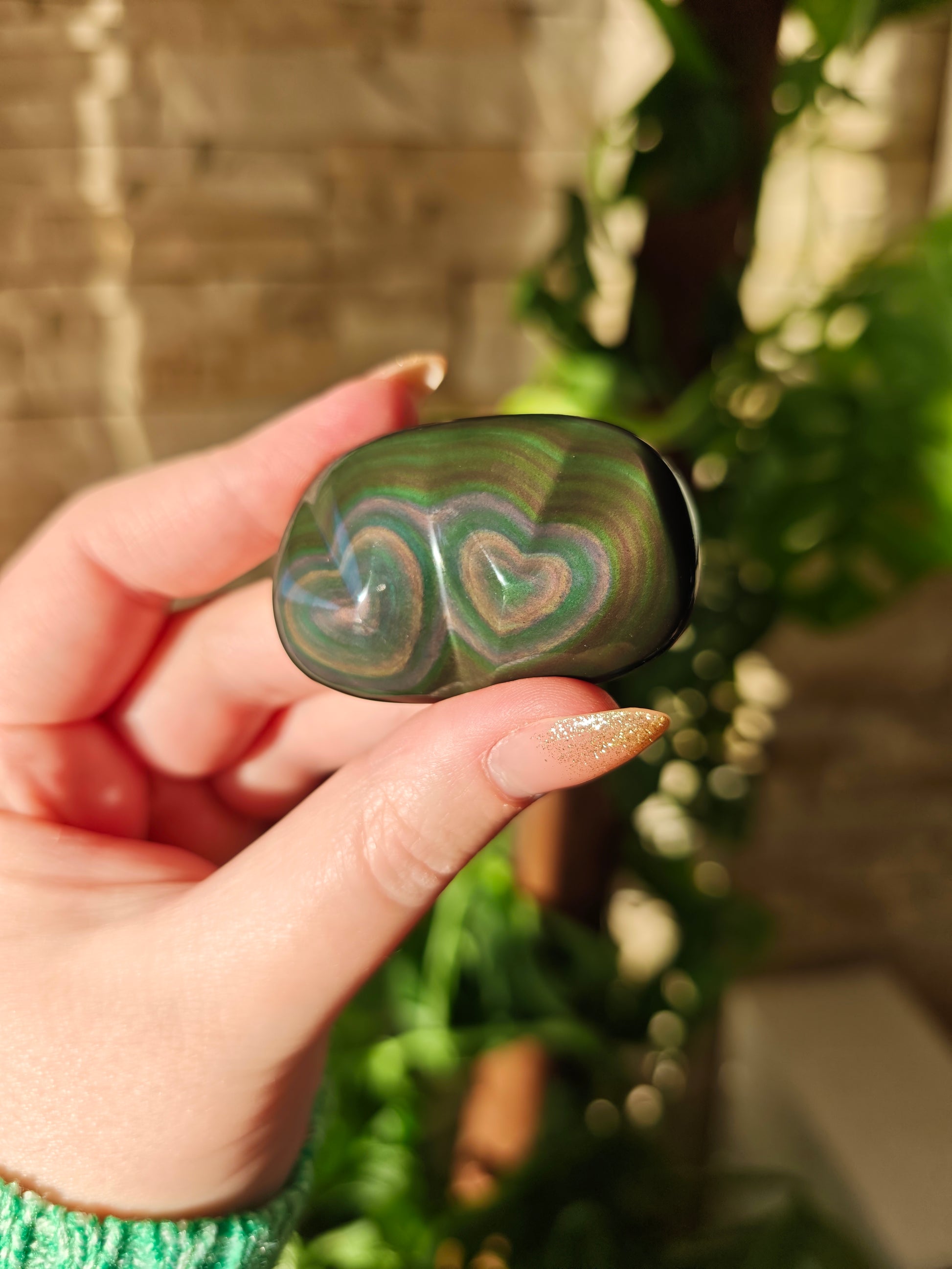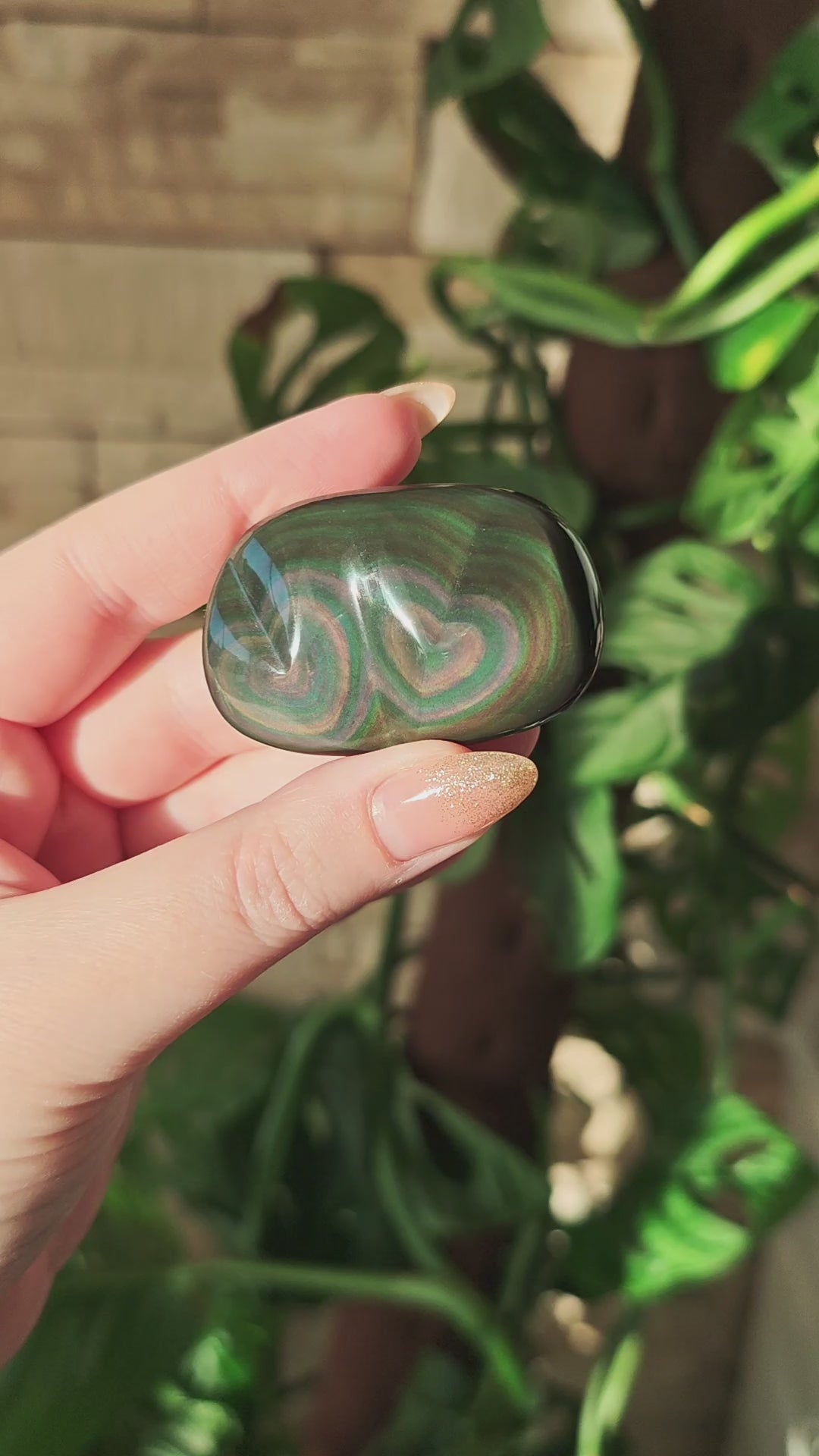 Velvet Regenbogen-Obsidian ist eine seltene und besonders geschätzte Variante des Regenbogen-Obsidians. Sein typisches Merkmal ist ein weiches, samtartiges Farbspiel, das sich nicht in klaren Bändern zeigt, sondern wie ein feiner, schimmernder Schleier über die Oberfläche fließt. Die Farben wirken tiefer, diffuser und harmonischer, als würde ein zarter Lichtfilm über dem Stein liegen. Dieser charakteristische „Velvet“-Effekt entsteht durch extrem feine, hochgleichmäßige Schichtungen im vulkanischen Glas, die das Licht sanfter brechen als bei anderen Obsidiansorten.