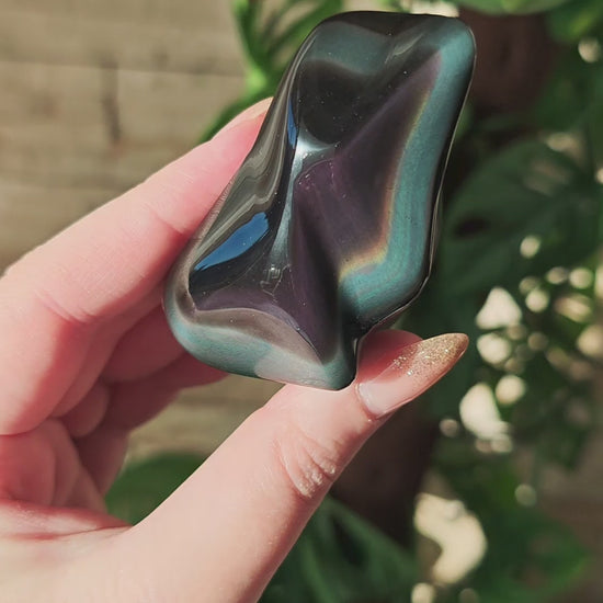 Velvet Regenbogen-Obsidian ist eine seltene und besonders geschätzte Variante des Regenbogen-Obsidians. Sein typisches Merkmal ist ein weiches, samtartiges Farbspiel, das sich nicht in klaren Bändern zeigt, sondern wie ein feiner, schimmernder Schleier über die Oberfläche fließt. Die Farben wirken tiefer, diffuser und harmonischer, als würde ein zarter Lichtfilm über dem Stein liegen. Dieser charakteristische „Velvet“-Effekt entsteht durch extrem feine, hochgleichmäßige Schichtungen im vulkanischen Glas, die das Licht sanfter brechen als bei anderen Obsidiansorten.