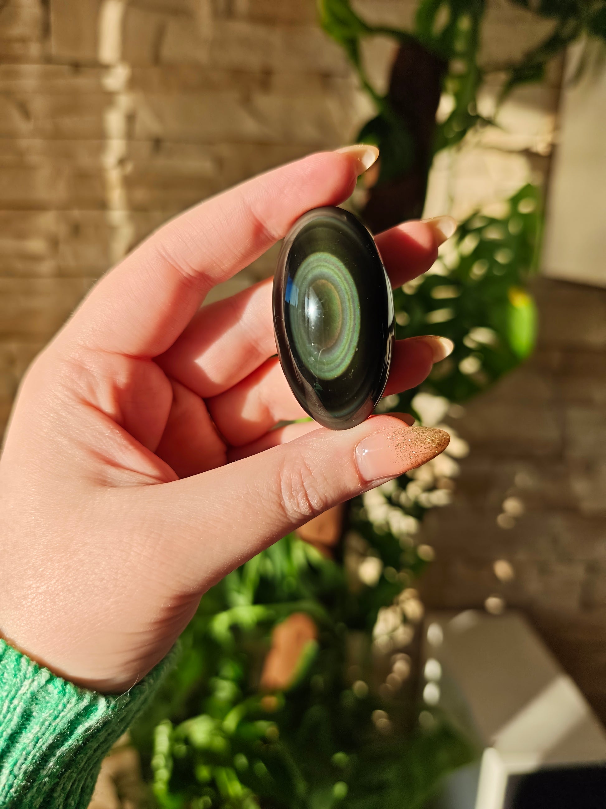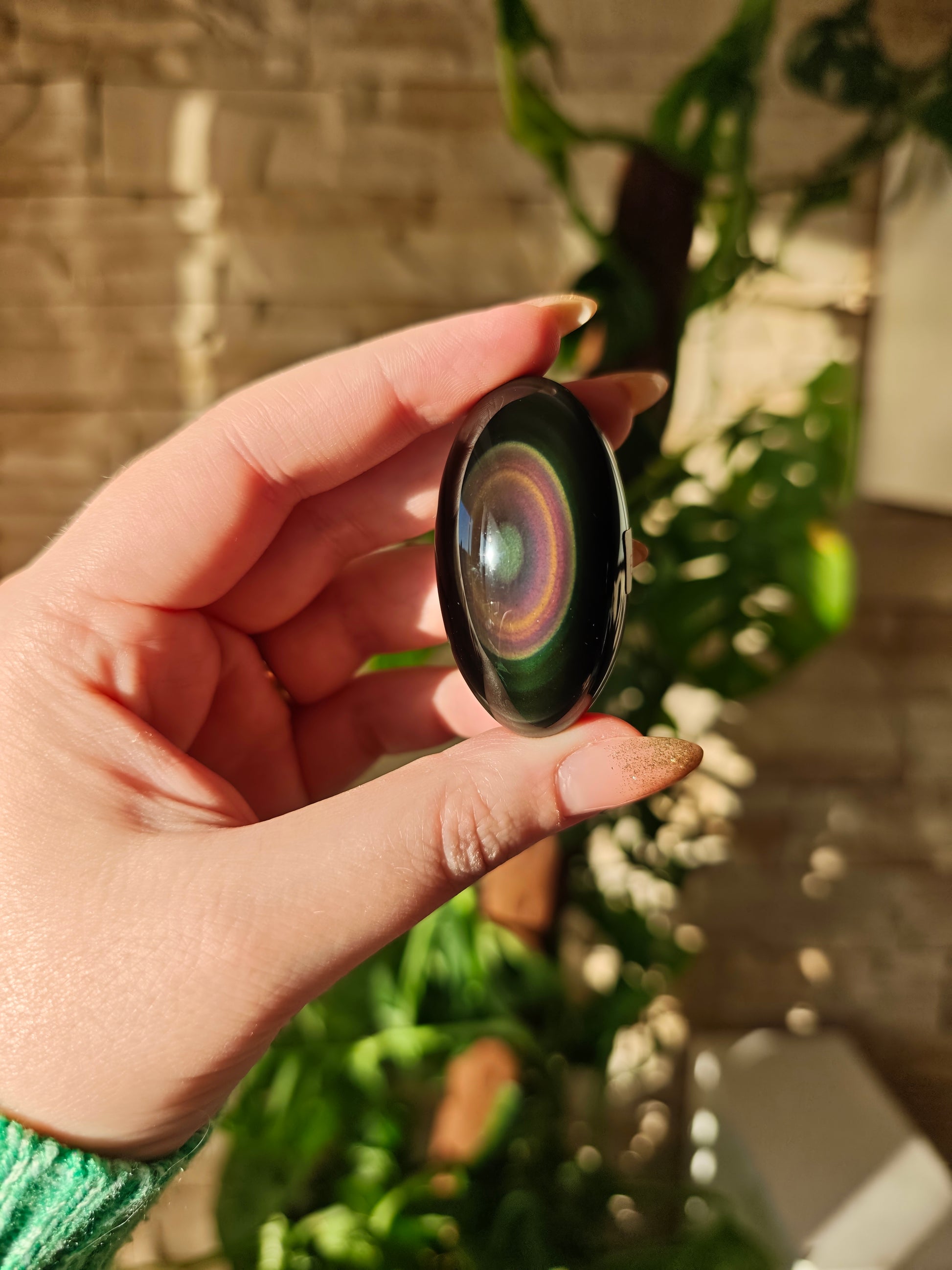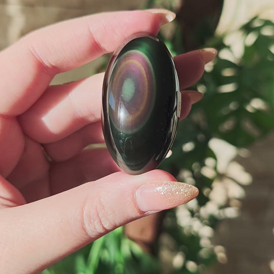 Regenbogen-Obsidian ist eine besondere Varietät des vulkanischen Glases, die ihren Namen den schimmernden Farbspielen verdankt, die bei Lichteinfall sichtbar werden. Der Grundton ist tiefschwarz, doch in polierter Form erscheinen konzentrische Bänder oder weiche Schichten aus Grün, Violett, Blau, Gold oder Rosé. Diese irisierenden Effekte entstehen durch mikroskopisch feine Mineraleinschlüsse und unterschiedliche Abkühlungsphasen im vulkanischen Gestein. Hochwertiger Regenbogen-Obsidian zeigt klare, deutlich abgegrenzte Farbzonen.