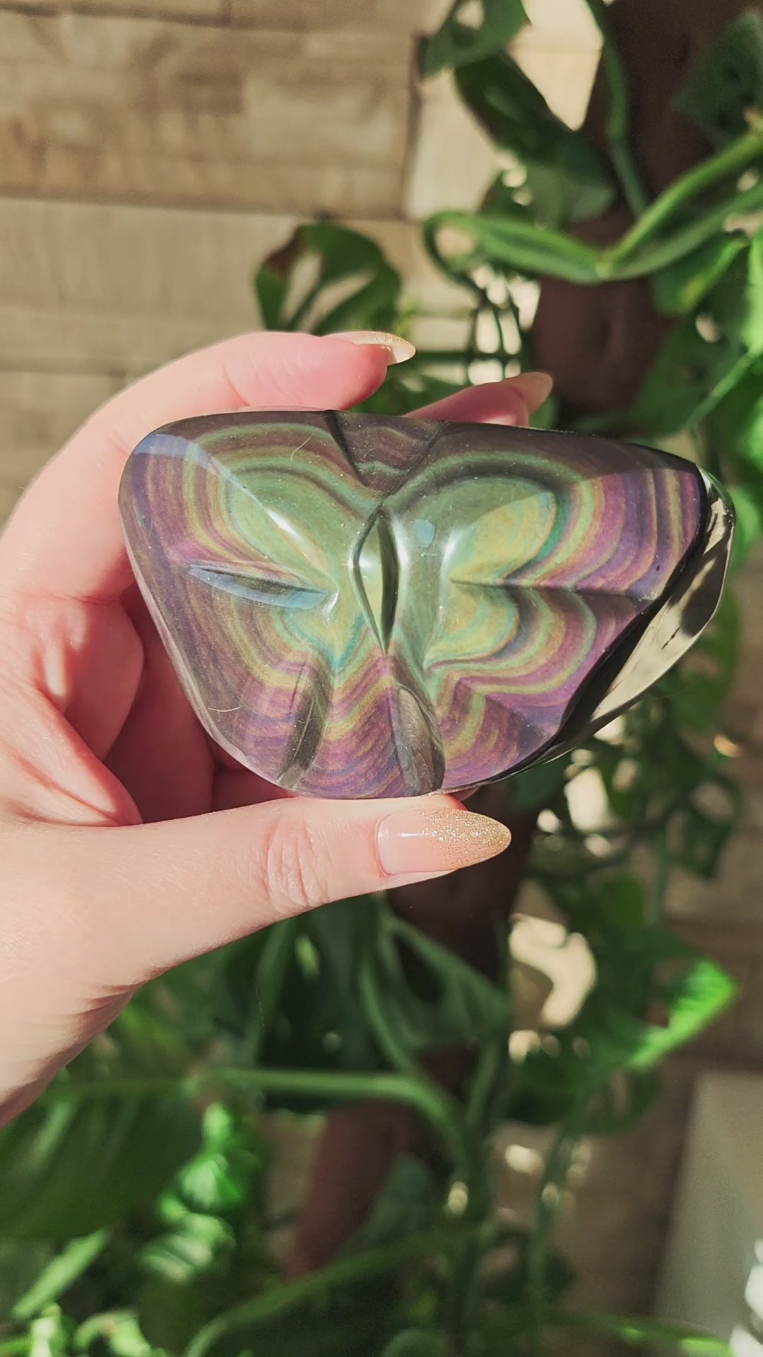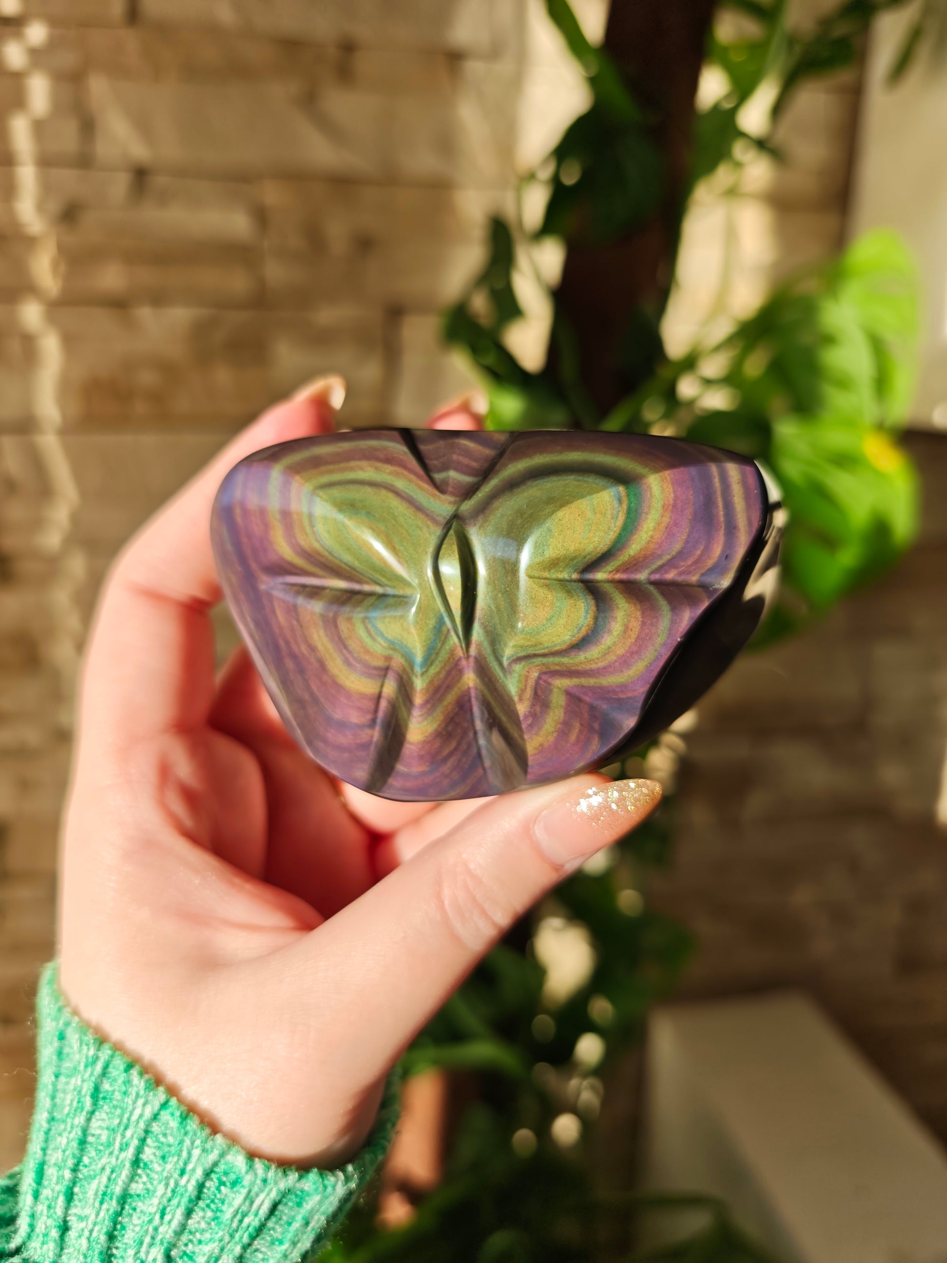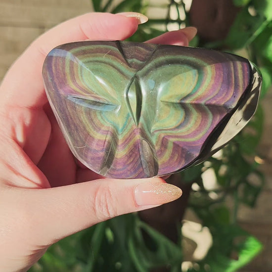 Velvet Regenbogen-Obsidian ist eine seltene und besonders geschätzte Variante des Regenbogen-Obsidians. Sein typisches Merkmal ist ein weiches, samtartiges Farbspiel, das sich nicht in klaren Bändern zeigt, sondern wie ein feiner, schimmernder Schleier über die Oberfläche fließt. Die Farben wirken tiefer, diffuser und harmonischer, als würde ein zarter Lichtfilm über dem Stein liegen. Dieser charakteristische „Velvet“-Effekt entsteht durch extrem feine, hochgleichmäßige Schichtungen im vulkanischen Glas, die das Licht sanfter brechen als bei anderen Obsidiansorten.