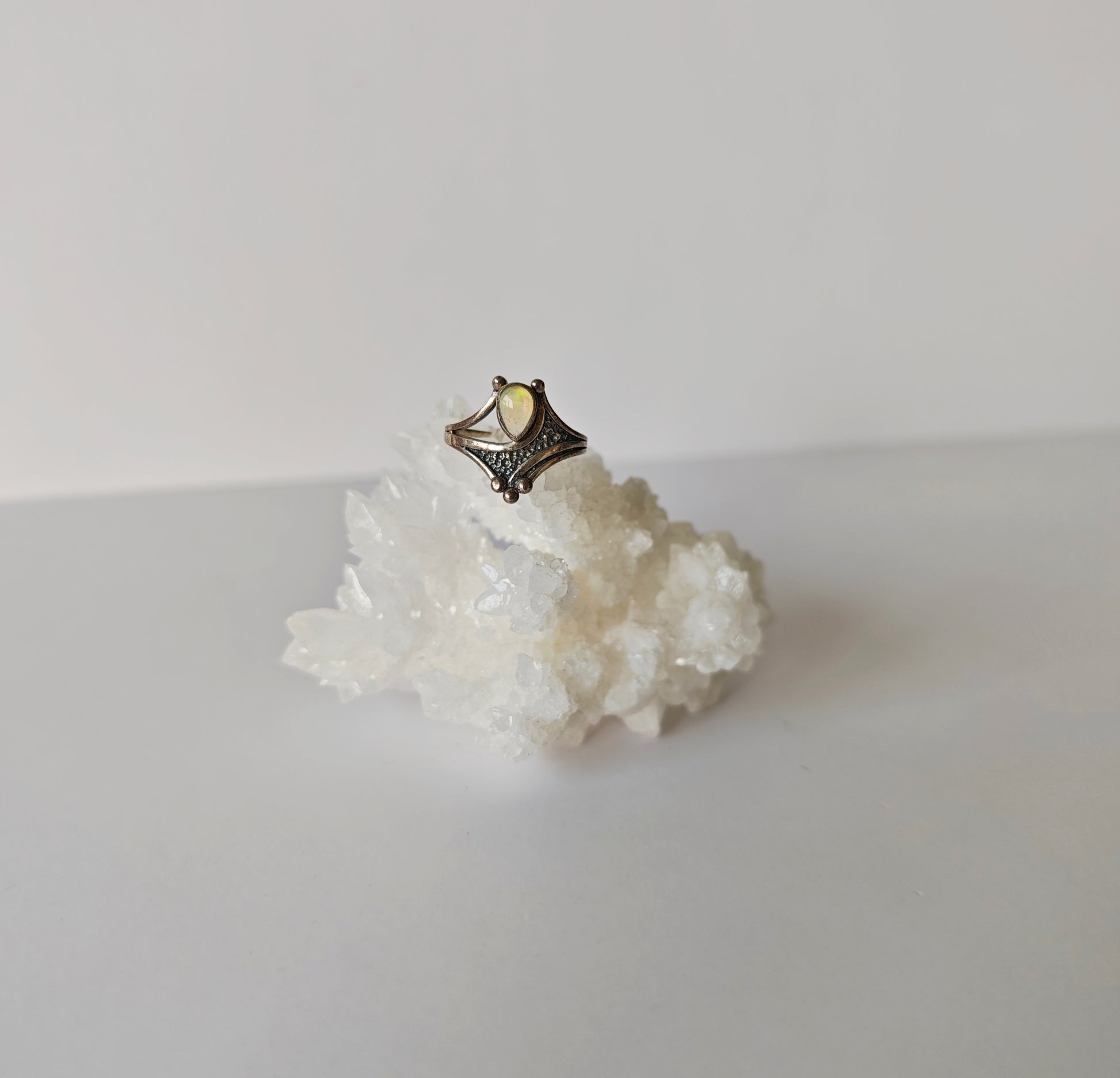 Im Zentrum jedes Rings erstrahlt ein natürlicher Opal, dessen irisierendes Farbspiel je nach Lichteinfall in sanften Grüntönen, warmem Gelb oder schimmerndem Orange leuchtet. Das detailreiche 925 Silber-Design mit feiner Ornamentik hebt die mystische Wirkung des Steins besonders hervor.