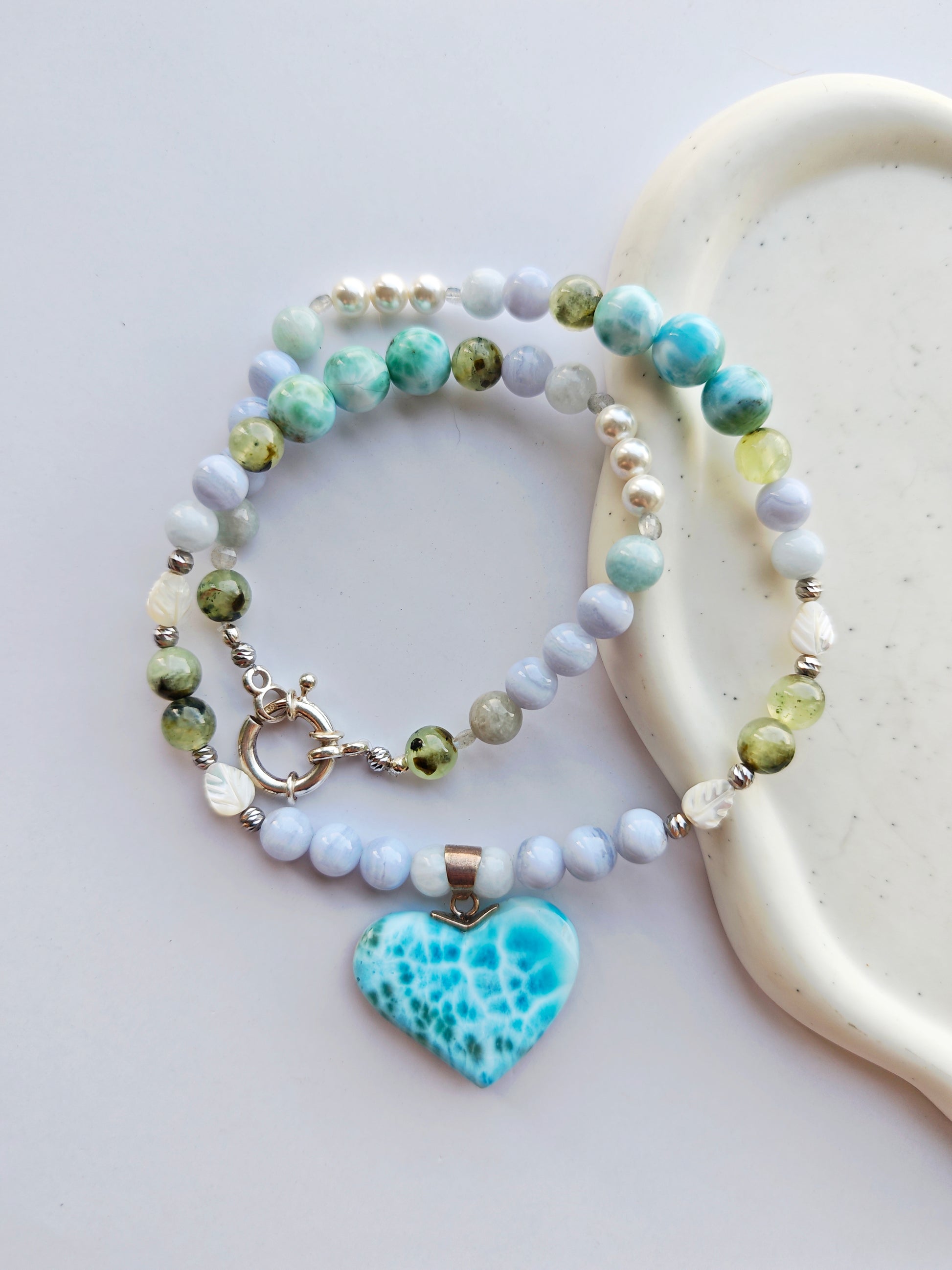 In der Kette ist Chalcedon, Blue Lace Achat, Larimar, Perle, Perlmutt, Labradorit und Prehnit verarbeitet. Die silbernen Elemente bestehen alle aus 925 Silber.